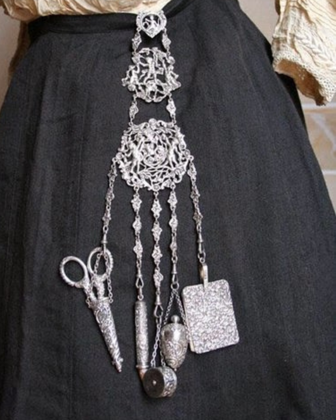 В те времена среди женщин не было принято носить большие сумки, а тем более сумки через плечо или рюкзаки. Максимум — небольшой ридикюль. Поэтому дамы подвешивали на пояс различные мелочи: косметику, духи, маникюрные ножницы, детские игрушки, целые наборы ключей… Шатлен был своего рода «мини-органайзером», который позволял оставаться элегантной и при этом иметь всё необходимое под рукой.