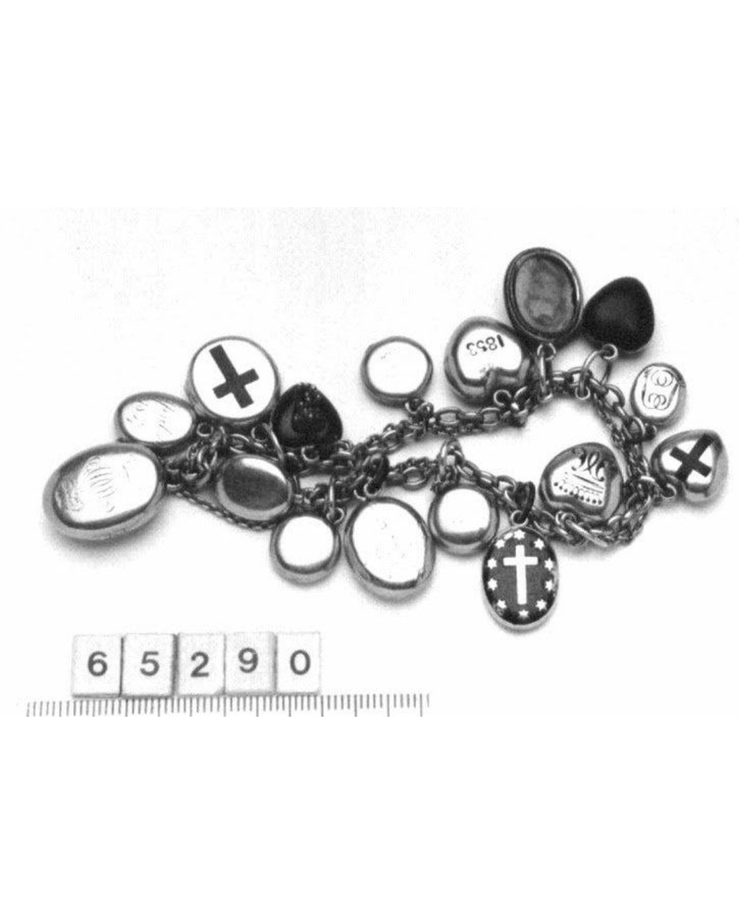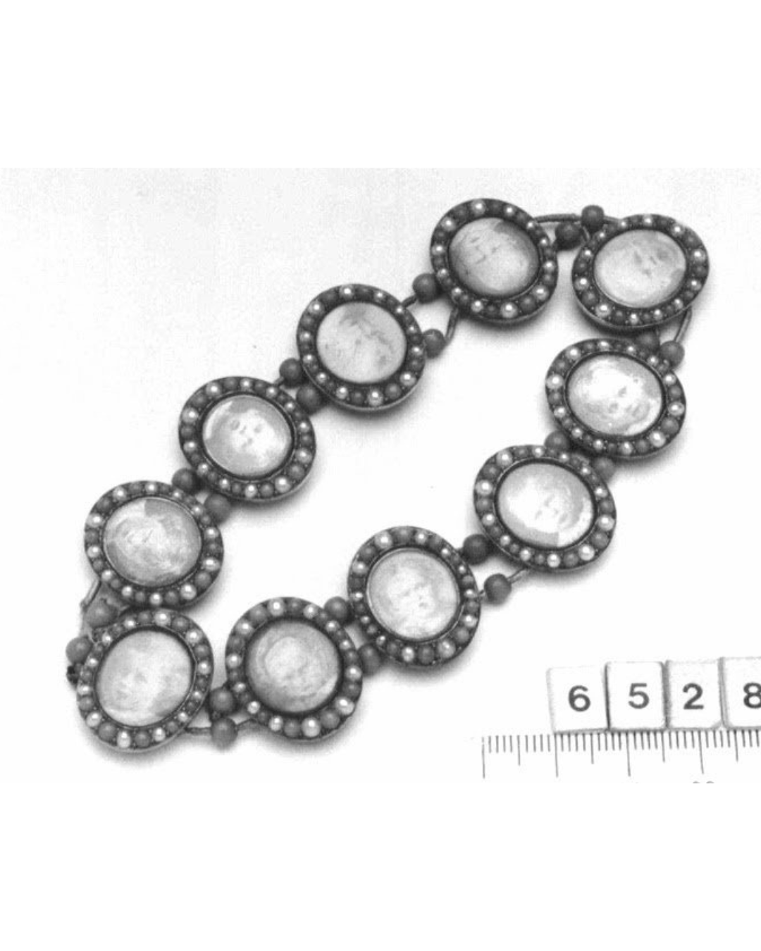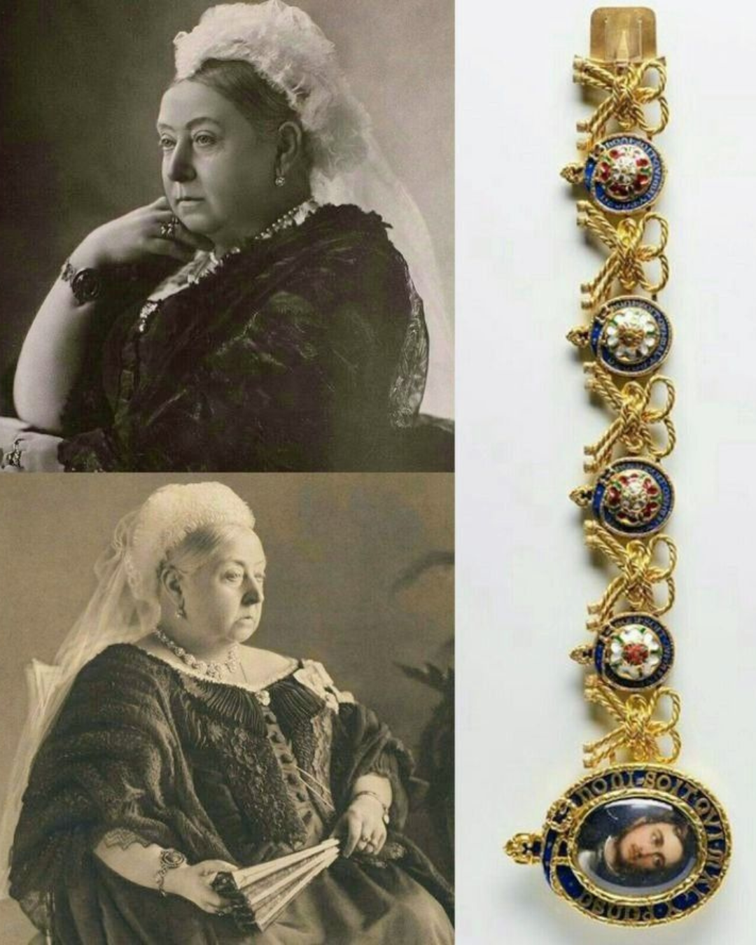 Одним из самых известных украшений был золотой браслет с шестнадцатью медальонами — овальными и сердцевидными, украшенными чёрной эмалью по золоту. Одни подвески были инкрустированы драгоценными камнями, другие — украшены надписями, гравировками и миниатюрными изображениями, включая крошечный портрет мужской головы. Королева носила этот браслет постоянно — он стал частью её образа и личной истории.