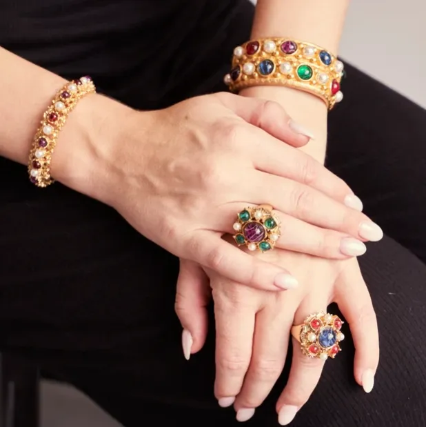 Что делает украшения Ben-Amun узнаваемыми с первого взгляда, — это редкое сочетание архитектурной формы и богатой фактуры материалов. В нью-йоркском Garment District мастера создают их вручную, используя 24-каратное золочение, чешское стекло и кристаллы, жемчуг Майорка, а также люсит и смелые текстурные комбинации. Каждое звено и вставка проработаны так, чтобы украшения оставались скульптурными, но лёгкими, драматичными, но женственными.