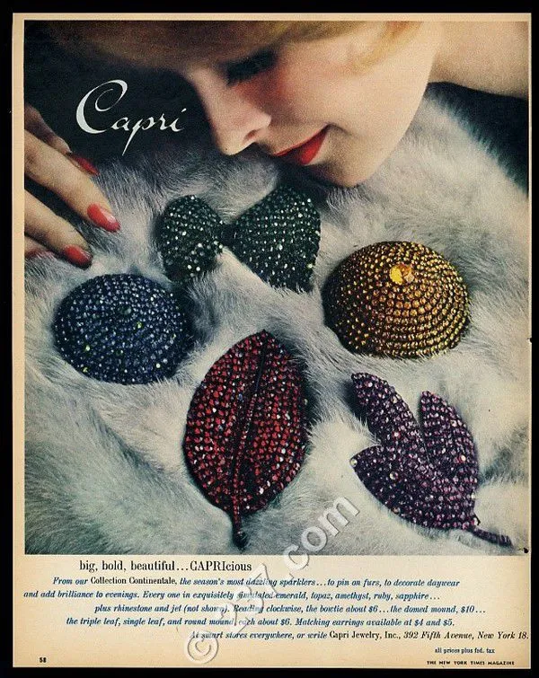 Основанная в 1952 году предпринимателем Солом Смитом в Нью-Йорке на легендарной Пятой Авеню, американская компания Capri Jewelry быстро завоевала репутацию создателя элитной бижутерии, выпуская коллекции небольшими тиражами с акцентом на исключительное качество. За время своего существования бренд пережил ключевые изменения: в 1960 году он поглотил ювелирную компанию DeNicola, известную среди ценителей винтажа, что расширило его дизайнерский потенциал. Также известно про сотрудничество с такими именитыми ателье, как Florenza, чьи мастера создавали украшения для Capri, используя мотивы Ренессанса и геральдики.