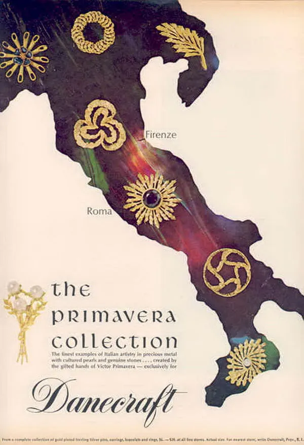 История DANECRAFT официально началась в 1934 году в Провиденсе (штат Род-Айленд), который называют «ювелирной столицей» США. Однако корни бренда уходят в Италию XVII века, где семья Примавера уже тогда славилась своими работами. Изначально компания носила название Felch & Co., но в 1945 году Виктор выкупил долю партнера Джеймса Фелча и переименовал бизнес в DANECRAFT. Это имя стало символом нового этапа — бренд начал выпуск не только ювелирных изделий, но и бижутерии, доступной широкой аудитории.
