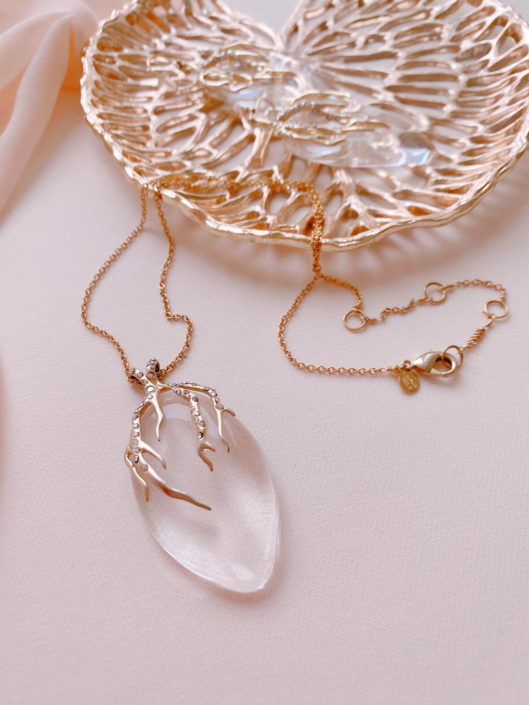 Пока ученые спорят, считать ли осадки в виде кристалликов льда туманом, Алексис Биттар придумал им блестящее применение. В коллекции с прозрачным люцитом россыпь сверкающих кристаллов подобна льдинкам в ясном морозном небе Арктики.Хрустальные вкрапления, утопленные в металле, смотрятся просто волшебно! И только необычные золотые веточки напоминают, что перед нами произведение ювелира, а не творение чародейки-природы.