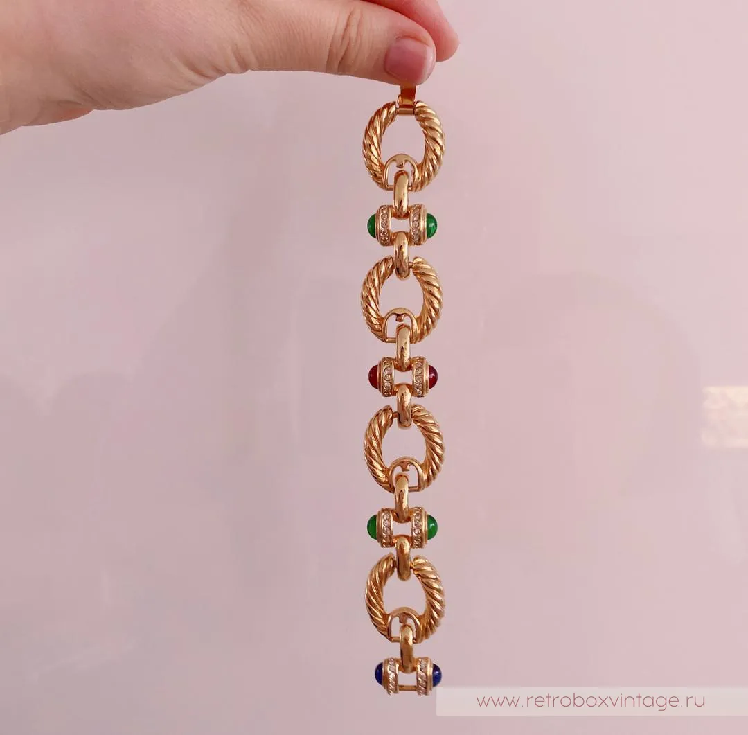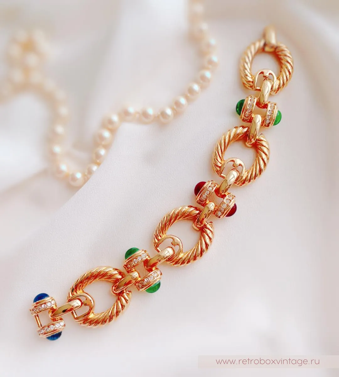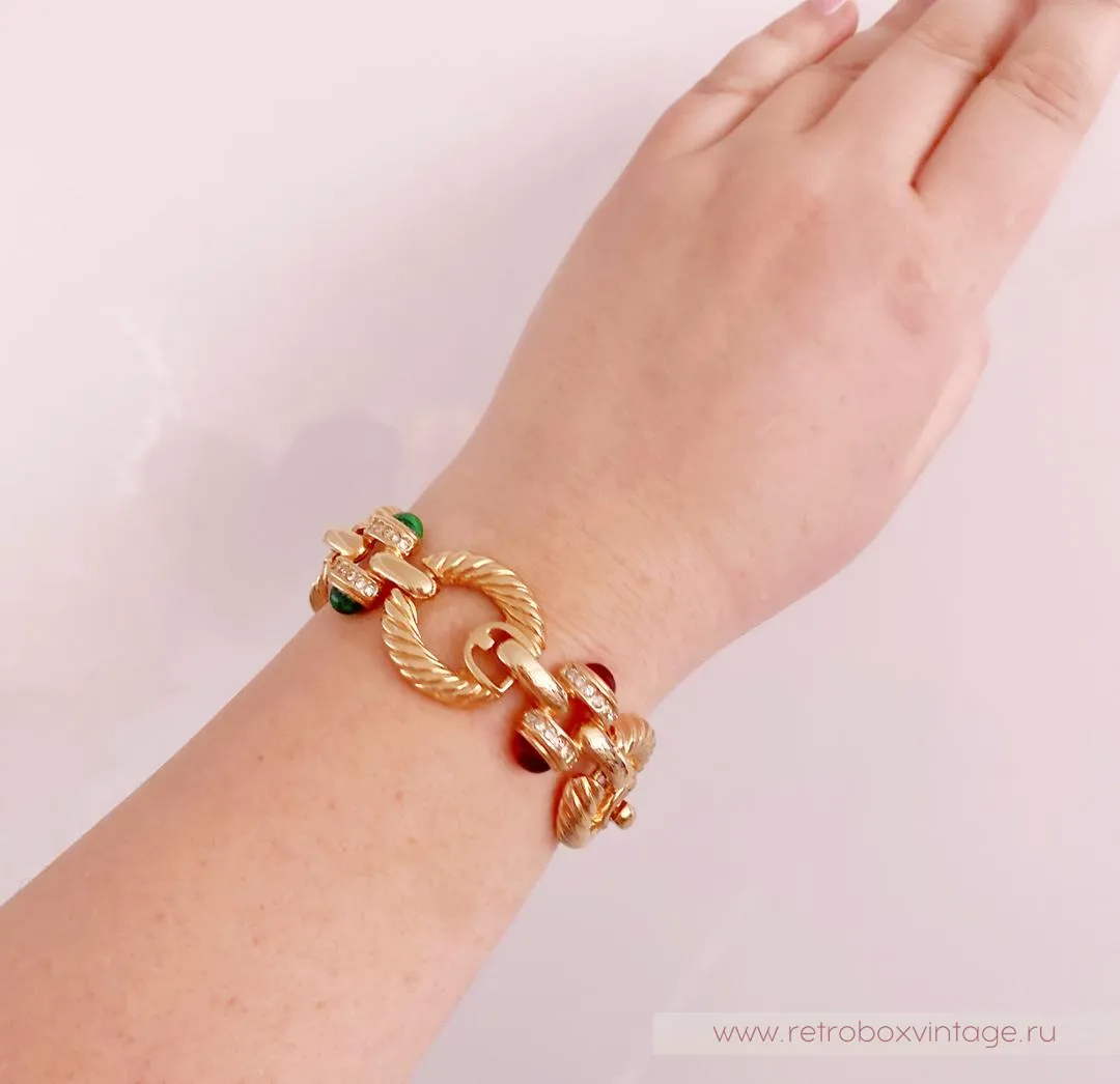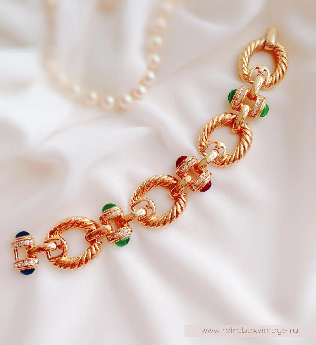 Одно из таких воплощенных вдохновений перед вами. Этот браслет JOAN RIVERS выполнен в свойственной индийским украшениям технике: звенья металла цвета золота чередуются с кабошонами сочных оттенков сапфира, изумруда и рубина.Замыкаясь, браслет образует единый круг с симметричными деталями. В таком варианте, полагали индусы, изделие излучает гармонию и усиливает энергию так называемой красной чакры Мулад-хары, которая отвечает за уверенность в себе. А что как не вера в себя, вызывает в нас прилив жизнелюбия, творческих сил и желание очаровывать окружающих?
