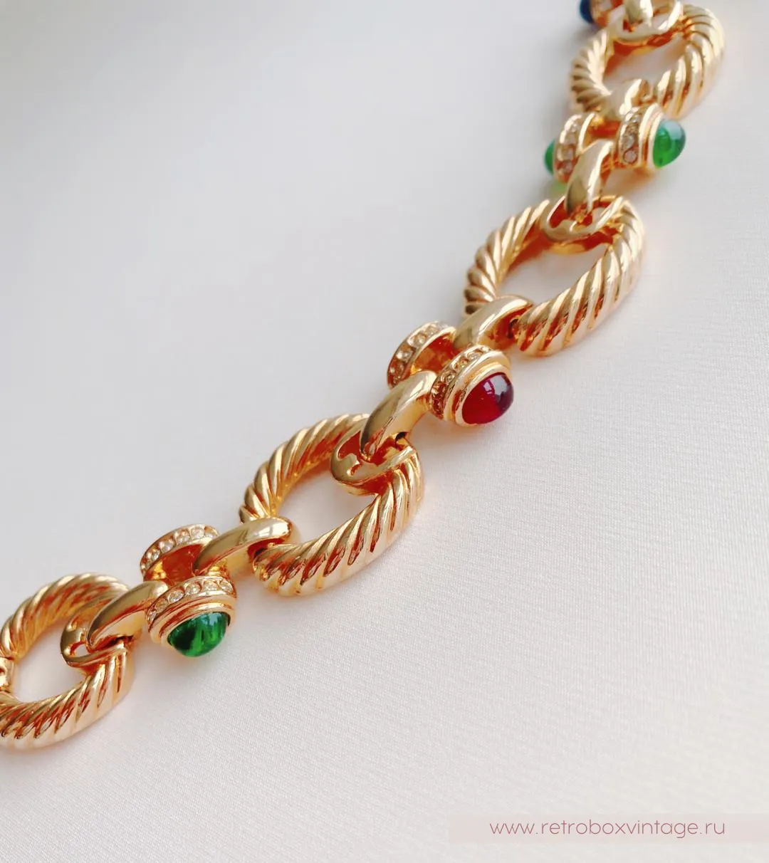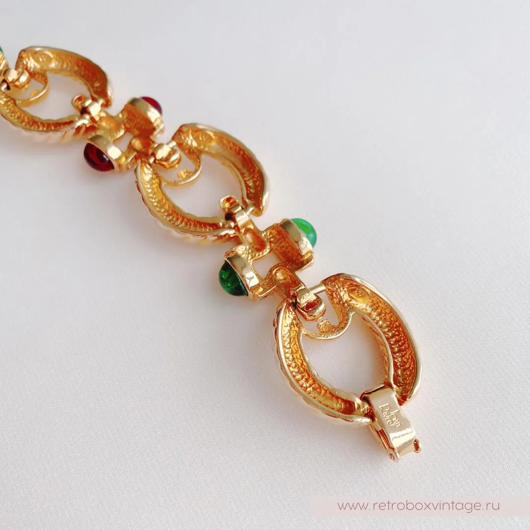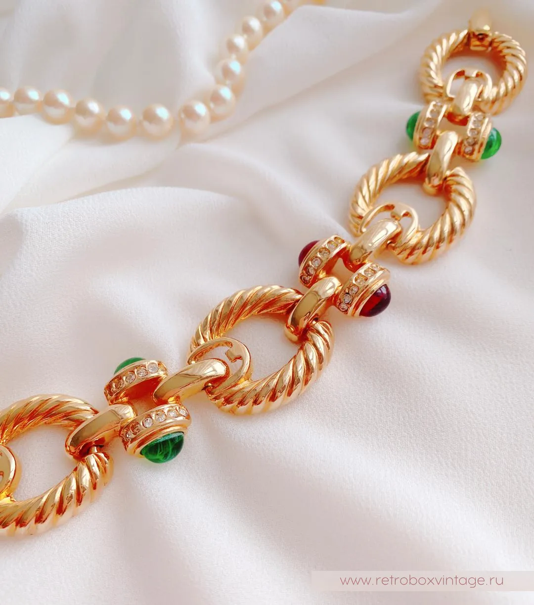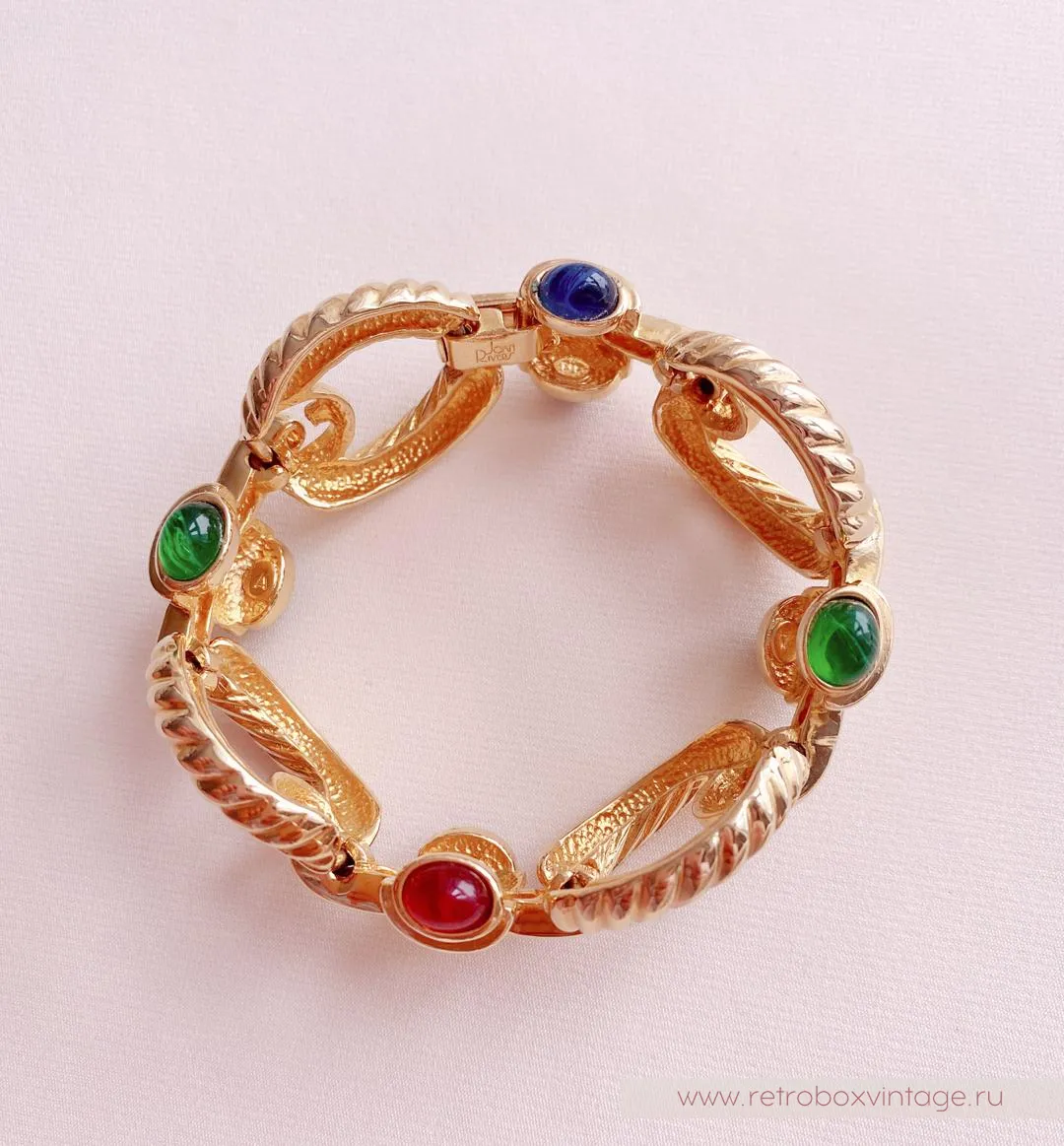 Одно из таких воплощенных вдохновений перед вами. Этот браслет JOAN RIVERS выполнен в свойственной индийским украшениям технике: звенья металла цвета золота чередуются с кабошонами сочных оттенков сапфира, изумруда и рубина.Замыкаясь, браслет образует единый круг с симметричными деталями. В таком варианте, полагали индусы, изделие излучает гармонию и усиливает энергию так называемой красной чакры Мулад-хары, которая отвечает за уверенность в себе. А что как не вера в себя, вызывает в нас прилив жизнелюбия, творческих сил и желание очаровывать окружающих?