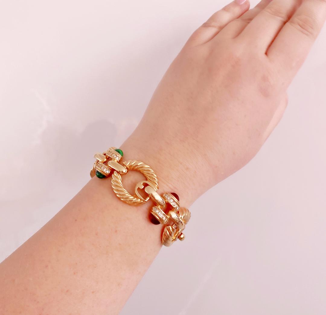 Одно из таких воплощенных вдохновений перед вами. Этот браслет JOAN RIVERS выполнен в свойственной индийским украшениям технике: звенья металла цвета золота чередуются с кабошонами сочных оттенков сапфира, изумруда и рубина.Замыкаясь, браслет образует единый круг с симметричными деталями. В таком варианте, полагали индусы, изделие излучает гармонию и усиливает энергию так называемой красной чакры Мулад-хары, которая отвечает за уверенность в себе. А что как не вера в себя, вызывает в нас прилив жизнелюбия, творческих сил и желание очаровывать окружающих?