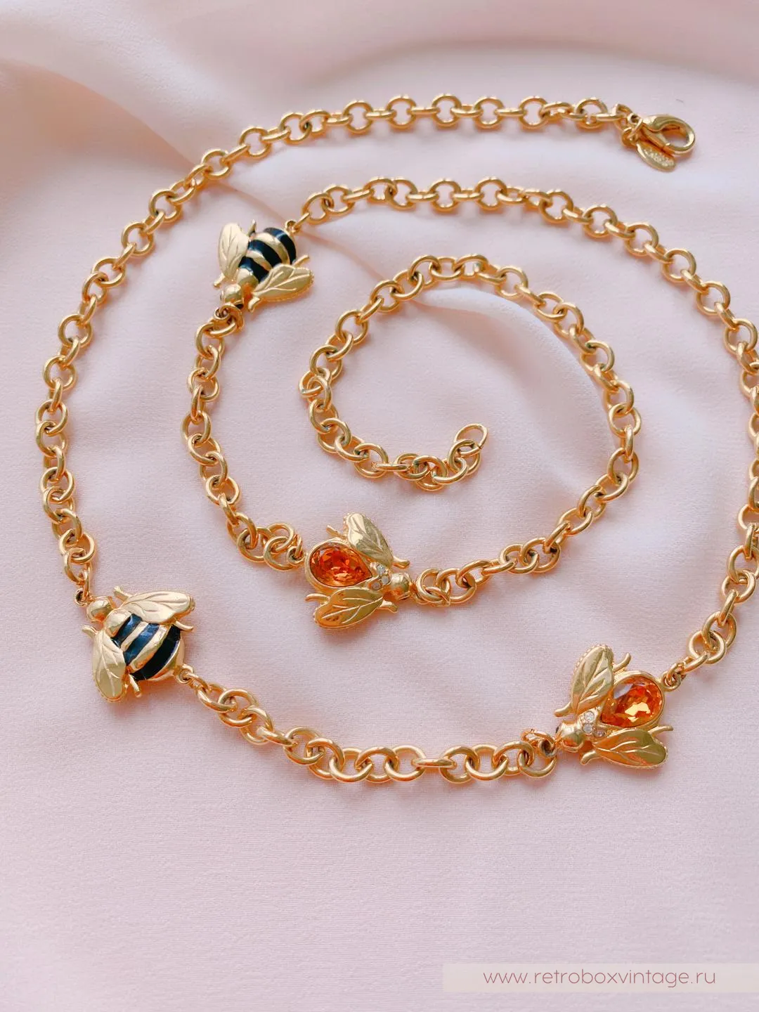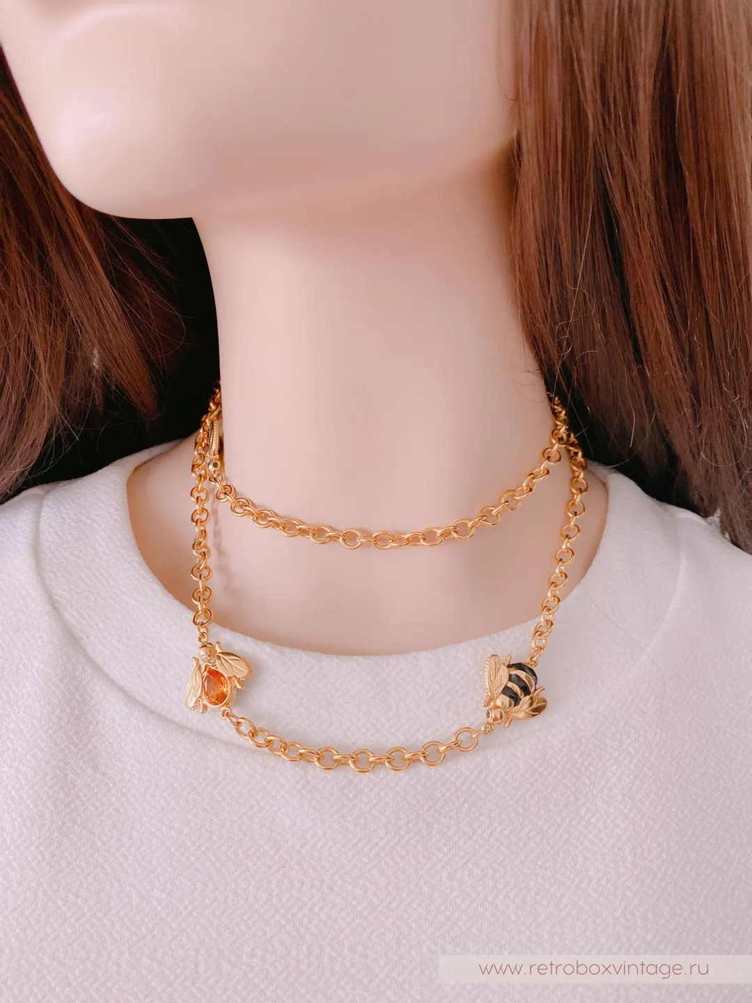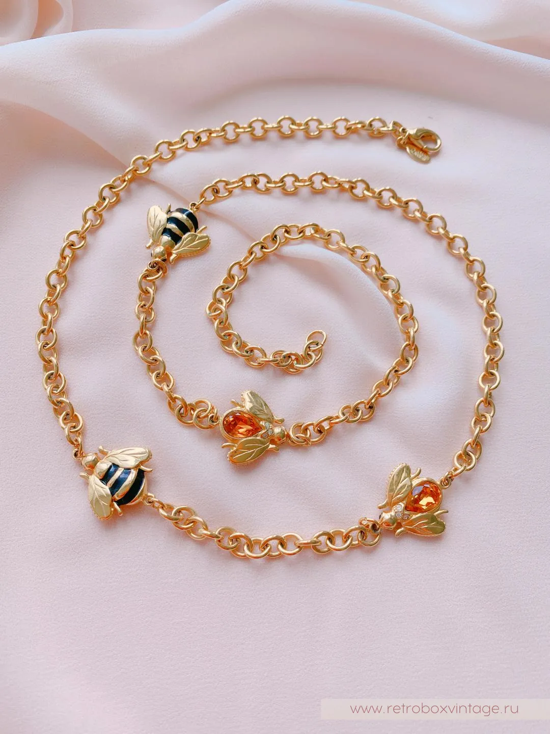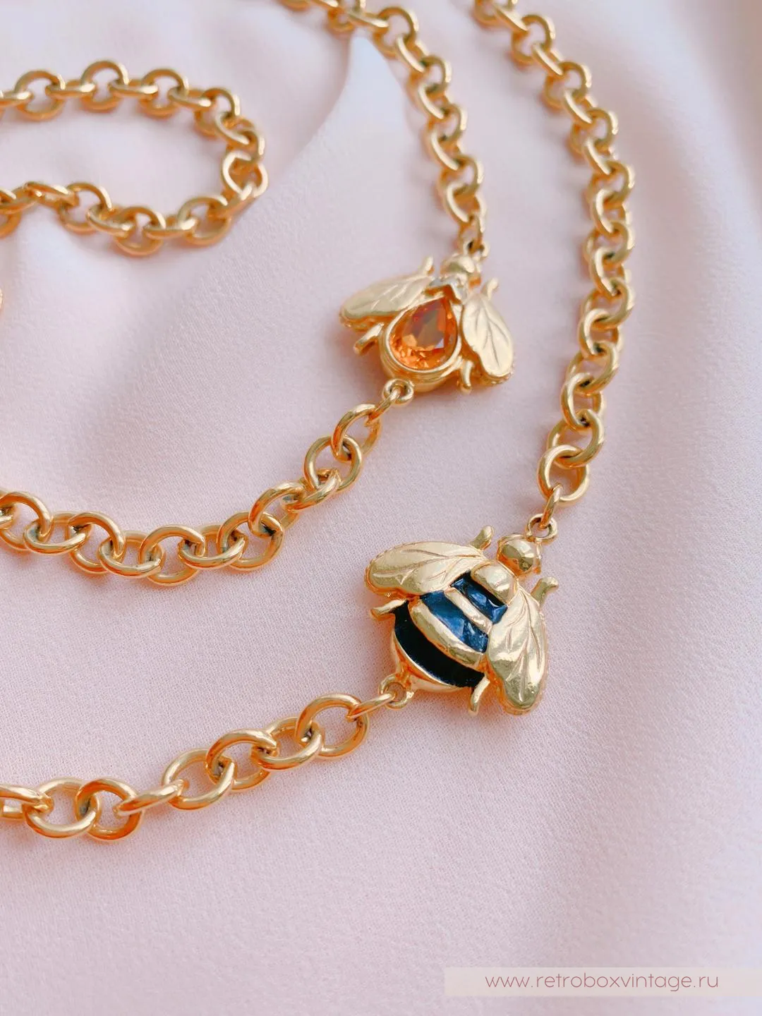 Каждая пчёлка - двусторонняя: с одной стороны полосатые брюшки, а на обороте - медовый кристалл. Как красиво будет играть это ожерелье в движении, поворачиваясь к окружающим то одним, то вторым бочком. И даже цвет здесь не случаен: золото - символ богатства и роскоши.Украсьте себя этим редким аксессуаром с медовыми пчелками и ваша жизни станет слаще! От комплиментов, как минимум.