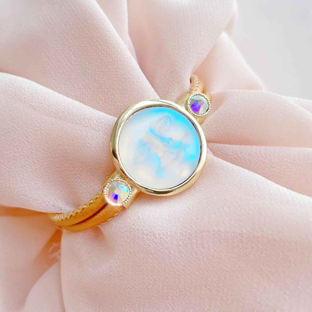 Представьте себе, что пока кропотливые руки дизайнера создают луну из волшебного опалового стекла, ее оправу и инкрустацию, реальное светило проходит свой месячный цикл. Так долго производится каждый лик! В ореоле северного сияния кристаллов-капелек лики ночной красавицы смотрятся просто волшебно! Браслет выполнен в минималистическом стиле на кожаном ремешке цвета золота. Лазурные искрящиеся кристаллы по бокам оправы очень эффектно подчеркивают лунный лик.