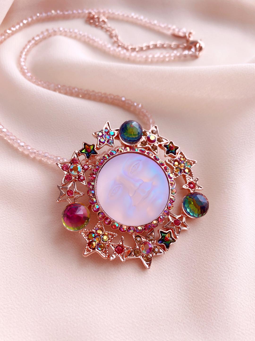 Взгляните на эту восхитительную луну в обрамлении звёзд! Ее мягкое таинственное мерцание цвета завораживает! Словно по взмаху волшебной палочки она неожиданно и неуловимо меняет светлое свечение лика на розовое, затем плавно переходит в голубой и нежно-лавандовый...Такое внутреннее свечение луны – особое свойство опалового стекла, секрет которого хранится за семью печатями. Сама дизайнер марки Дженнифер рассказывает, что изготовление луноликого украшения трудозатратно - ведь каждое светило производится исключительно вручную, проходит около 20 этапов обработки и это занимает порой до 4 месяцев работы.
