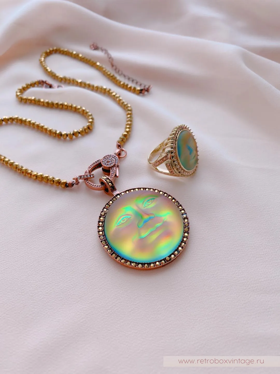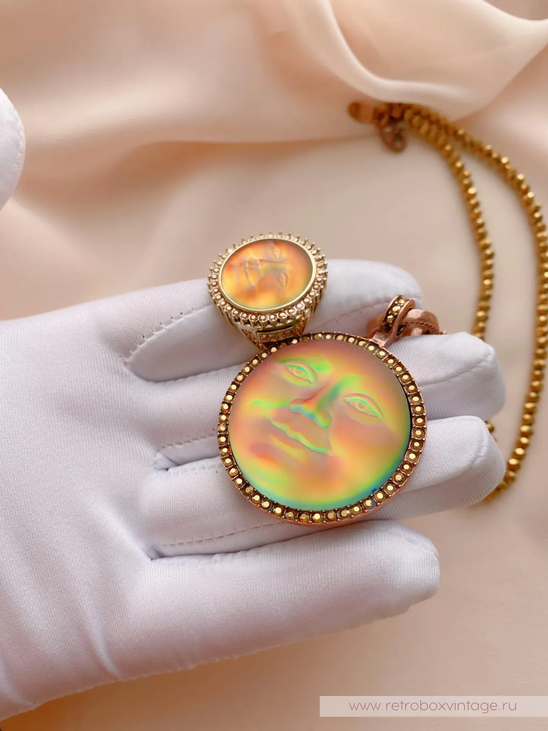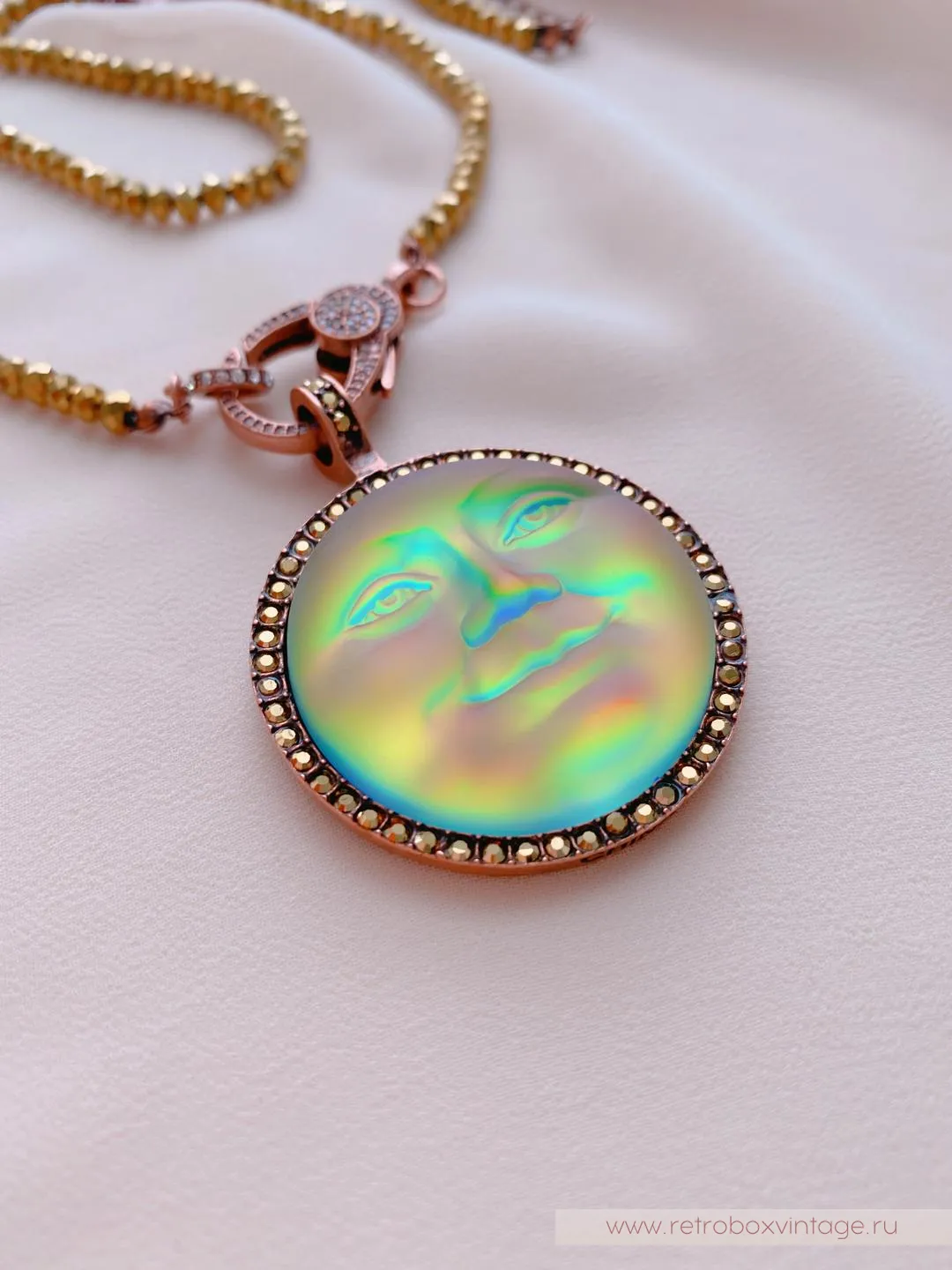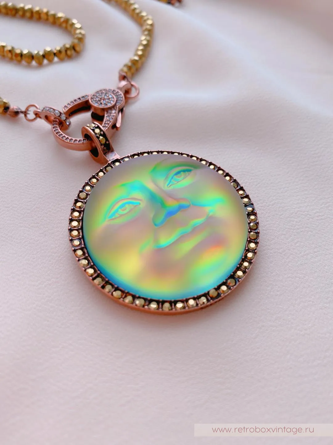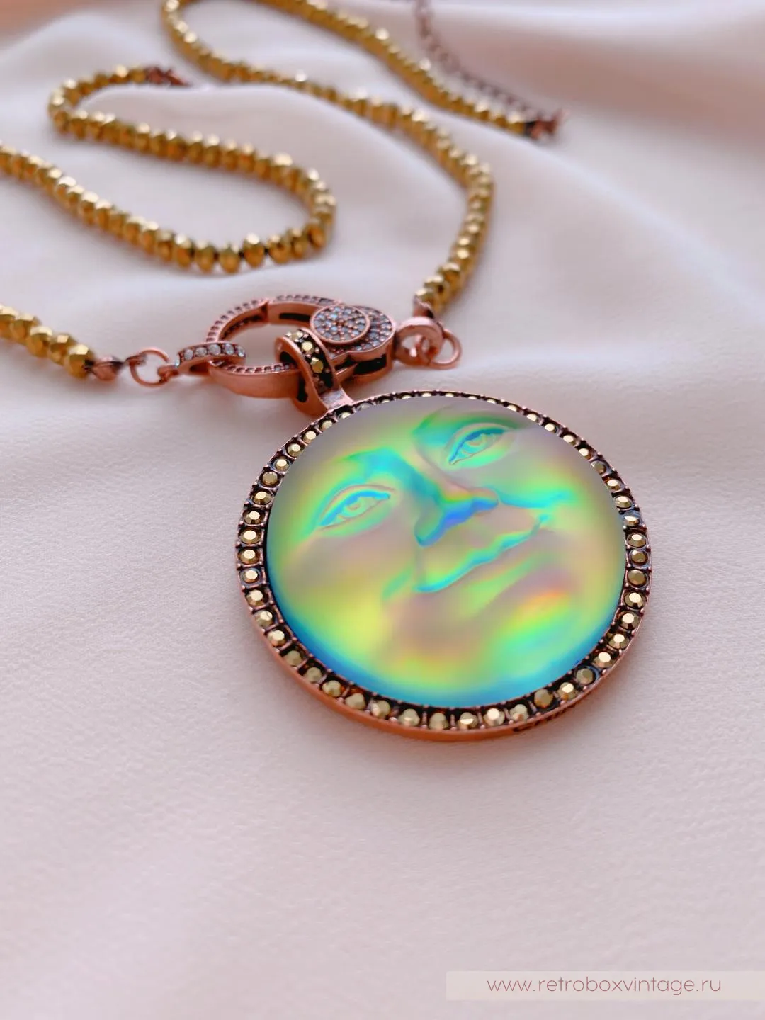Она по-прежнему живет в небесном дворце, а своим отражением любуется только с высоты звезд.Благодаря великолепной коллекции украшений KIRKS FOLLY мы можем любоваться красотой прекрасной нимфы в ее удивительных воплощениях, подобных этим лунам, которые я называю хамелеонами.Невероятные переливы опалового стекла этого кулона чудесны: персиковый, золотистый, нежно-салатовый, зелёный, голубой и даже фуксия! Всеми этими цветами переливается лунный лик.