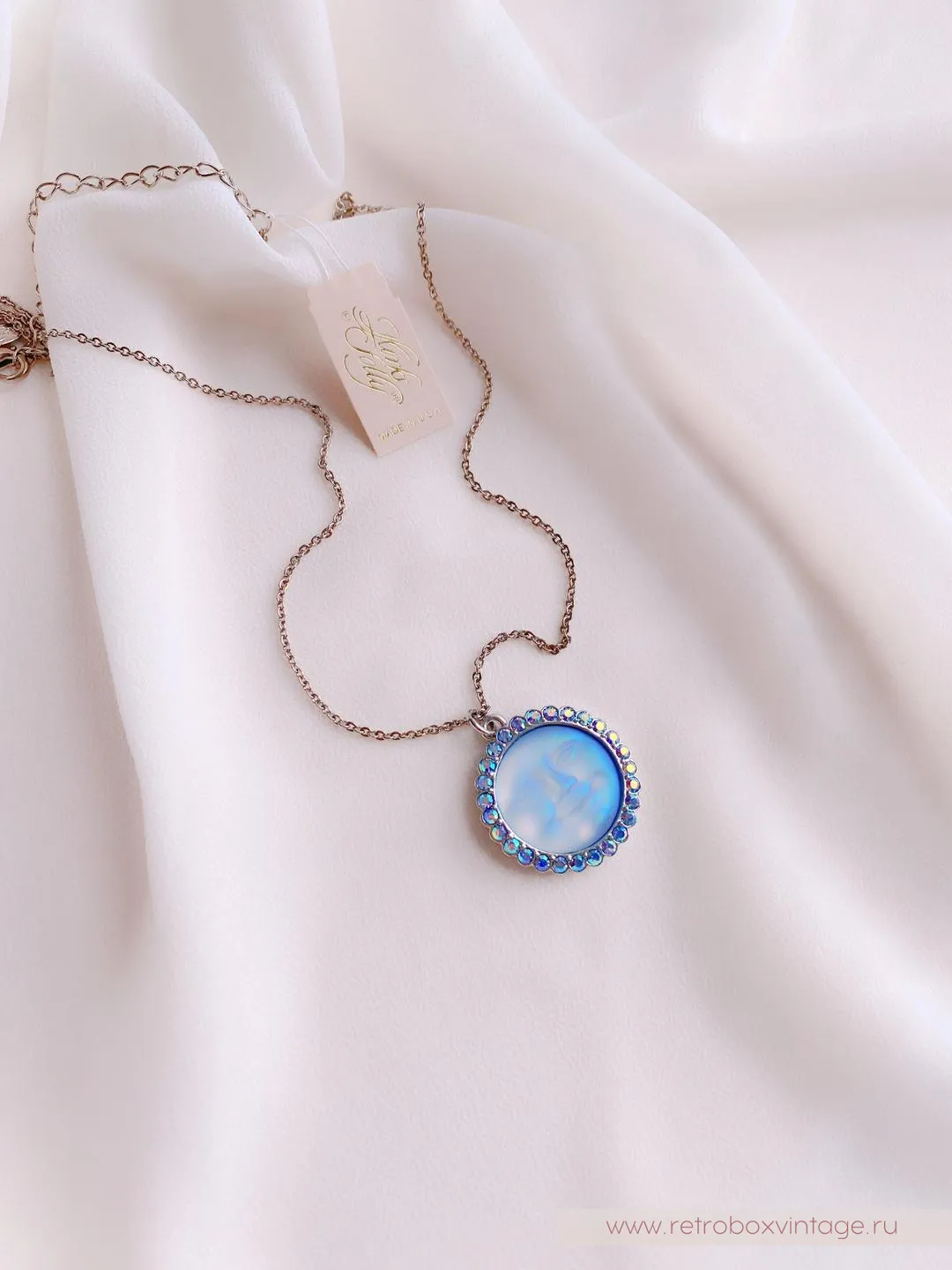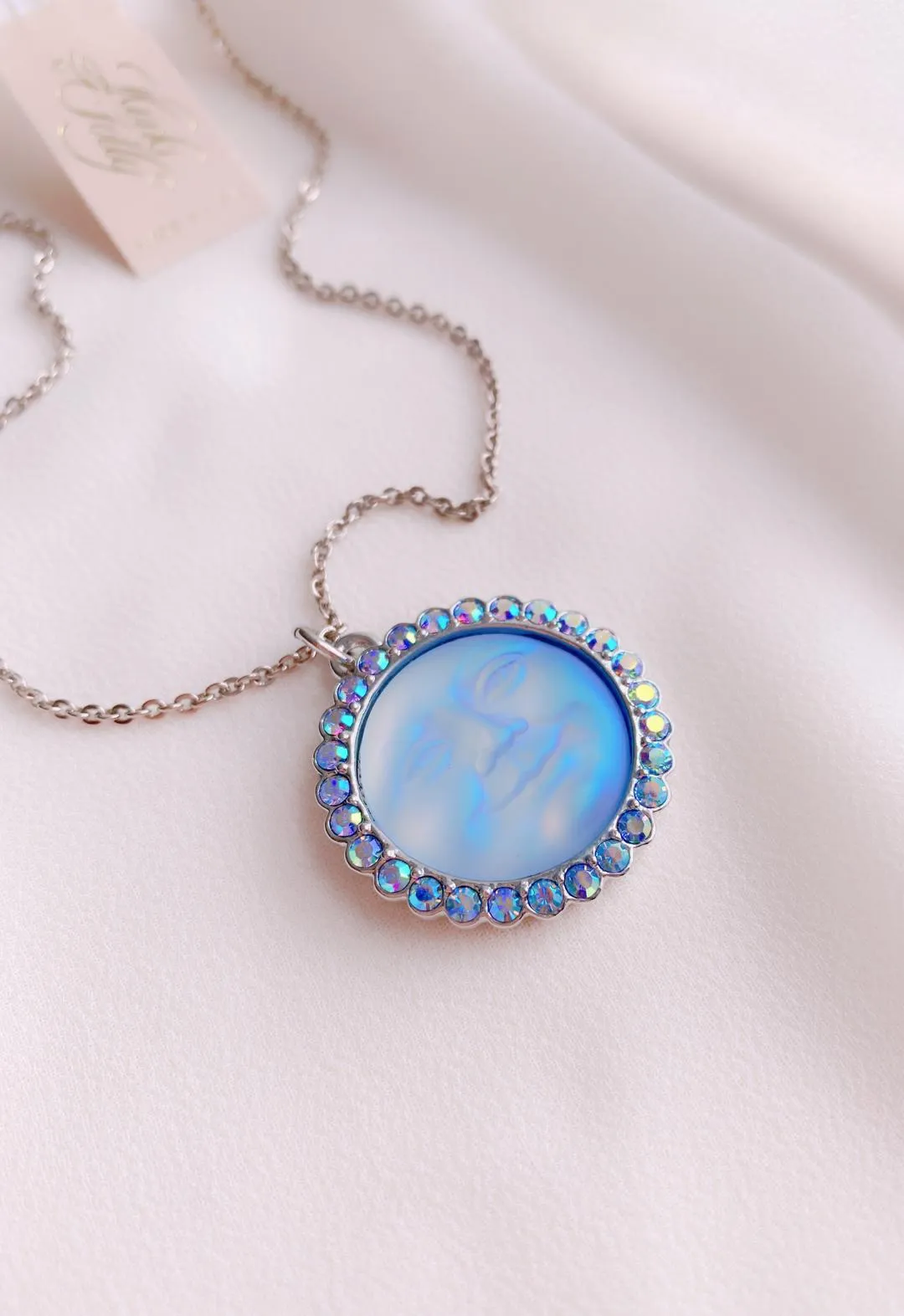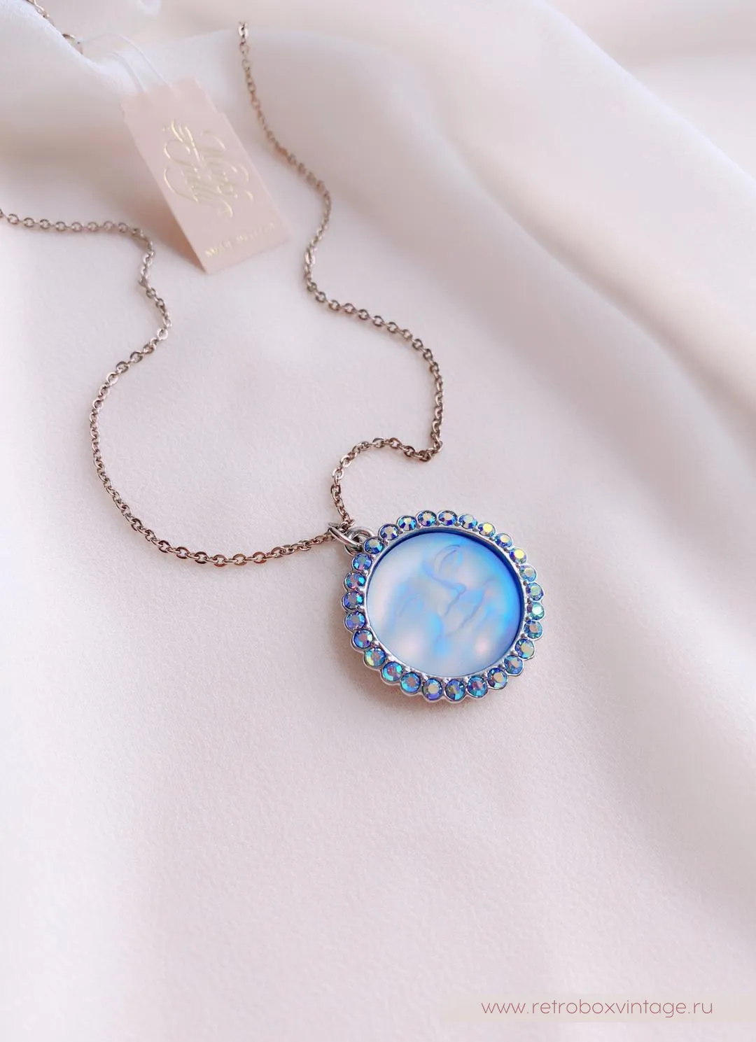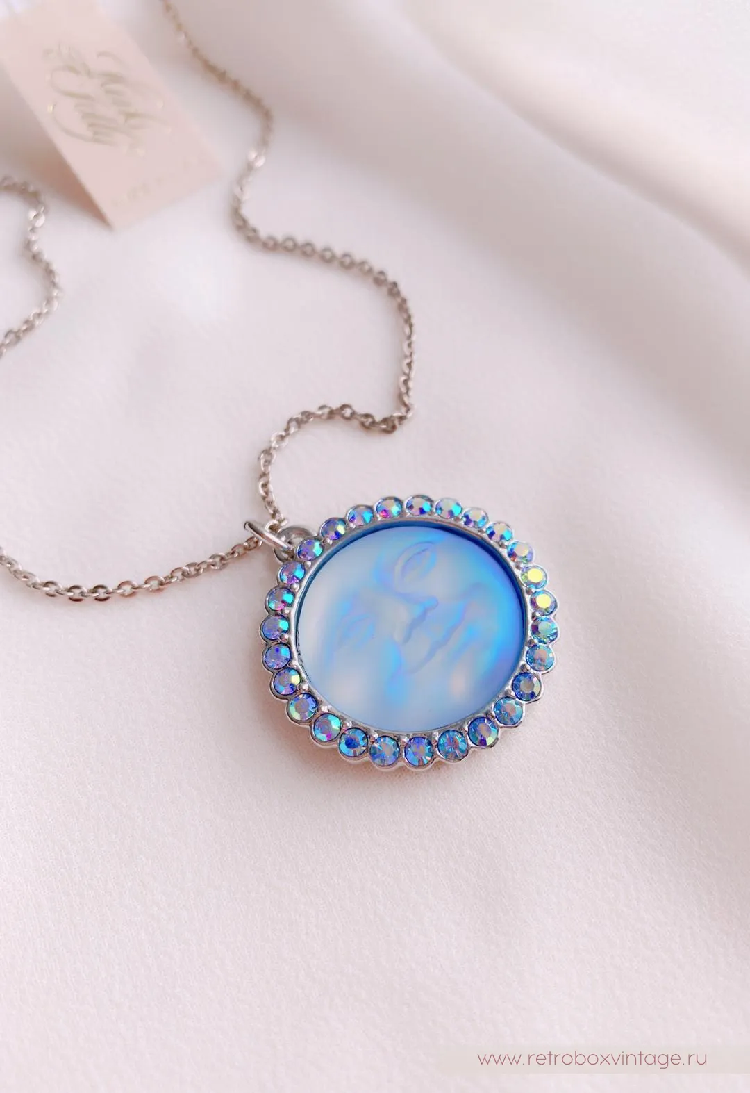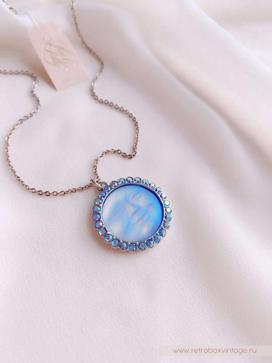 Кулон на цепочке выполнен что называется «без излишеств», в минималистичном дизайне. Лазурные искрящиеся кристаллы оправы очень эффектно подчеркивают лавандово-голубые лунные лики.Дженифер, дизайнер марки, утверждает, что лунные украшения - это обереги, хранящие свою хозяйку. Да и сама Луна - символ женского начала! Украшения смотрится просто волшебно и привлекают к себе внимание.