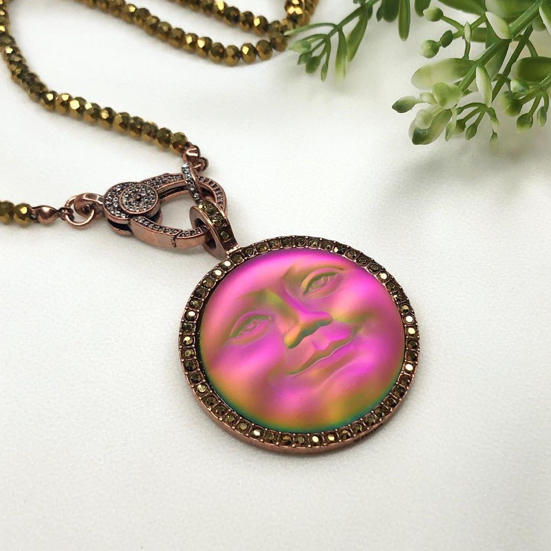 Она по-прежнему живет в небесном дворце, а своим отражением любуется только с высоты звезд.Благодаря великолепной коллекции украшений KIRKS FOLLY мы можем любоваться красотой прекрасной нимфы в ее удивительных воплощениях, подобных этим лунам, которые я называю хамелеонами.Невероятные переливы опалового стекла этого кулона чудесны: персиковый, золотистый, нежно-салатовый, зелёный, голубой и даже фуксия! Всеми этими цветами переливается лунный лик.