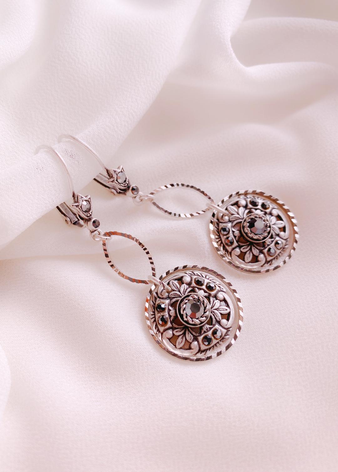 Резной серебряный диск органично смотрится в декоре серег и кольца. Изящный флористический рисунок венчают небольшие гематитовые кристаллы.
