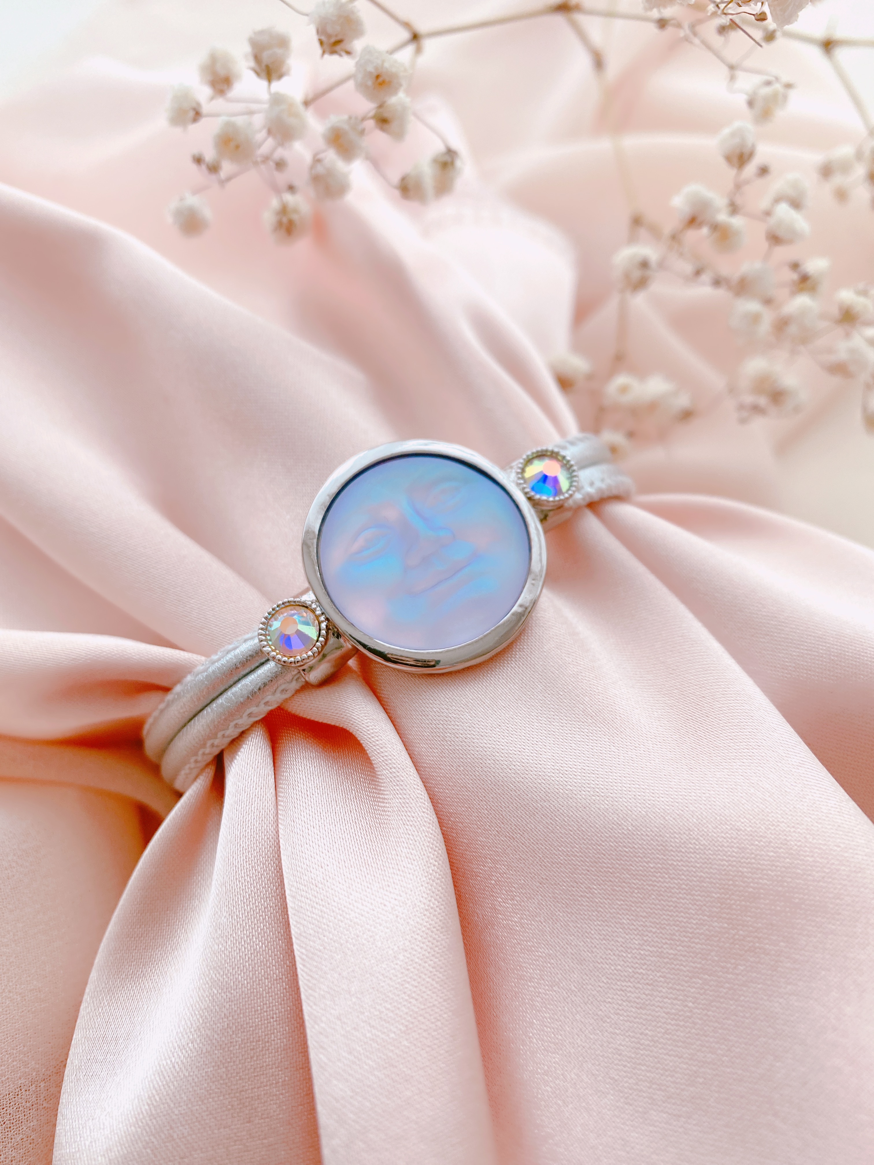 При дневном свете она нежна, а ночью расцветает переливами неповторимых сочных оттенков. Браслет словно оживает, когда на лунный лик попадает луч света. Эффект потрясающий! И только блеск кристаллов напоминает нам, о том, что эти луны − великолепное творение рук человека, а не мифический артефакт.