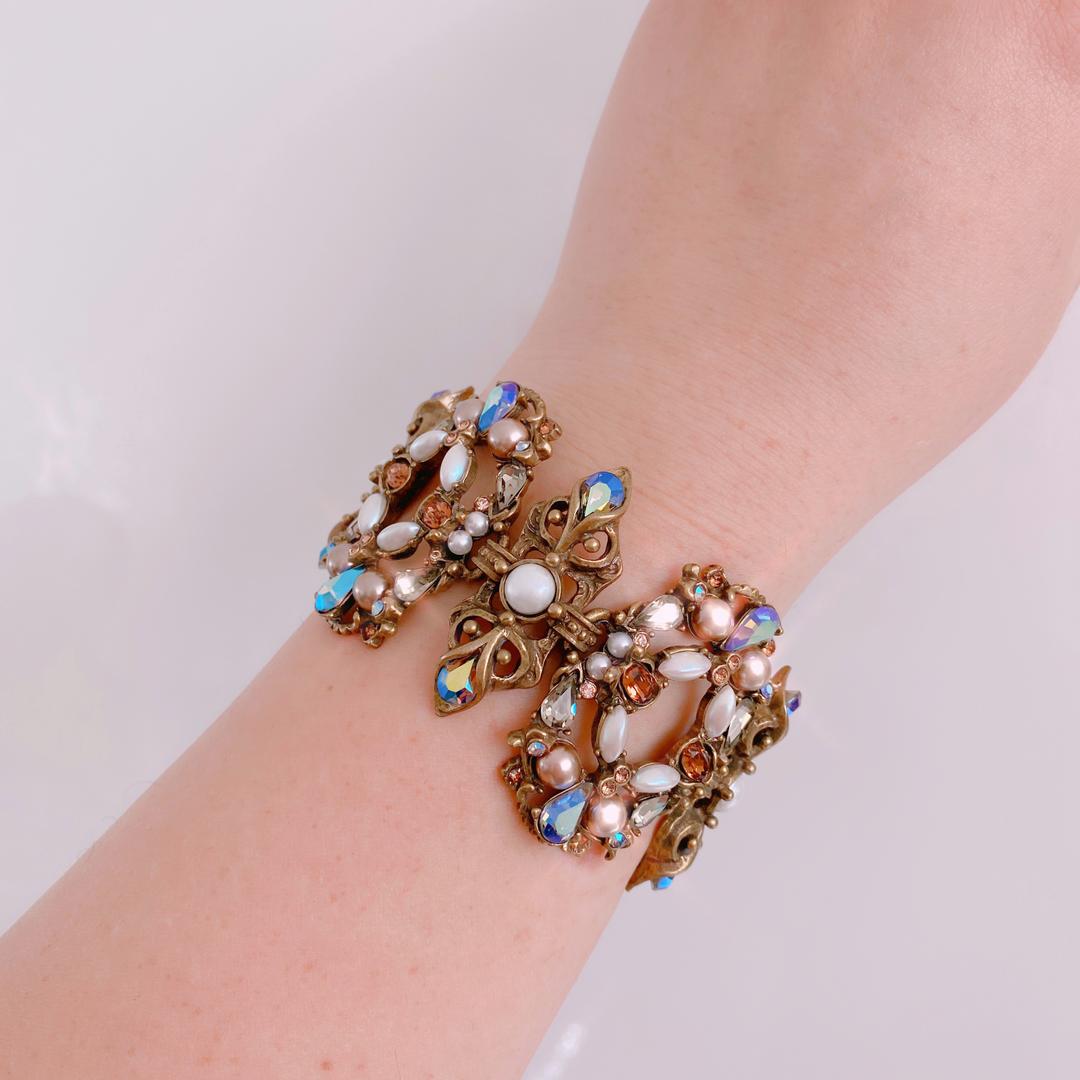 Чередующиеся пары звеньев усыпаны различной формы кристаллами и жемчужинами. И мы можем «прочесть» их, разбудив свое воображение и воспользовавшись знаниями.Кристаллы высшего качества различных оттенков раухтопаза символизируют безмятежность. Перламутр жемчужин подчеркивает чистоту и искренность чувств. А фантазийные переливы Aurora Borealis в фиолетово-бирюзовой гамме придают посланию магическое значение.