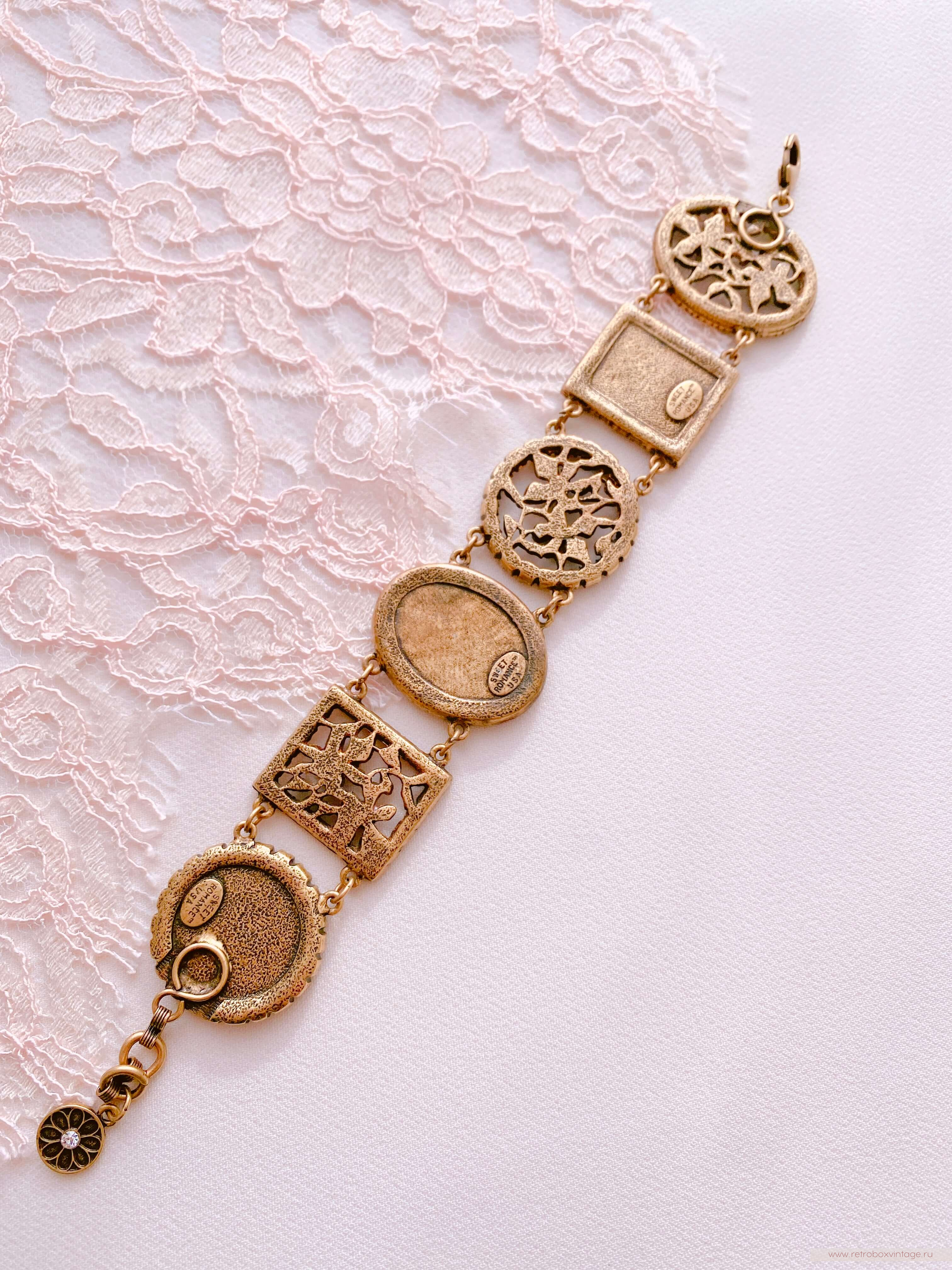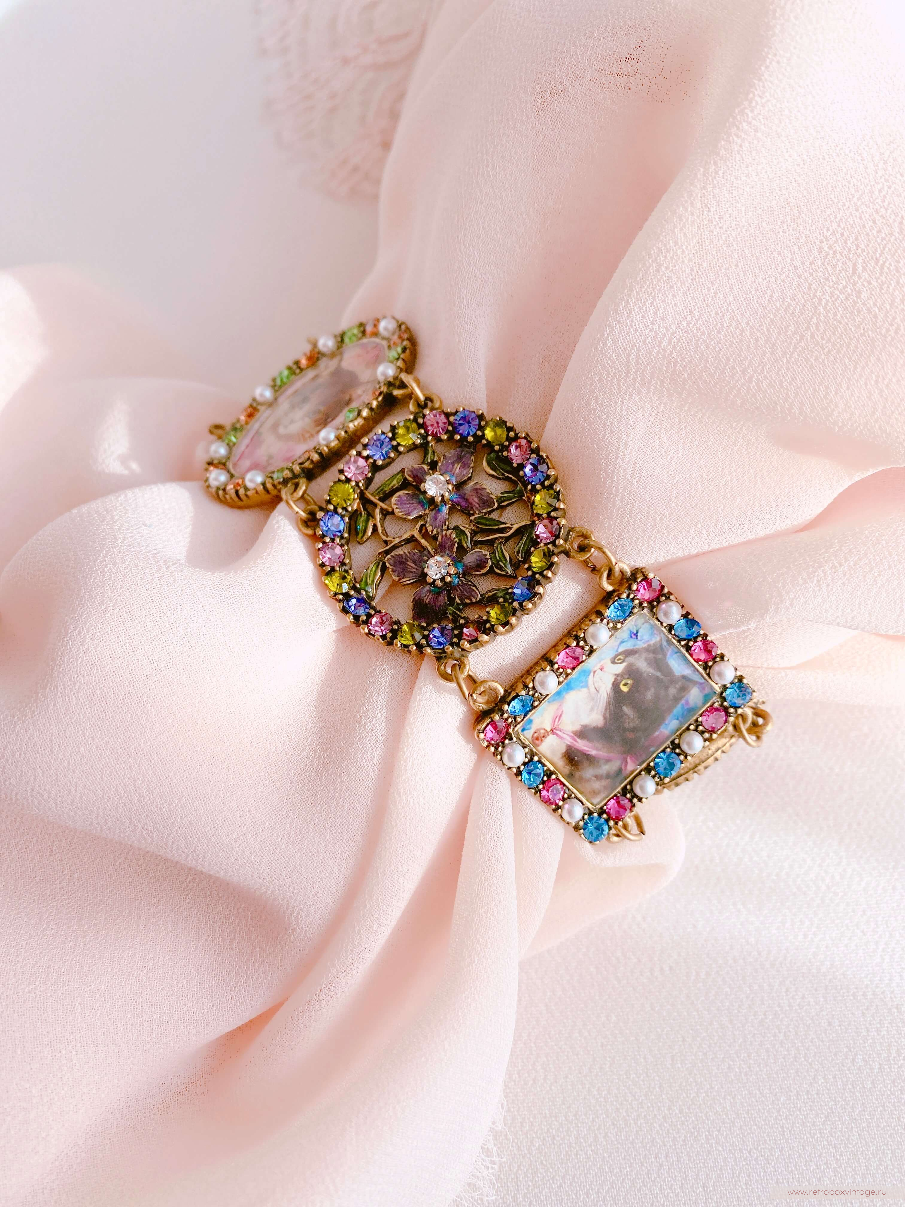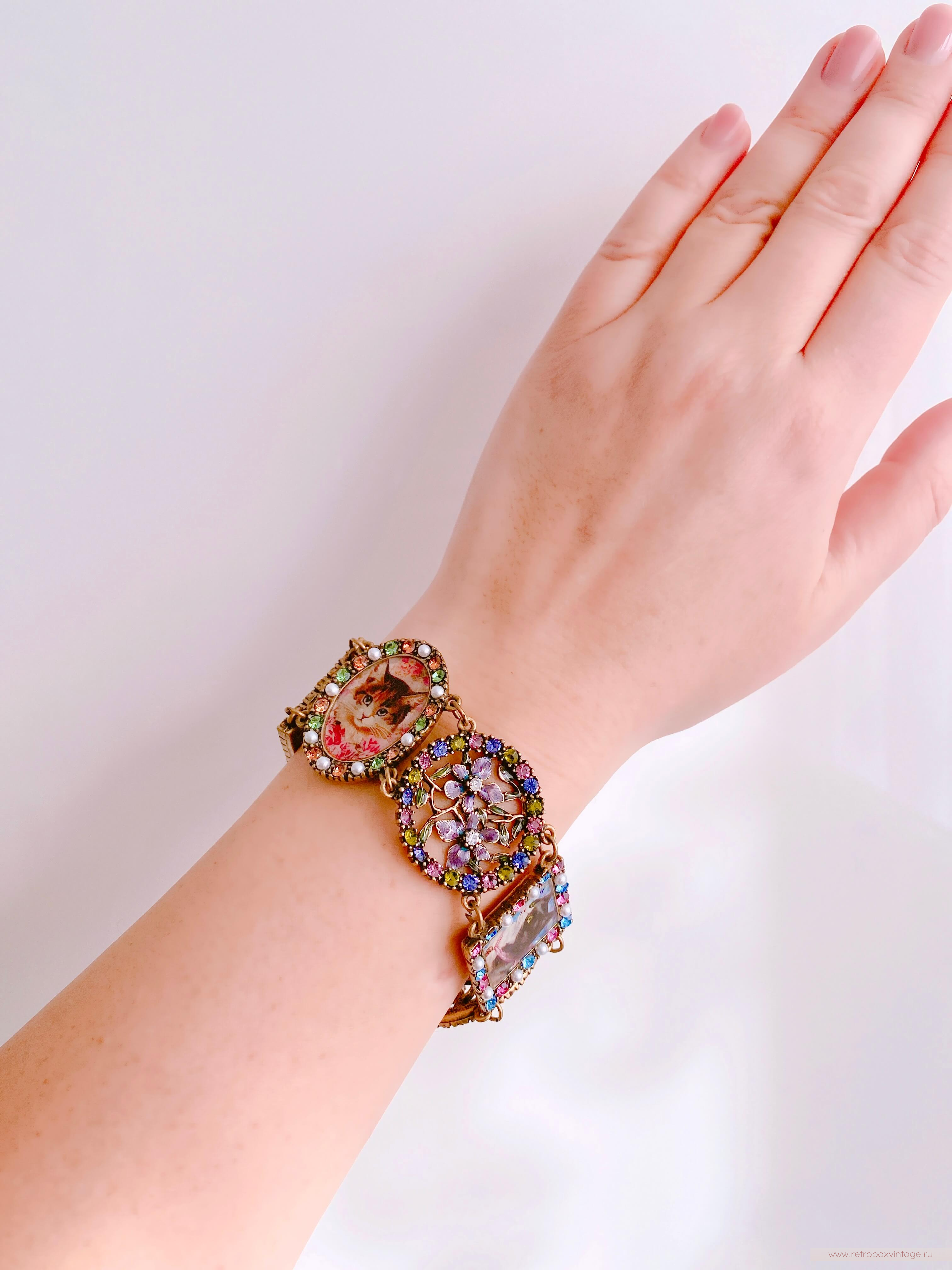 Браслет «Кошки и цветы» от американской марки SWEET ROMANCE — это именно такая история. Он соткан из чередующихся звеньев, каждое из которых словно маленькая драгоценная миниатюра. На одних — изящные кошечки, чьи силуэты бережно воспроизведены со старинных открыток, созданных более века назад. В их позах — грация минувших эпох, в их взглядах — мудрость, накопленная временем. На других звеньях распускаются цветы, исполненные в технике эмали, — яркие, живые, словно только что собранные в утреннем саду. И те и другие щедро украшены кристаллами Swarovski, чей свет рассыпается при каждом движении, и нежными жемчужинами, добавляющими украшению мягкого сияния. Браслет выполнен из гипоаллергенного бижутерного сплава, покрытого полированной бронзой, — это благородный металл, который с годами лишь набирает глубину и шарм.