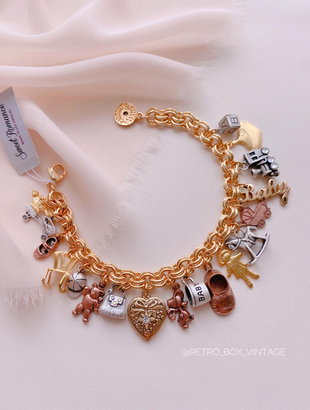 Ни с чем не сравнимое теплое чувство, которое непременно возникает при взгляде на такой браслет делает его дорогим и близким сердцу.Все элементы выполнены с использованием оригинальных винтажных штампов 40-годов прошлого столетия и покрыты серебром, желтым и розовым золотом.Такой браслет станет незабываемым и приятным подарком для каждой мамы на рождение ребёнка, 8 марта, День рождения или День матери.