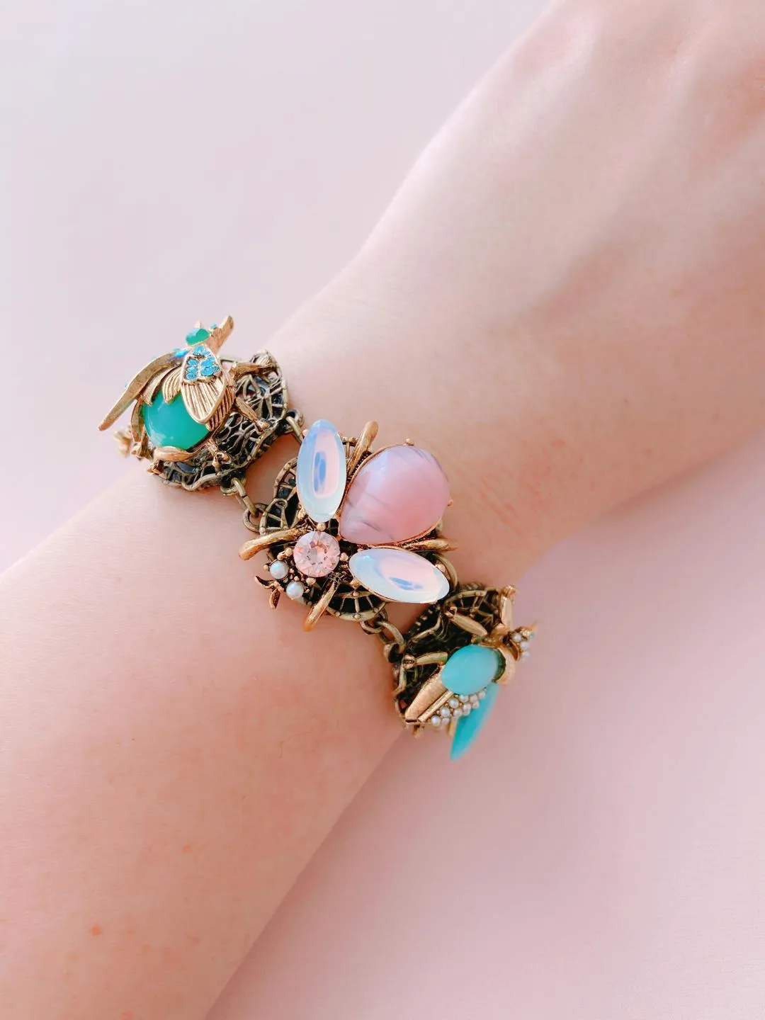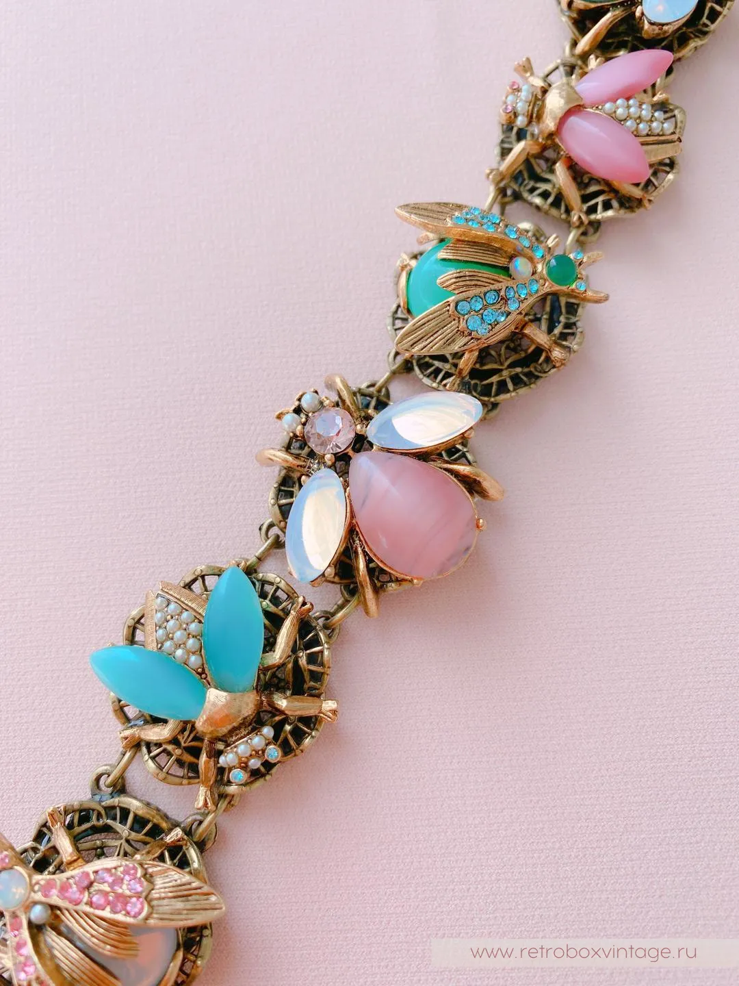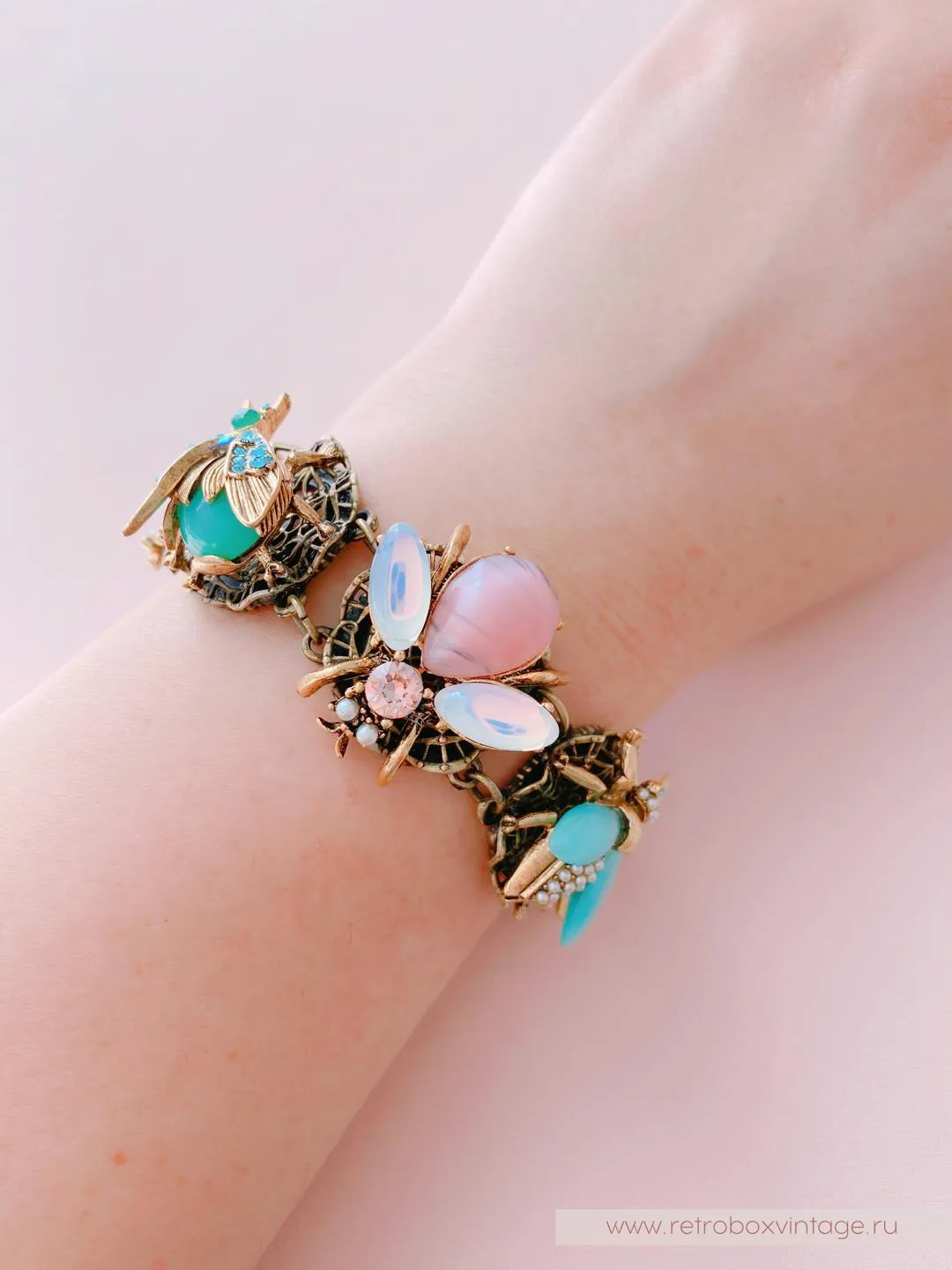 Браслет с пастельными пчёлками заслуживает особого внимания: его филигранная основа изготовлена на оригинальном оборудовании 40-х годов прошлого века. В этих украшениях используются только австрийские кристаллы и художественное стекло, изготовленное вручную по технике лэмпворк.Нежные крылатые подружки всегда поднимают настроение: удивительно легкие пастельные тона пчелок с крылышками лунного цвета вызывают неописуемый восторг.
