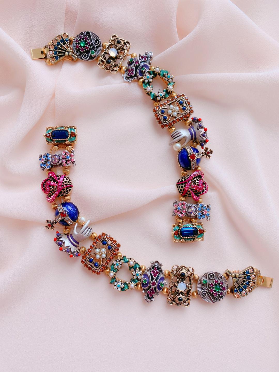 Все элементы браслета безупречны. Сочетание кристаллов высшего качества со вставками полудрагоценных камней и художественного стекла, в обрамлении серебра и позолоты вызывают самые восторженные чувства.А в чем вы готовы признаться, надевая этот браслет?