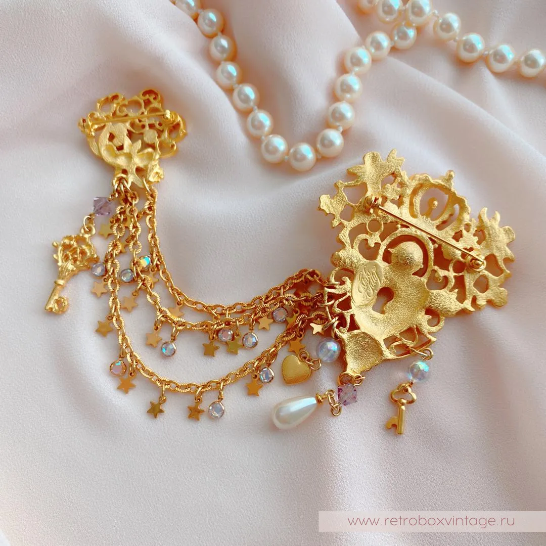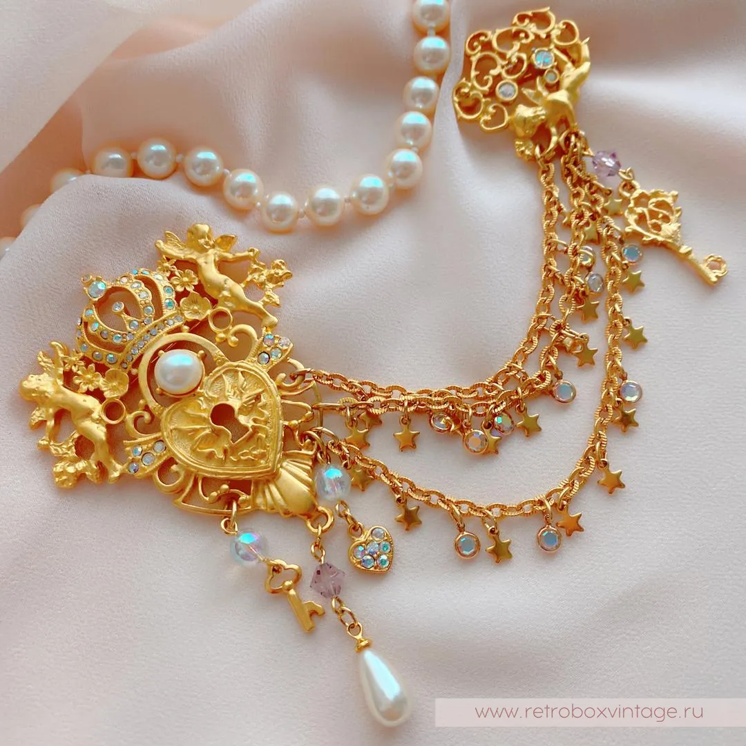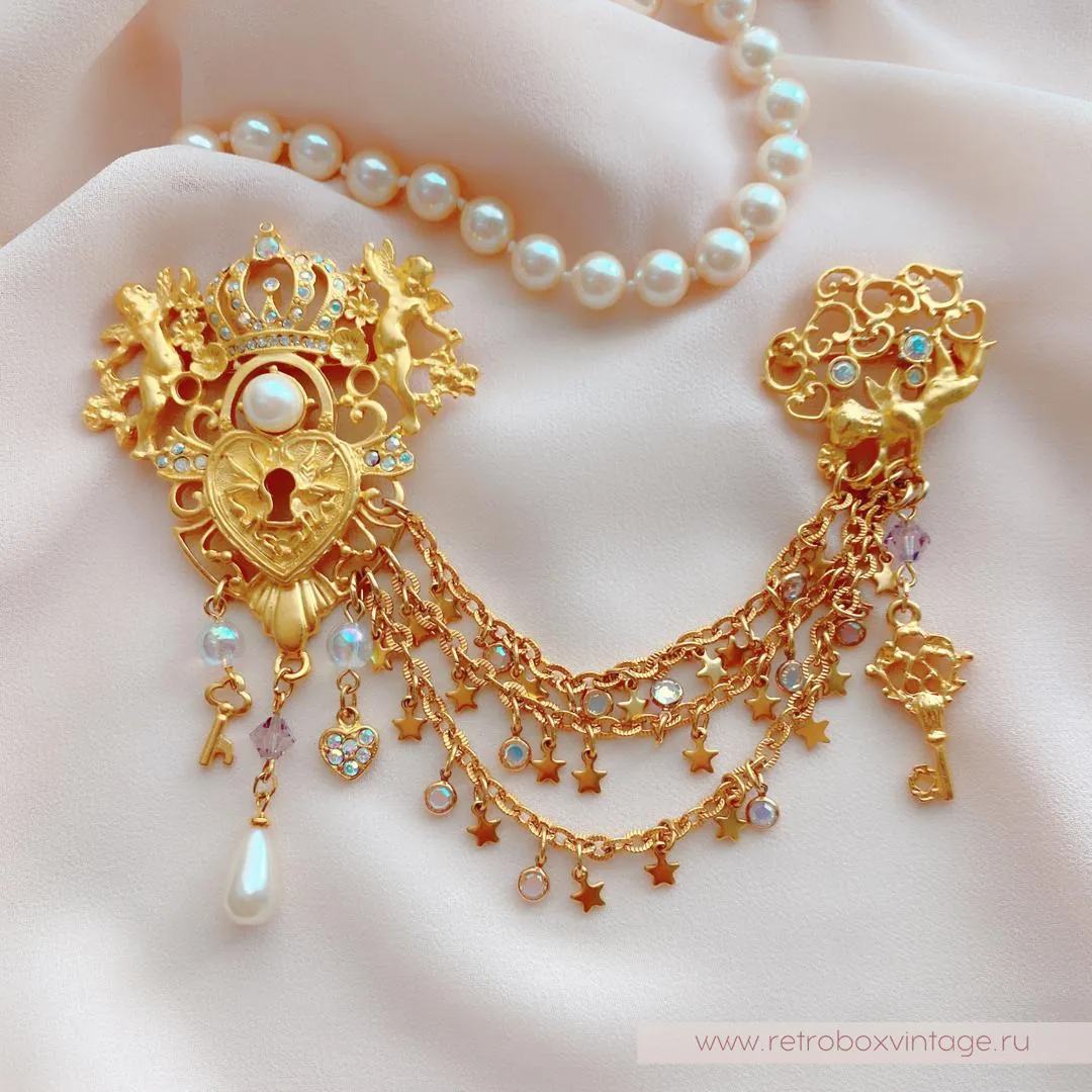Двое херувимов охраняют любовь в сердце, а еще один ангелочек хранит ключ к нему.Три цепочки, соединяющие две части шатлена, - это пути к сердцу. Украшенные миниатюрными безелями, ключиками, сердцами и звездочками, все три дорожки сулят увлекательные приключения в лучах радужного северного сияния.Если вы помните, Aurora Borealis (северное сияние) – это специальное мерцающее покрытие кристаллов, придуманное SWAROVSKI и CHRISTIAN DIOR. Оно использовалось создателями бижутерии в 1950-70 г.г.Две части броши-шатлена неотделимы. Совсем как сердце и ключ к нему! Ну что же, леди, кто разгадает тайну и сможет открыть это сердце?