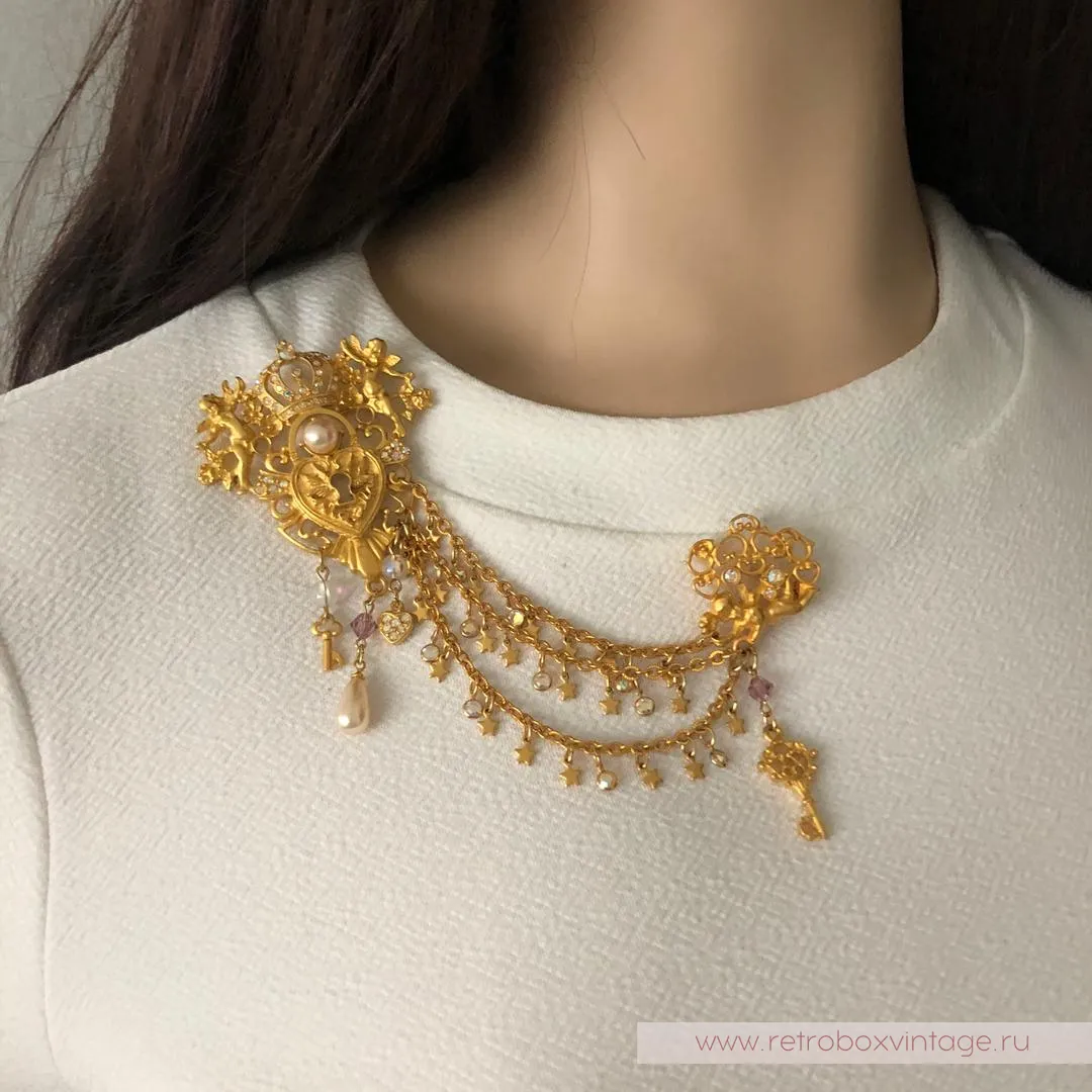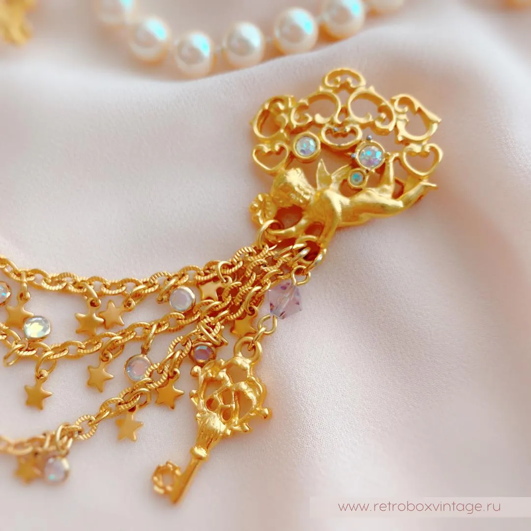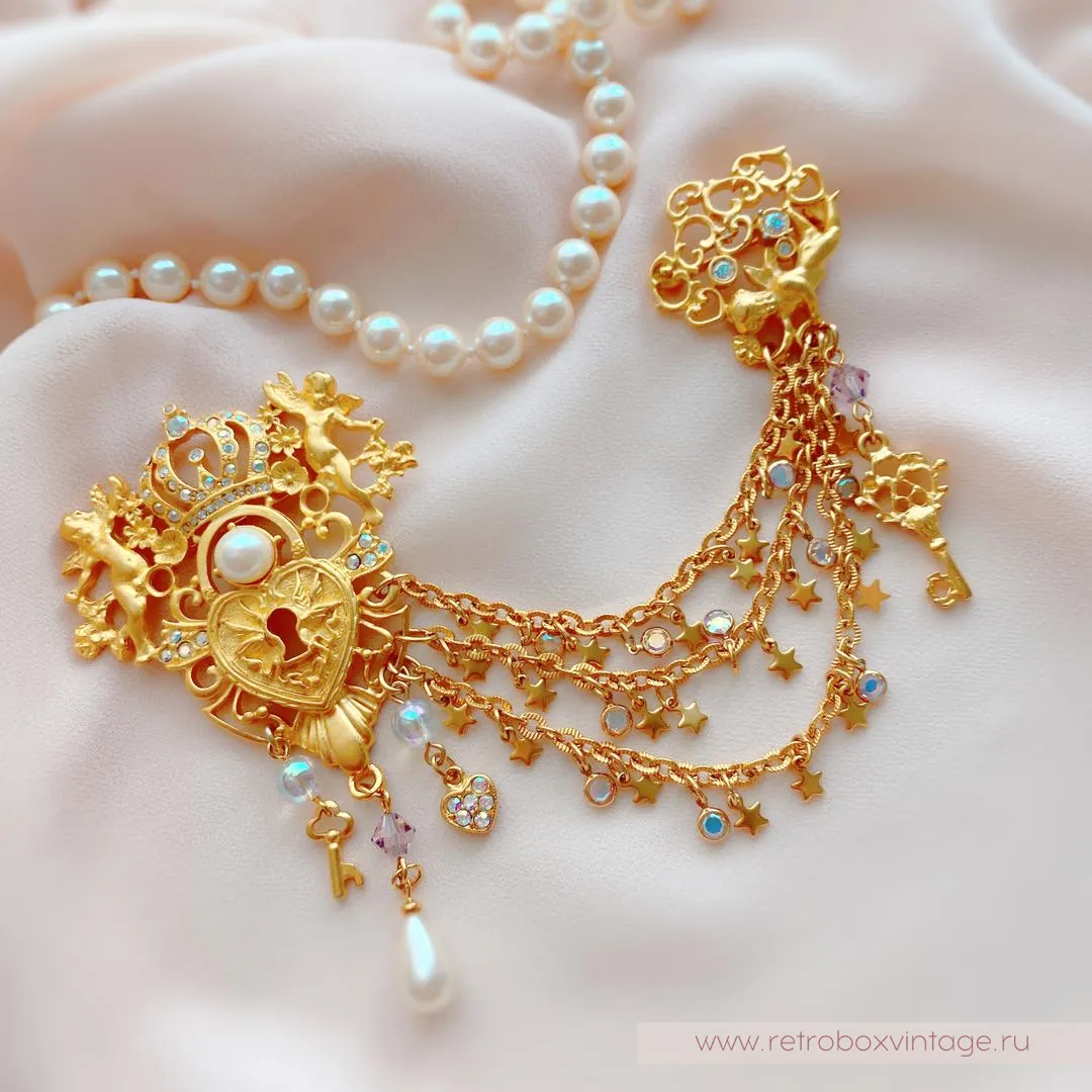 Двое херувимов охраняют любовь в сердце, а еще один ангелочек хранит ключ к нему.Три цепочки, соединяющие две части шатлена, - это пути к сердцу. Украшенные миниатюрными безелями, ключиками, сердцами и звездочками, все три дорожки сулят увлекательные приключения в лучах радужного северного сияния.Если вы помните, Aurora Borealis (северное сияние) – это специальное мерцающее покрытие кристаллов, придуманное SWAROVSKI и CHRISTIAN DIOR. Оно использовалось создателями бижутерии в 1950-70 г.г.Две части броши-шатлена неотделимы. Совсем как сердце и ключ к нему! Ну что же, леди, кто разгадает тайну и сможет открыть это сердце?