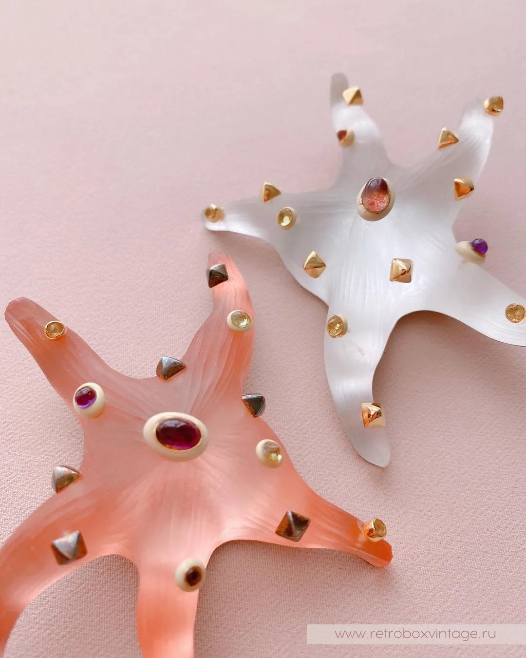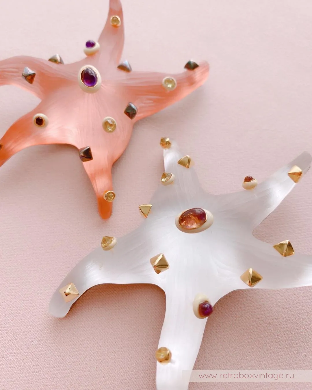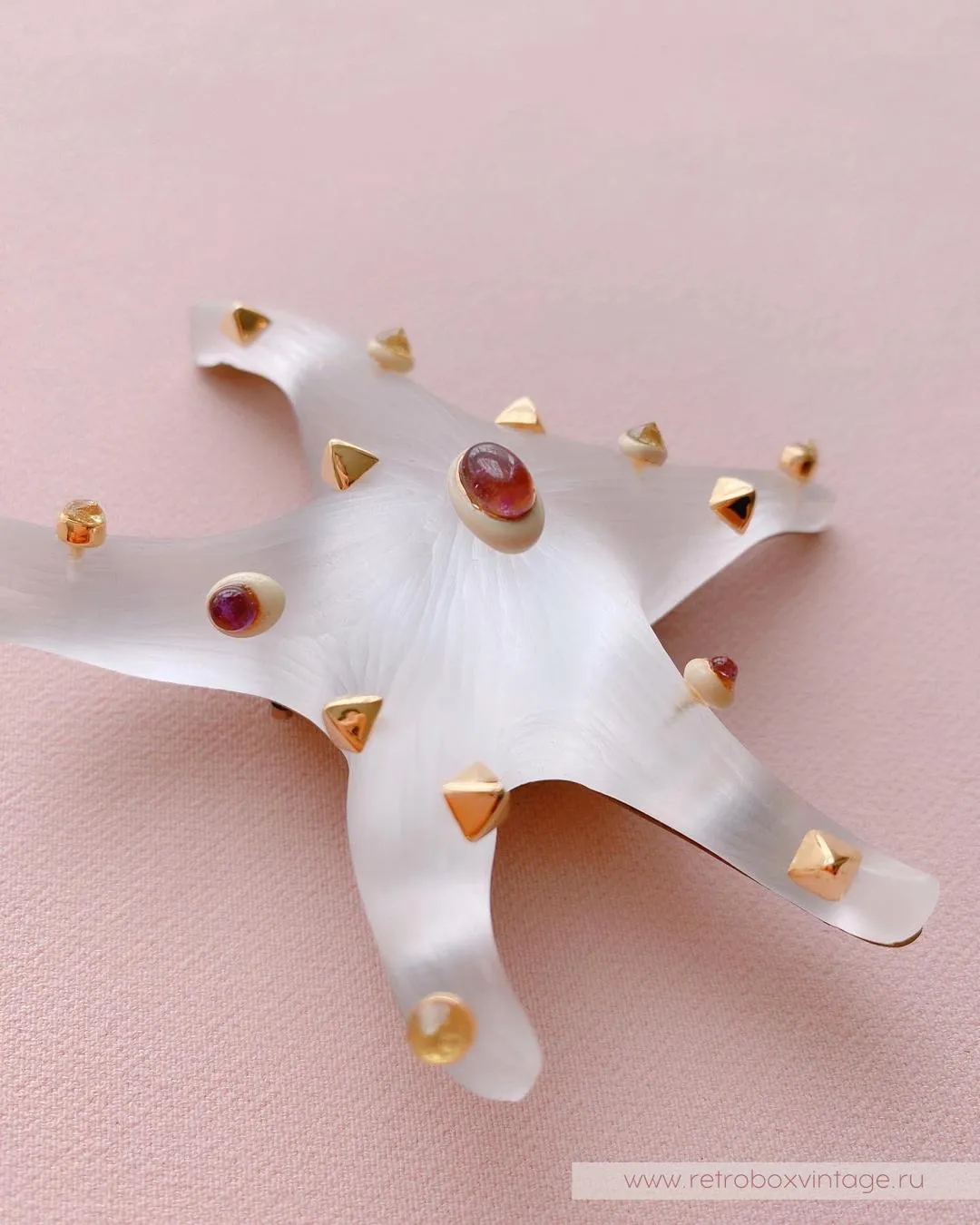 Морская звёздочка Алексиса Биттара, судя по всему, невероятно «общительная». Её обтекаемая форма, нежный коралловый окрас и мерцающий тёплым светом люцит не останутся не замеченными. А причудливые вставки из леденцово-радужных кабошонов и пирамидок металла подобно ярким вспышкам будут освещать серость городских будней, обращая на себя любопытные взгляды.