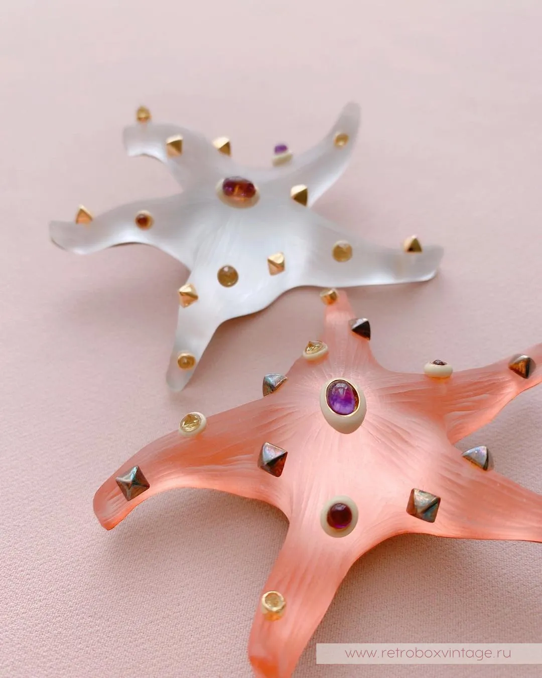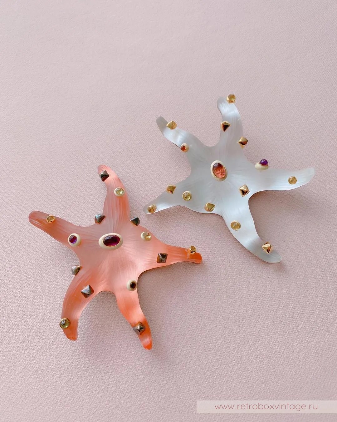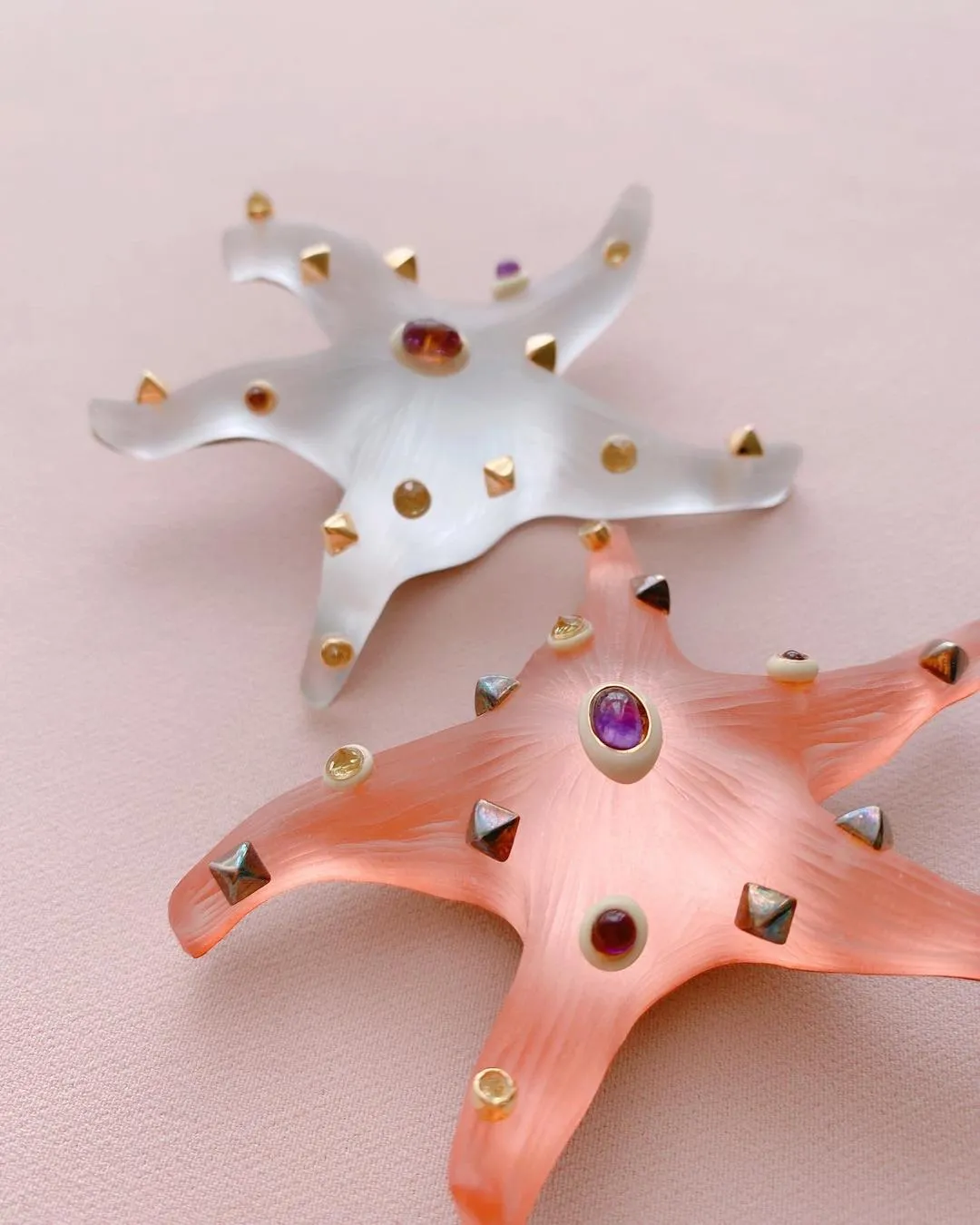 Морская звёздочка Алексиса Биттара, судя по всему, невероятно «общительная». Её обтекаемая форма, нежный коралловый окрас и мерцающий тёплым светом люцит не останутся не замеченными. А причудливые вставки из леденцово-радужных кабошонов и пирамидок металла подобно ярким вспышкам будут освещать серость городских будней, обращая на себя любопытные взгляды.