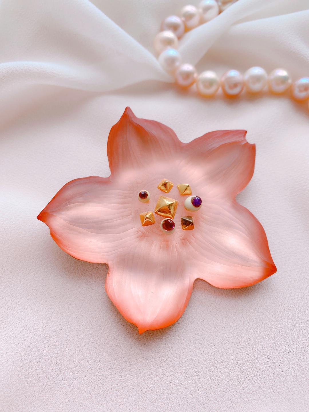 Красивый образ рассветного цветка часто можно встретить в литературе и живописи. Так поэты иногда называют солнце, которое на заре окрашивается в самые невероятные оттенки.В исполнении ALEXIS BITTAR цветок выглядит не менее выразительно. Брошь будто излучает тепло и свет. Переливы на ее лепестках играют подобно лучам рассветного солнца.Нежный персиковый оттенок плавно перетекает в розовый, а затем в красивый насыщенный огненный тон, которые словно вспыхивают на кончиках цветка рассвета.