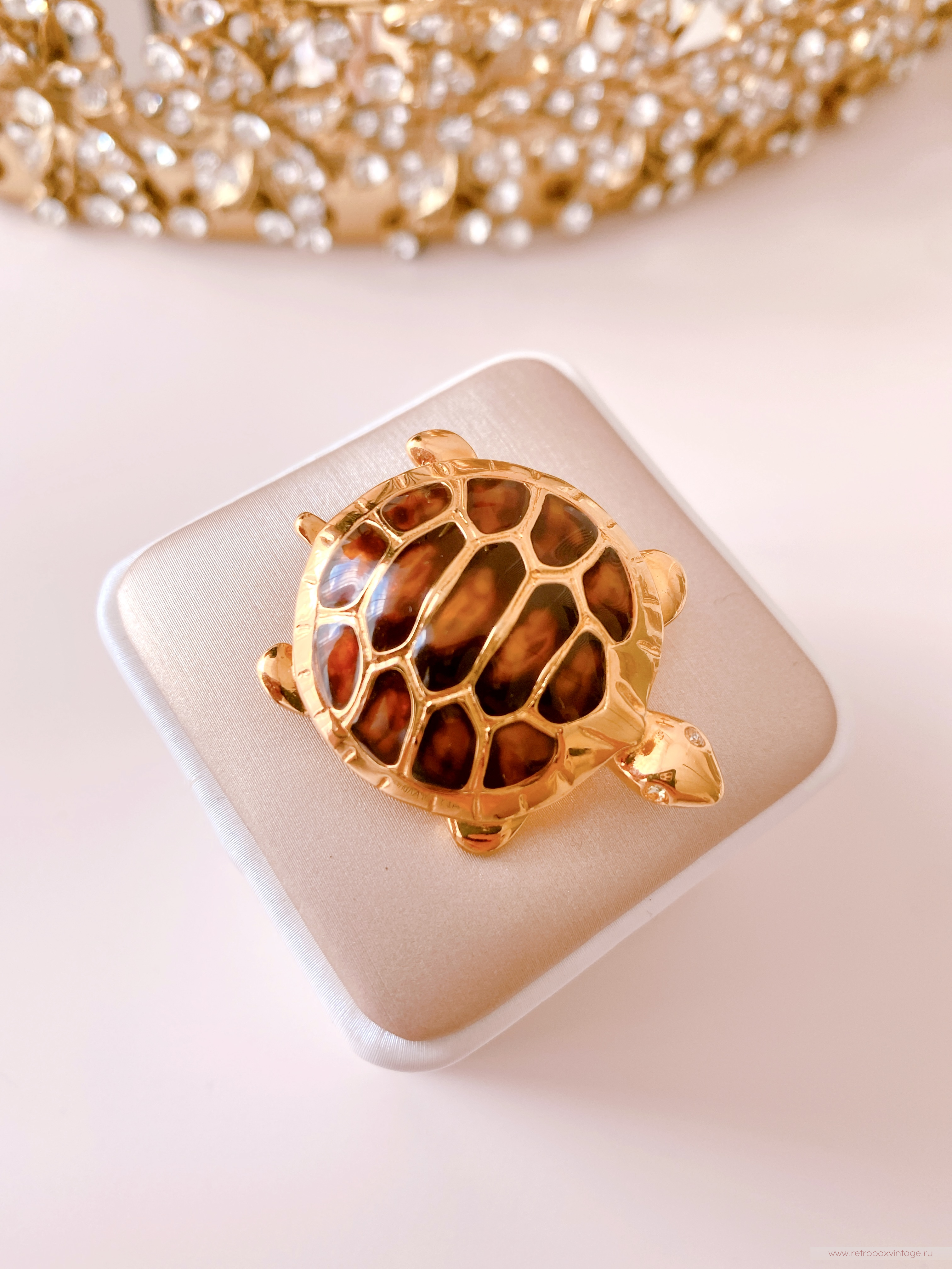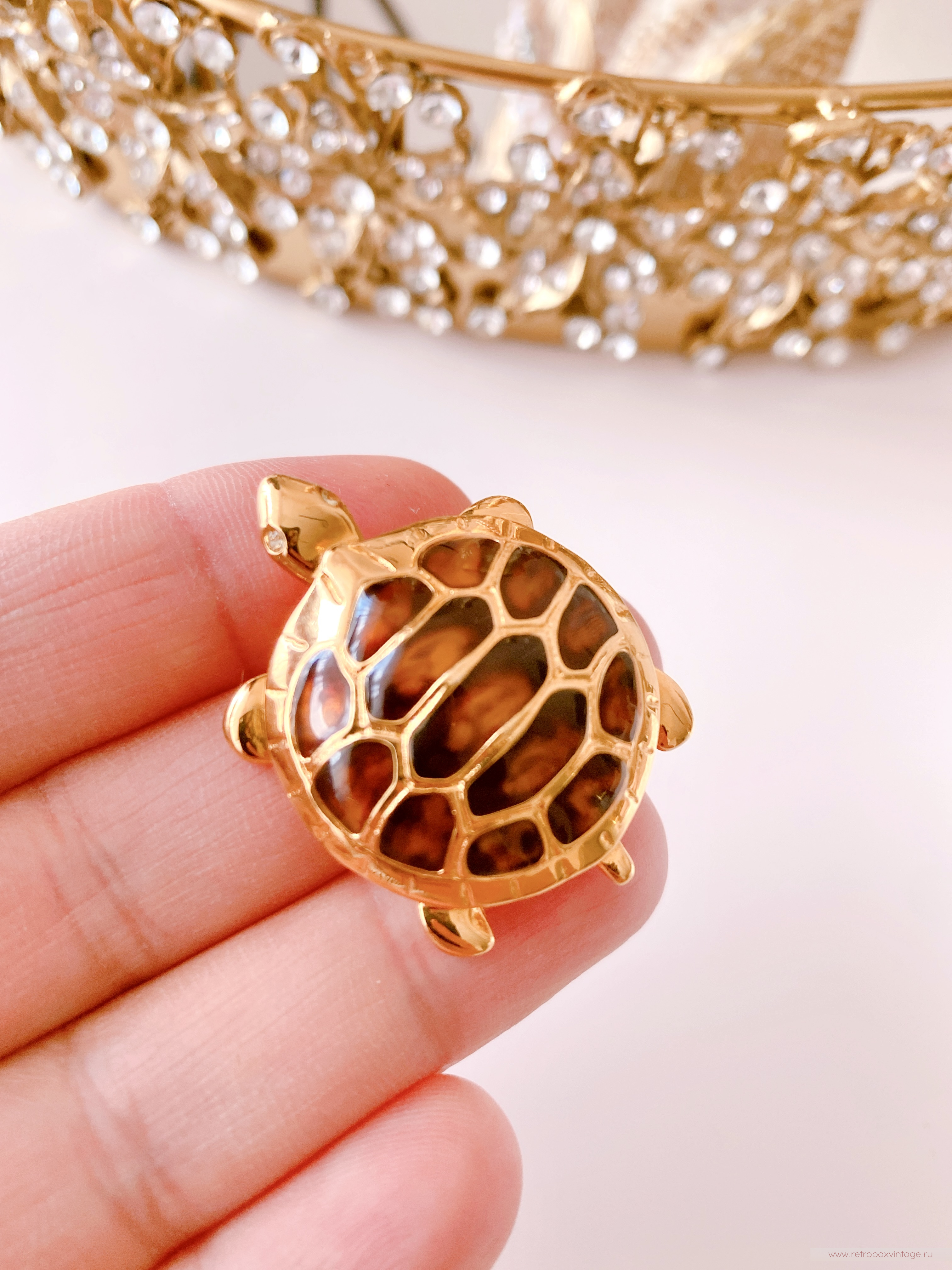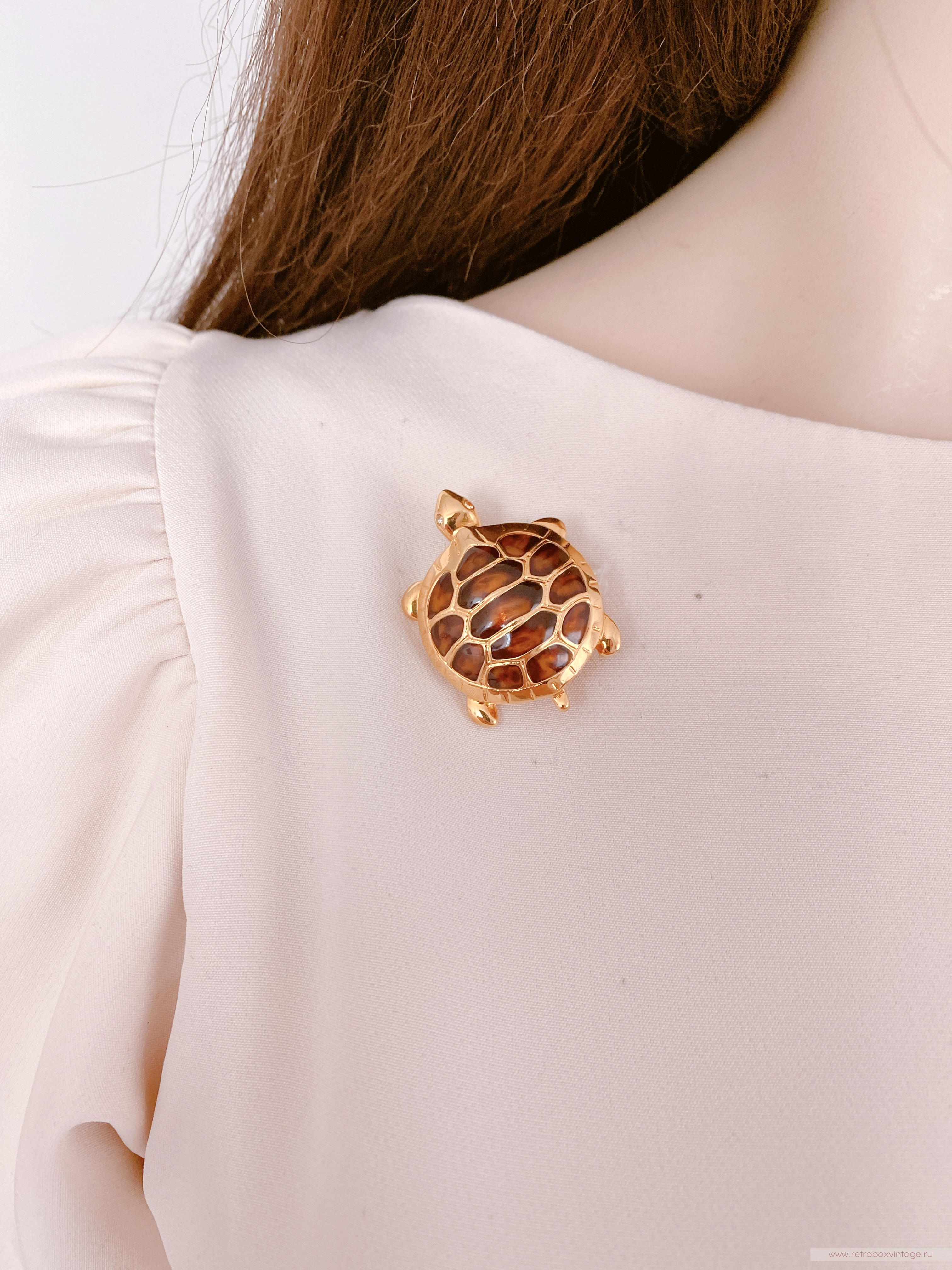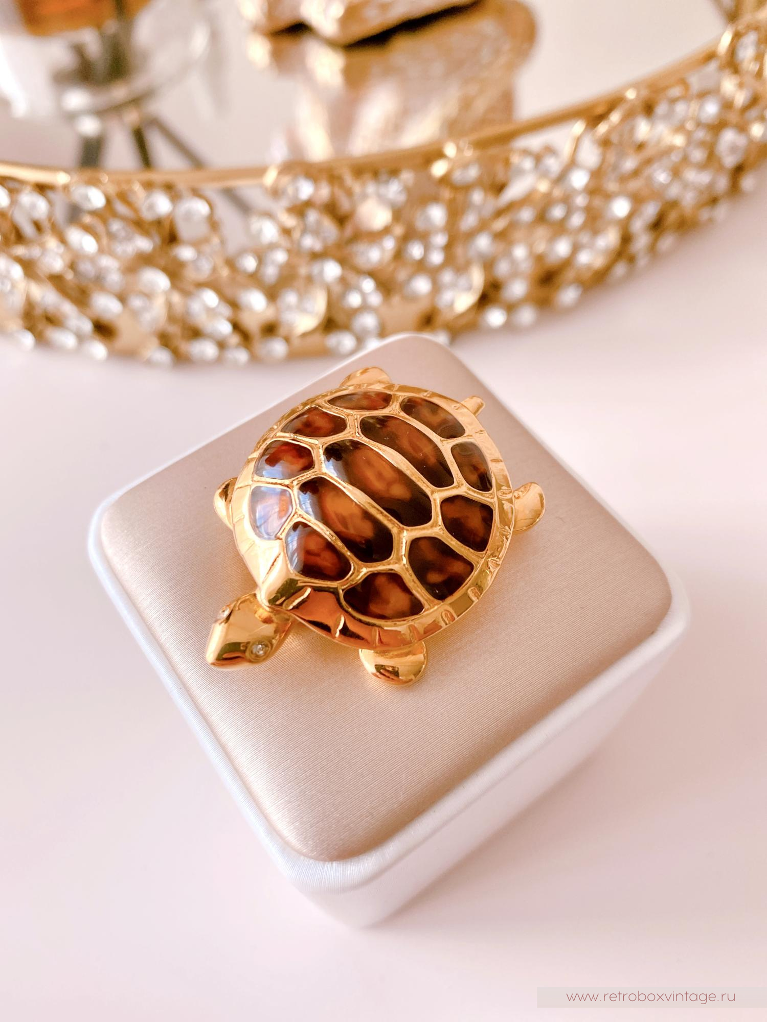Панцирь черепашки выполнен в насыщенном коричневом черепаховом цвете с использованием ювелирной смолы, что создает эффект глубины и натуральности. Он эффектно сочетается с изящной позолотой контура, придавая броши стильный и современный вид.