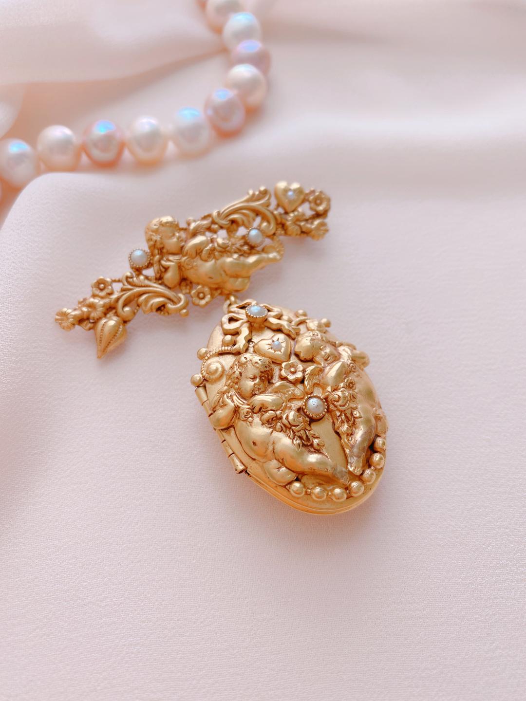 Античный миф про маленьких «путти», как ласково называли братьев-ангелочков, особенно любили художники и ювелиры эпохи Возрождения. Сказке о Любви и Страсти мы обязаны множеством забавных фигурок и украшений с озорными младенцами, которые и в наши дни не перестают нас умилять.До чего же очаровательно смотрятся братья-ангелочки в этой винтажной броши ASKEW LONDON. Как и сюжет украшения, форма его также пришла к нам из эпохи Ренессанса. Именно тогда появились первые подвесы с открывающимися дверцами – локеты. Золотое покрытие и отделка жемчужинами – это тоже своего рода дань традиции. Ведь локетами в эпоху Рафаэля обладали дамы из высшего общества.