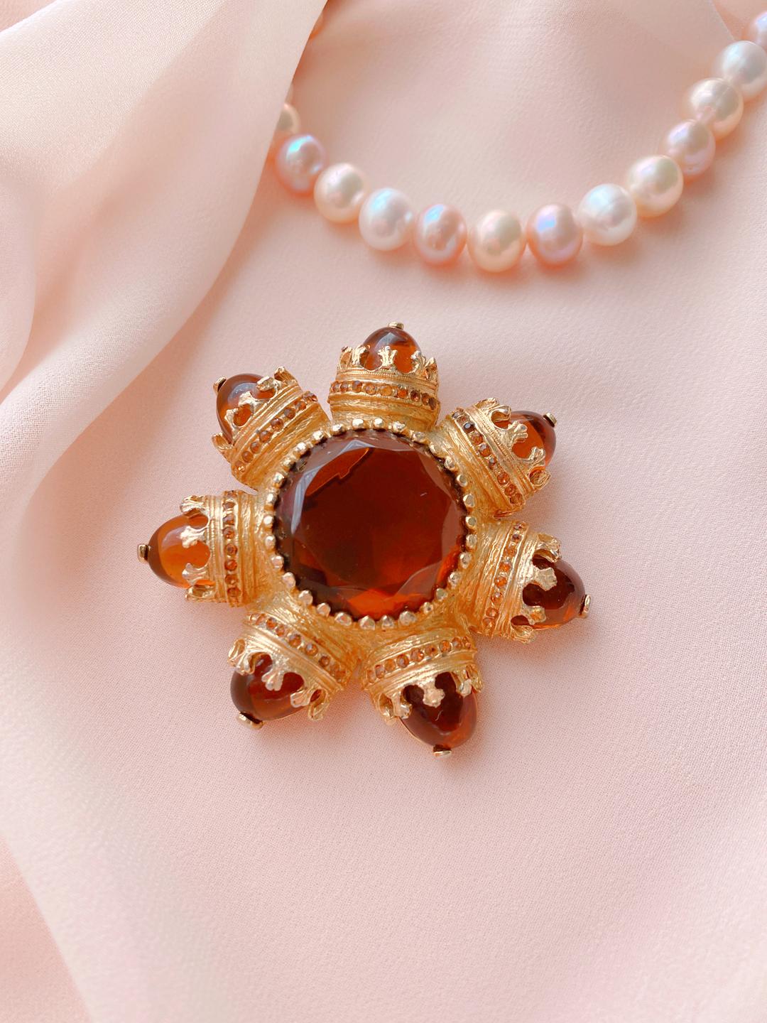 Сочетание золотого цвета оправы с теплым коньячным оттенком кристаллов и кабошонов выглядит невероятно благородно. В свете лучей этой царственной звезды вы сами будете выглядеть элегантно и торжественно. А ваш превосходный вкус непременно оценит окружение.