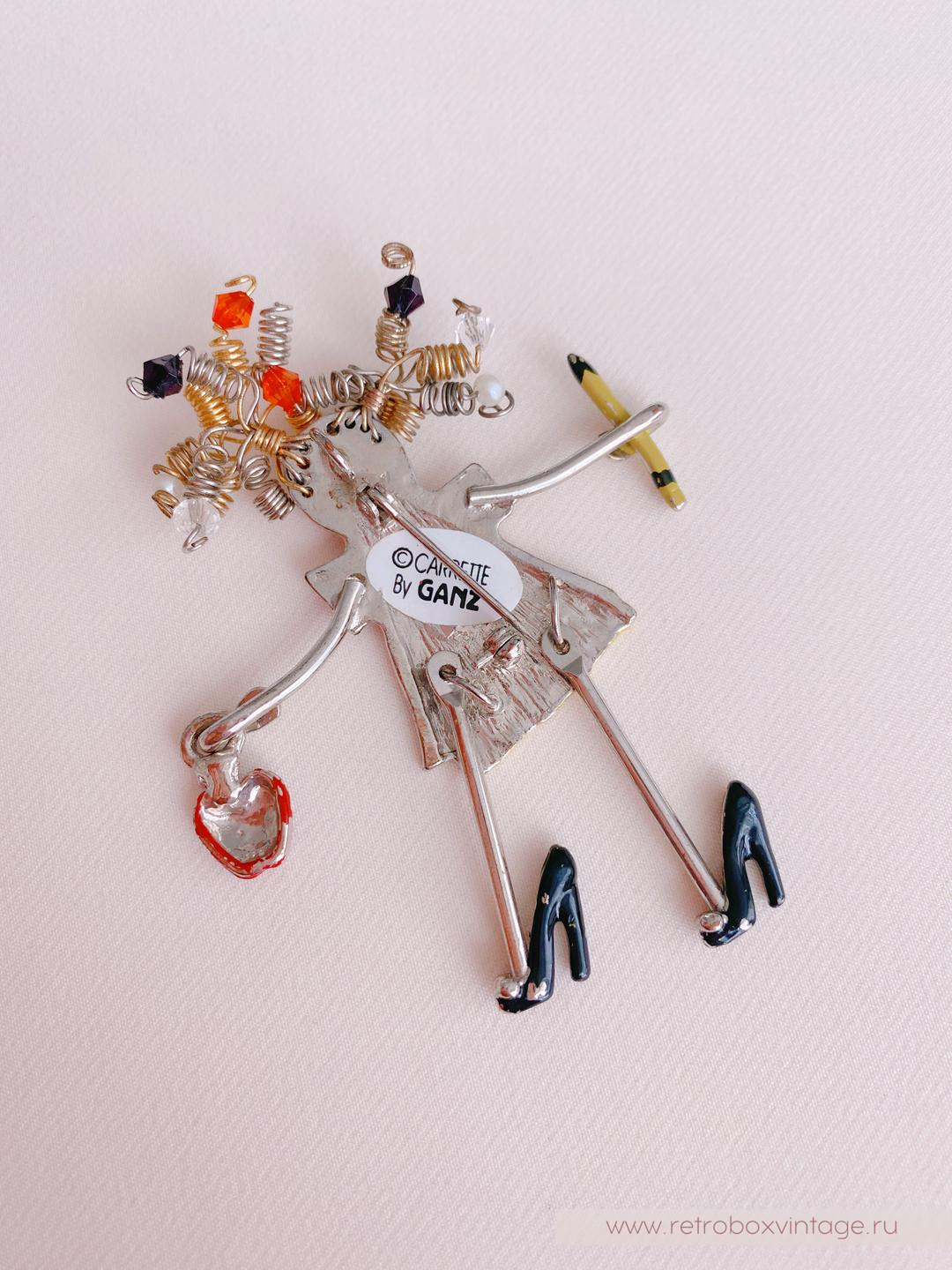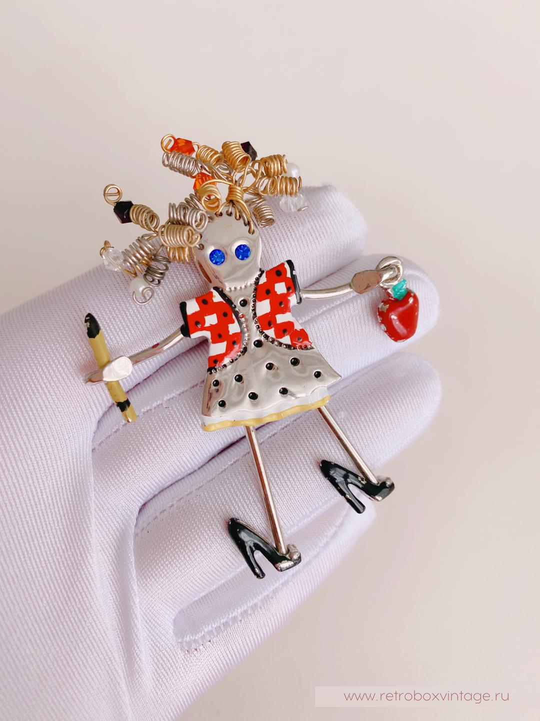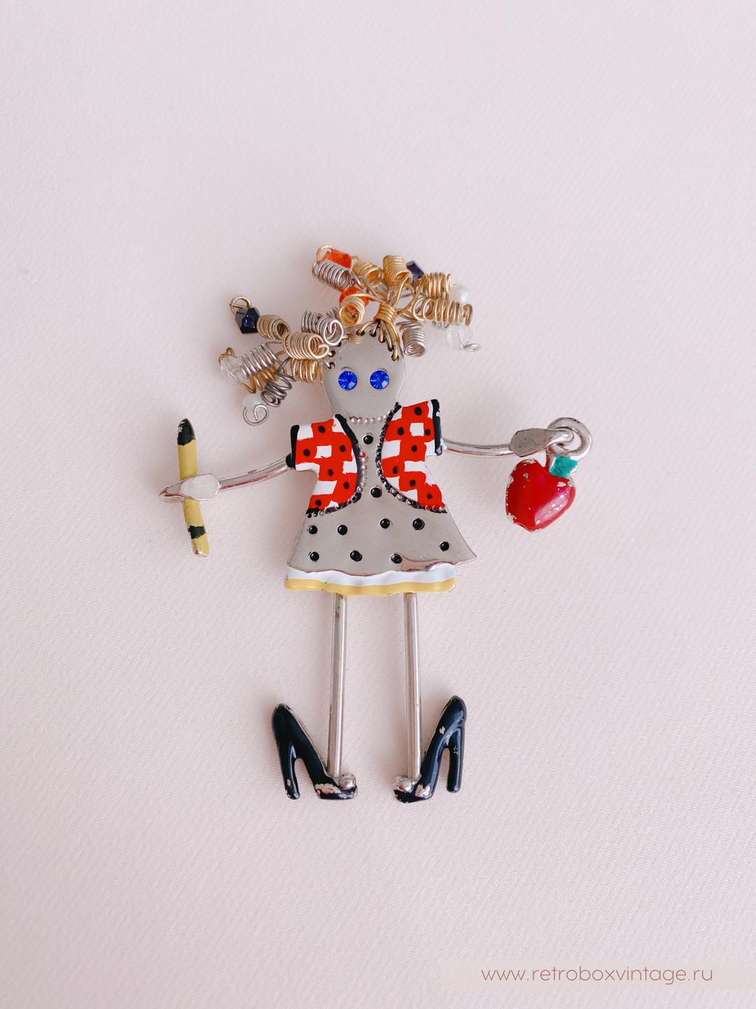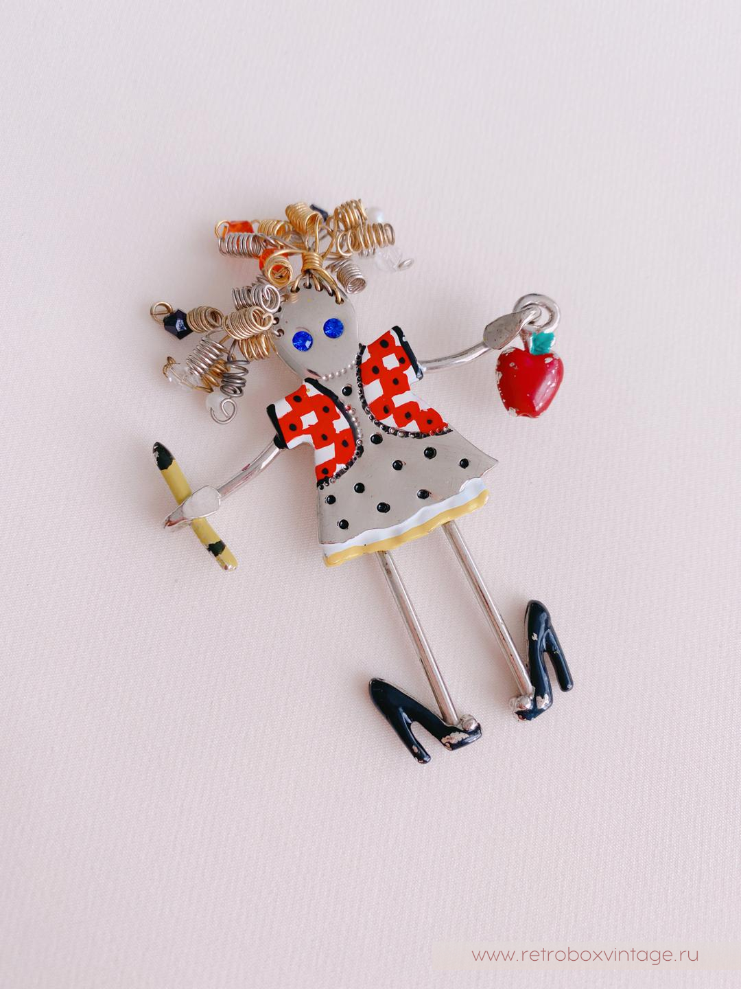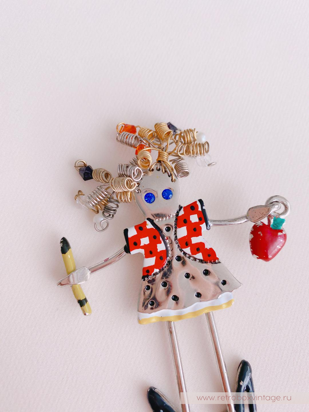 Согласитесь, иногда украшения способны поднять настроение и зарядить нас позитивной энергией на весь день. Специально для таких случаев у меня для вас есть милейшее винтажное украшение – брошь в виде учительницы американской компании CARRETTE BY GANZ.Эта очаровашка из лимитированной серии “Up Town Brats” выполнена из сплава цвета полированного серебра. Глядя на ее шкодливые завитушки-пружинки, невольно улыбаешься, и вспоминаешь детские непослушные пряди. Ее ножки-подвесочки раскачиваются в такт вашим движениям и, кажется, что крошка вот-вот пустится в пляс.