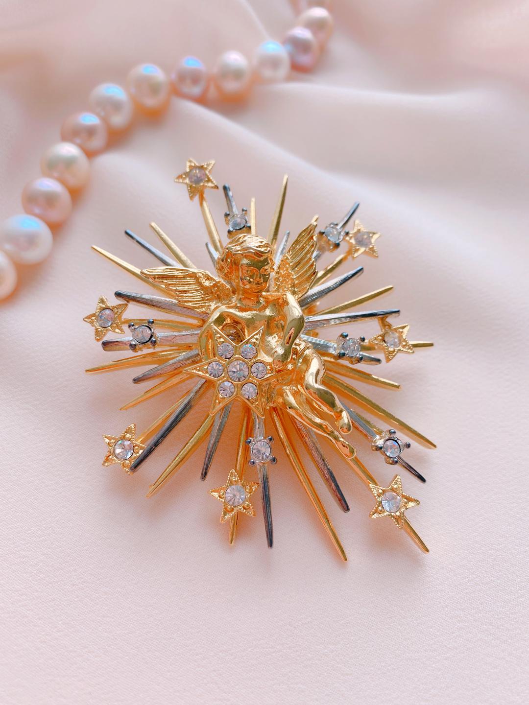 Ангел в окружении звезд выполнен вручную. Звезды декорированы чистейшими австрийскими кристаллами. Взгляните, как оригинально в дизайне броши представлен свет, исходящий от херувима.Редкое сочетание двух металлов в одном украшении! Серебряные и золотистые лучи с миниатюрными звездами на конце символизируют силы и поддержку ангела-хранителя, которыми он готов поделиться с вами.Желаете ангельский талисман в свою коллекцию?