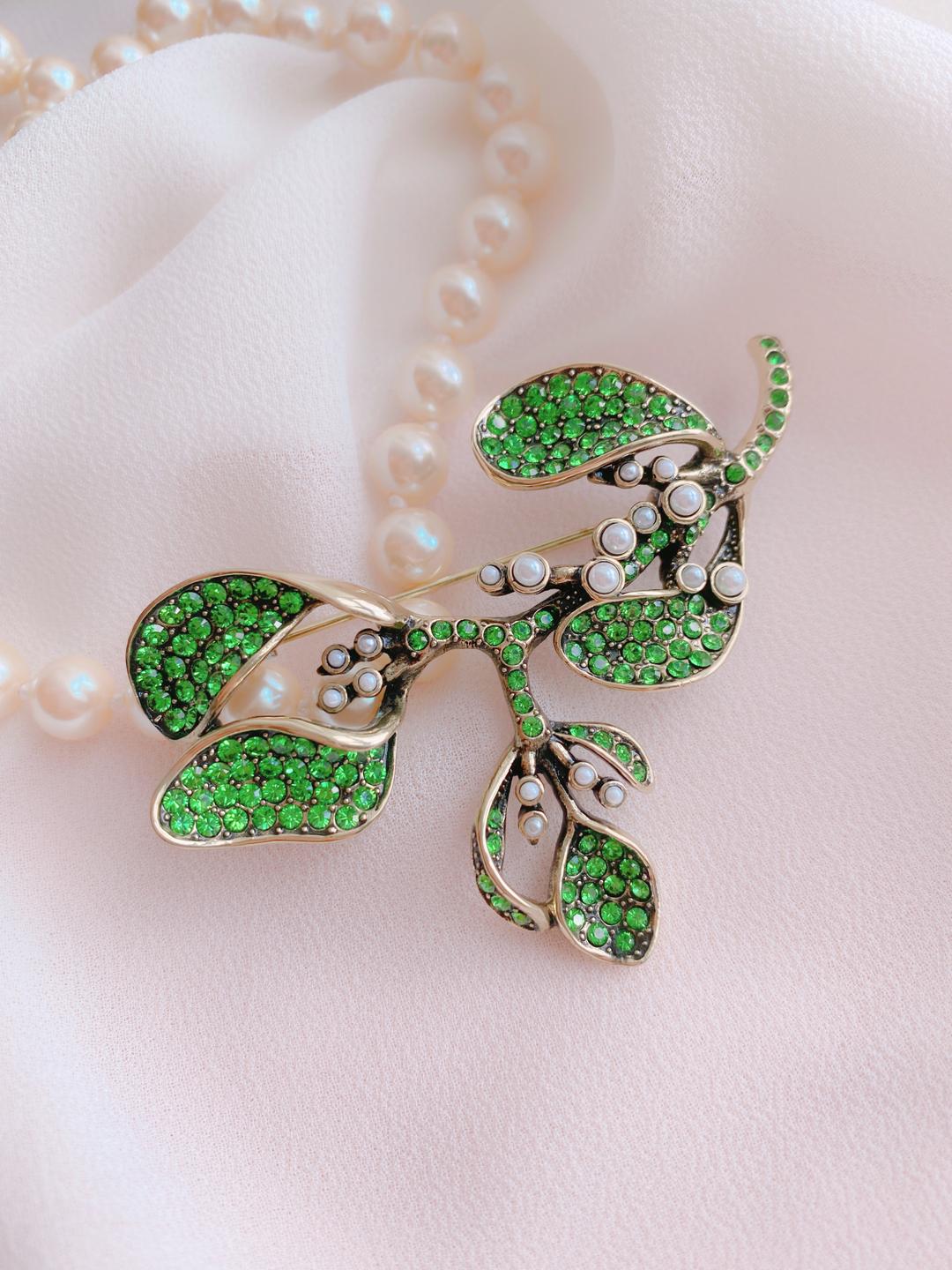 В ответ на этот вопрос HEIDI DAUS создала удивительно нежное украшение, которое так и назвала «Праздничные поцелуи».Мы видим, сколько любви и заботы вложено в эту брошь. Каждый листочек на веточке дышит свежестью и очарованием молодой весенней зелени. Мелкие кристаллики, утопленные в металл в технике паве, образуют единый изумрудный покров, который изящно мерцает на свету. Бутоны-жемчужинки повествуют о том, что скоро наступит прекрасная пора цветения.