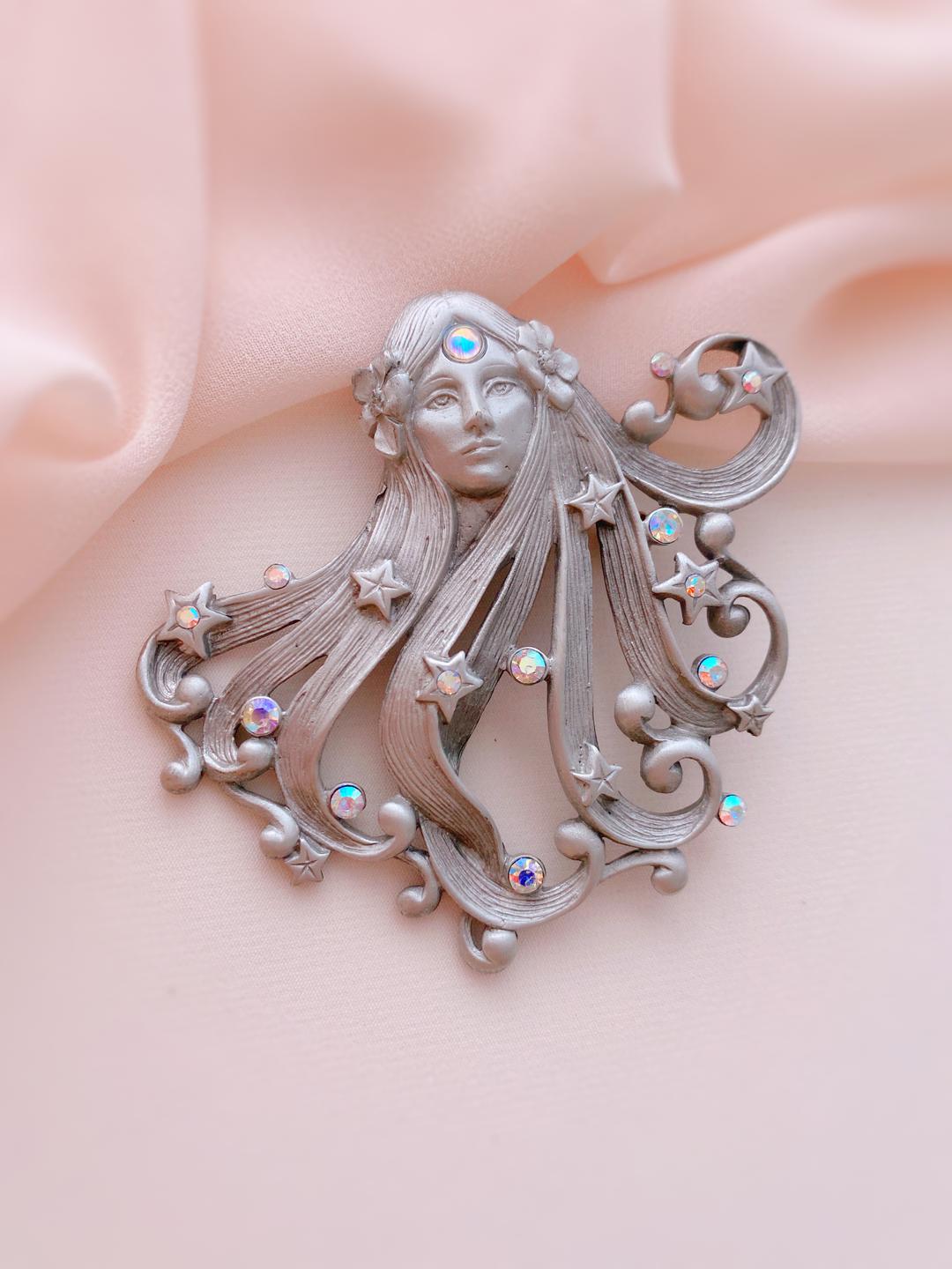 Познакомьтесь с шедевром бижутерного искусства — брошью «Принцесса звезд» от легендарного бренда JONET JEWELRY. Эта утонченная брошь, выполненная в лучших традициях ар-нуво, моментально притягивает взгляд и пленяет своим волшебным образом. Нежный силуэт девушки с развевающимися волосами, усыпанными звездами, словно рассказывает историю о сказочной героине, несущей свет и красоту.