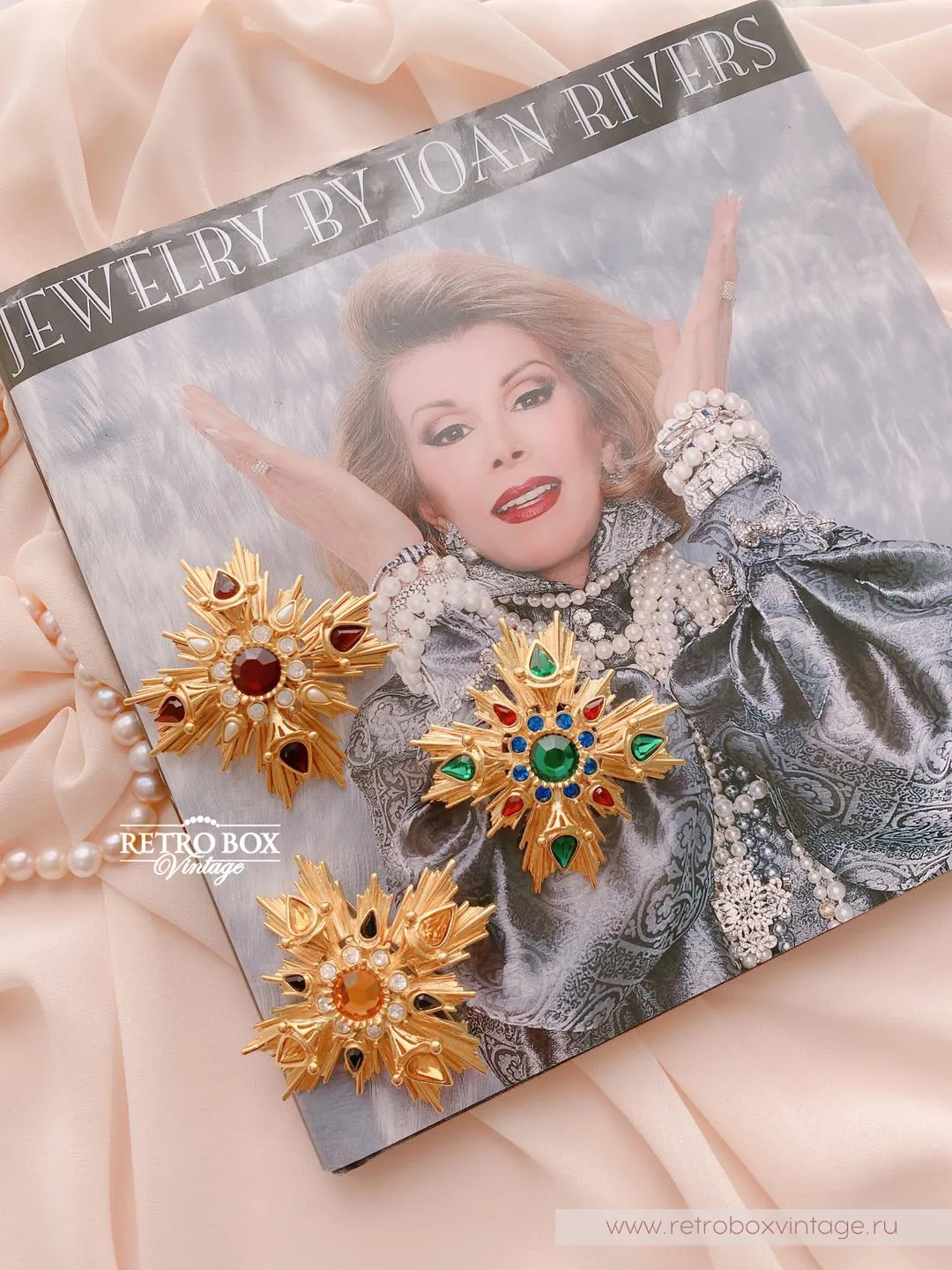 Эффектные, торжественные и невероятно притягательные украшения, они будто сошли с портретов великих императриц. Роскошь золотого покрытия изысканно подчеркнута австрийскими кристаллами высочайшего качества. Цветовое сочетание кристаллов цвета граната и немного жемчуга не оставляет сомнения в исключительной элитарности этих украшений. Украшения невероятно яркие и статусные; являются частью коллекции геральдической линейки украшений, которой особо гордилась Джоан. Не зря этим брошам уделена отдельная страничка в знаменитой книге-каталоге Джоан Риверс.