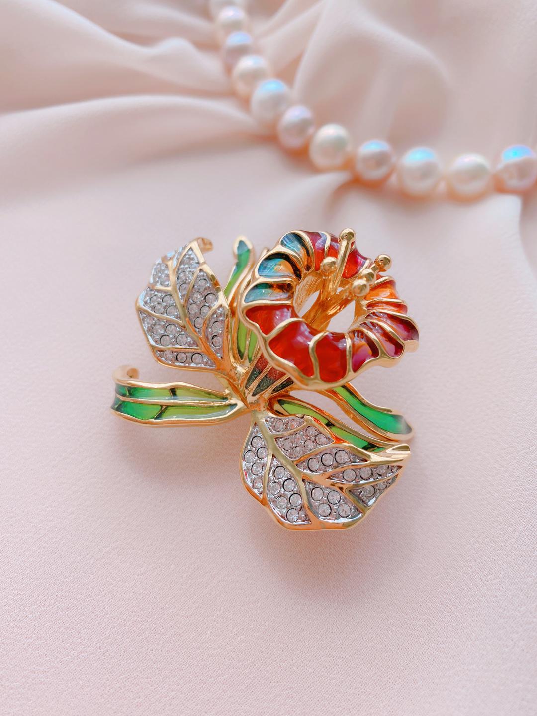Прозрачные цветные эмали залиты между перегородками броши и, если поднести их к свету, напоминают переливчатые витражи.Глядя на них я вспоминаю известные творения TIFFANI. Такая же непревзойденная игра света чувствуется в лепестках и листьях броши. Алмазный блеск кристаллов в золотом покрытии листьев дополняет композицию и придает украшению ослепительный вид, достойный сравнения с драгоценным изделием.