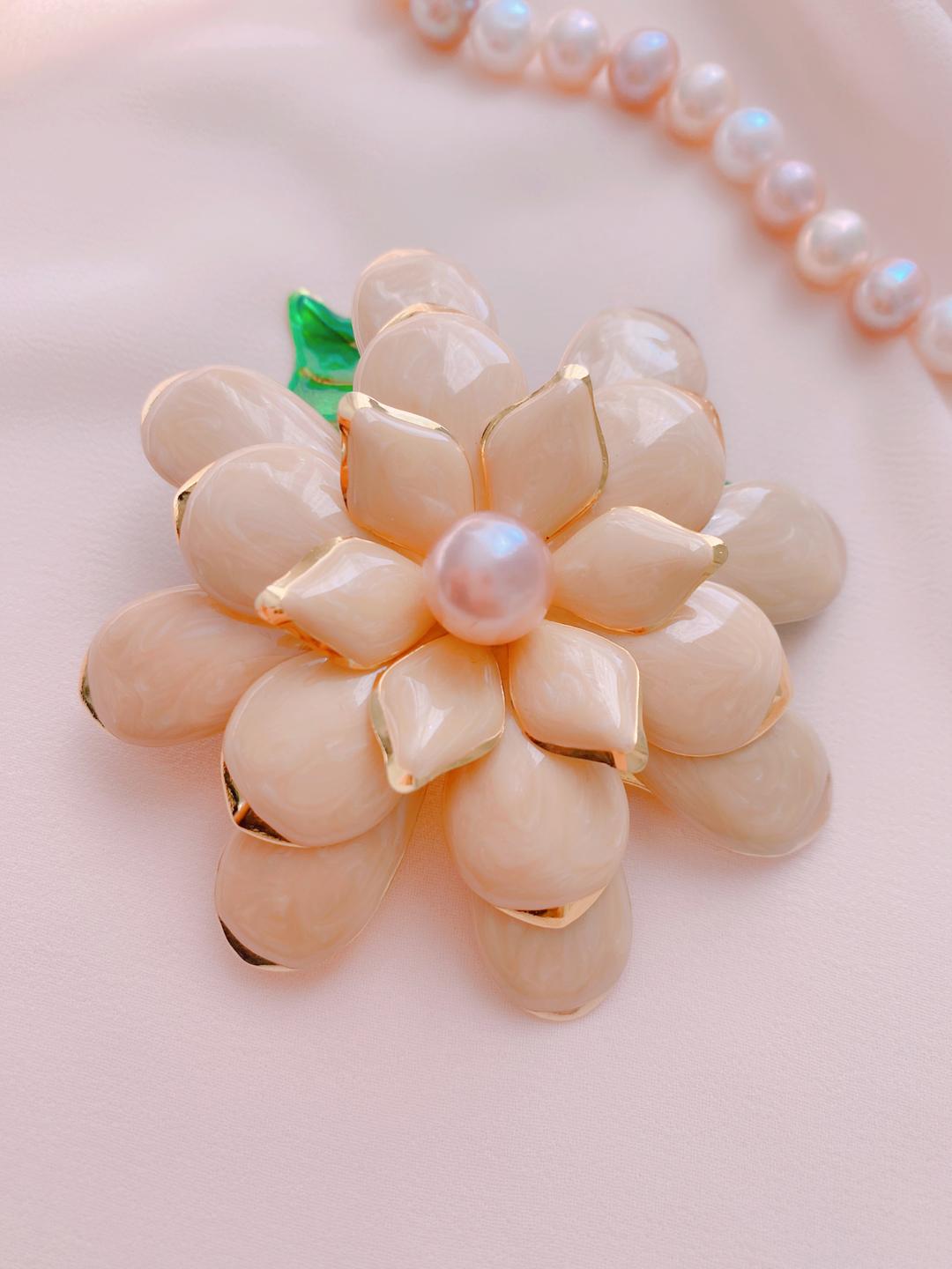 Эта брошь не раз дополняла образ самой Джоан. Украшение из личной коллекции дизайнера особенно интересно держать в руках. Ведь оно отражает внутренний мир автора, его картину мира.Брошь объемная, женственная и нежная. Кремового-пудровый оттенок эмали с перламутровым шимером смотрится очень сочно, выразительно и невероятно притягательно. Кажется, будто художник только что раскрасил цветок, и краски еще не высохли – так естественно и первозданно они сияют.