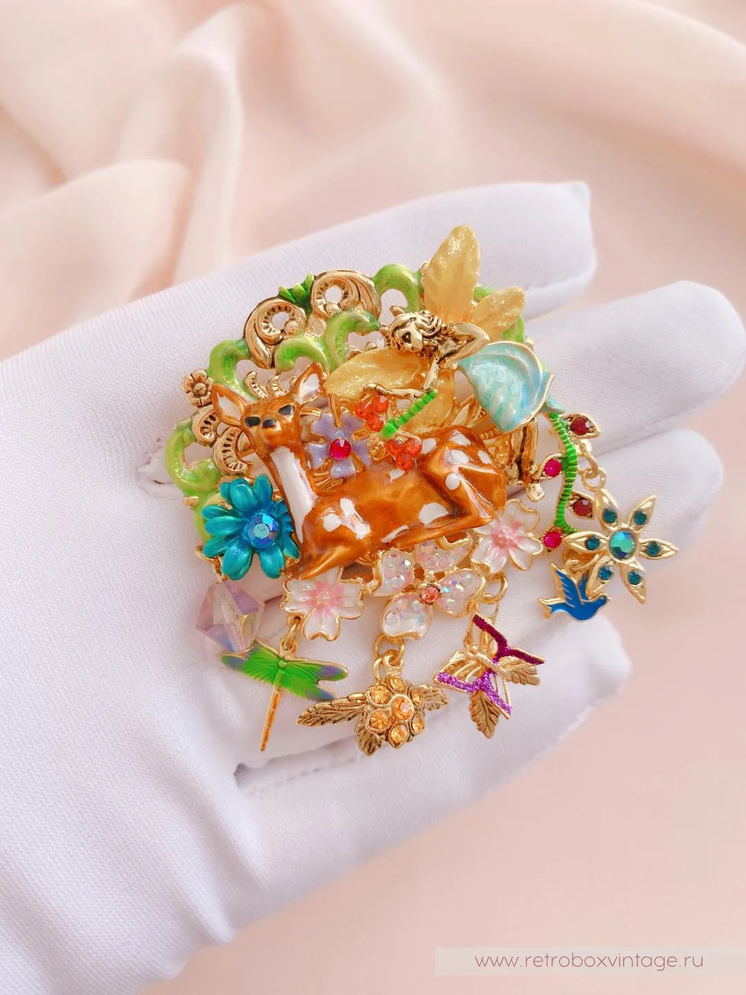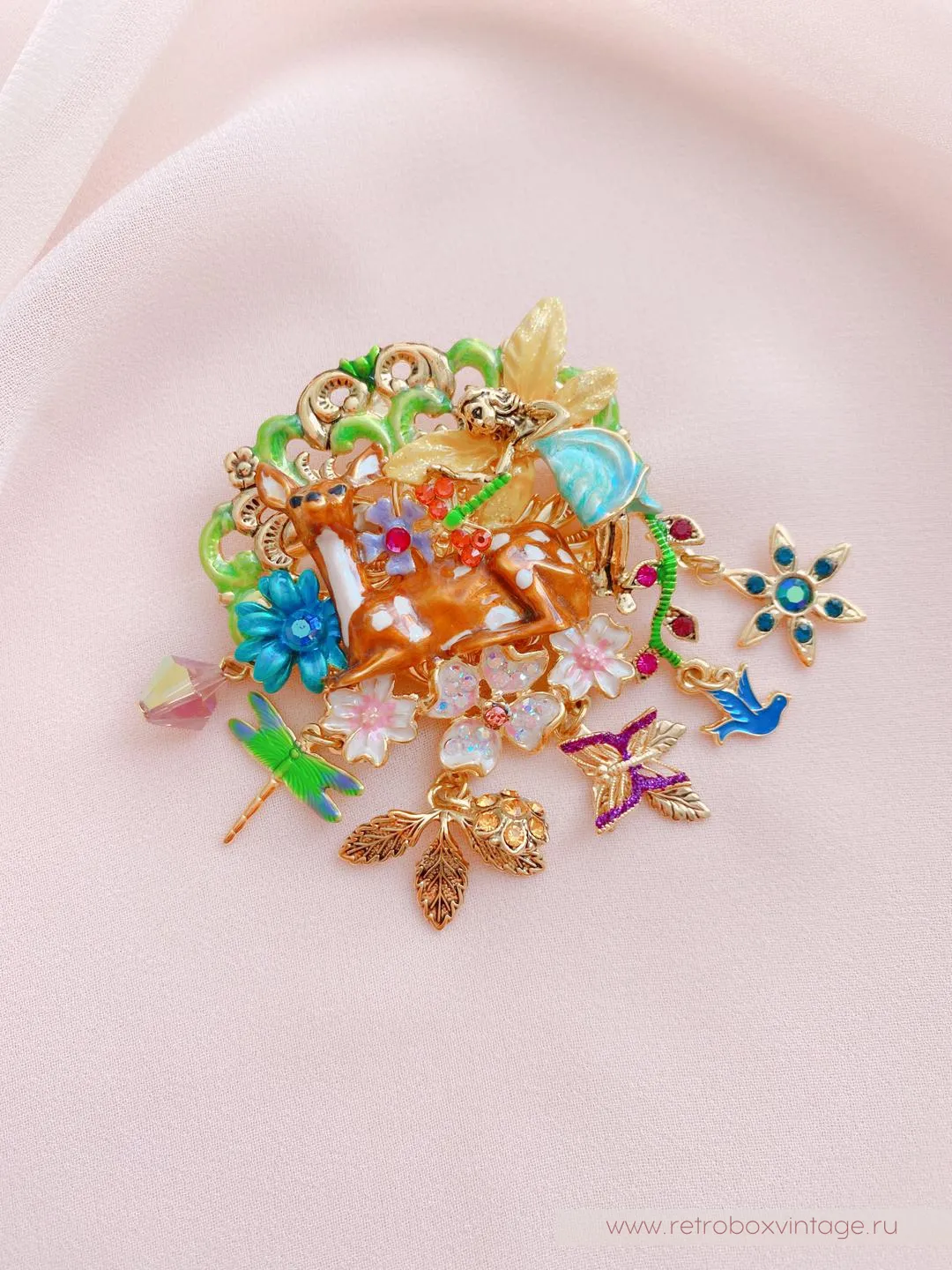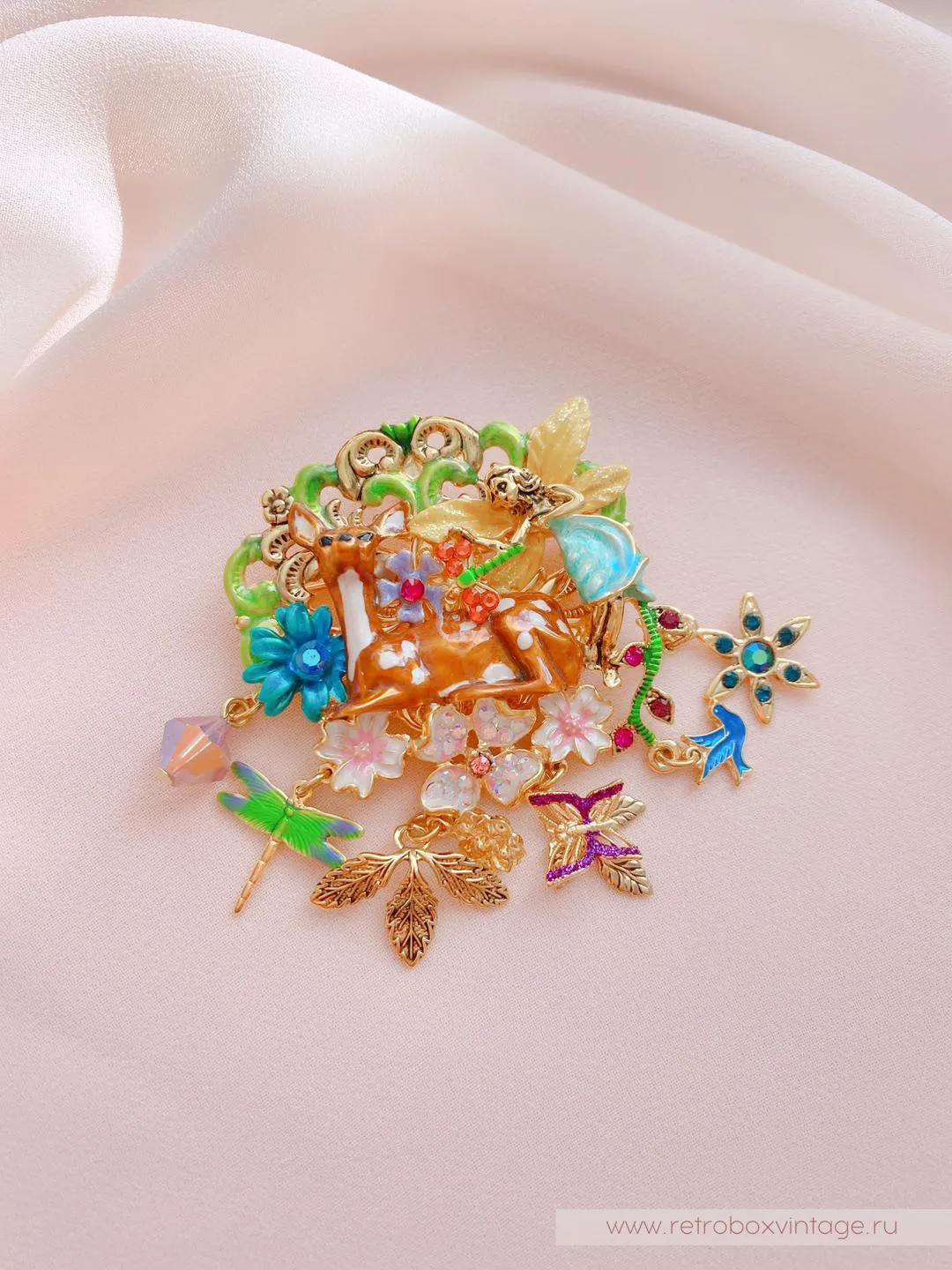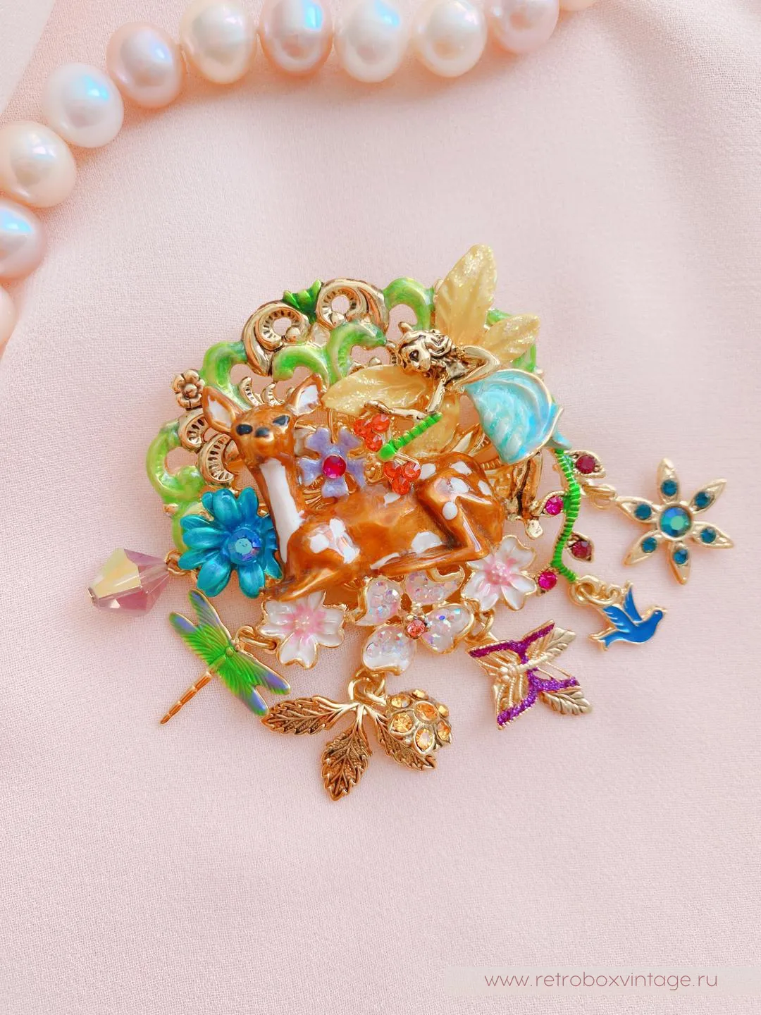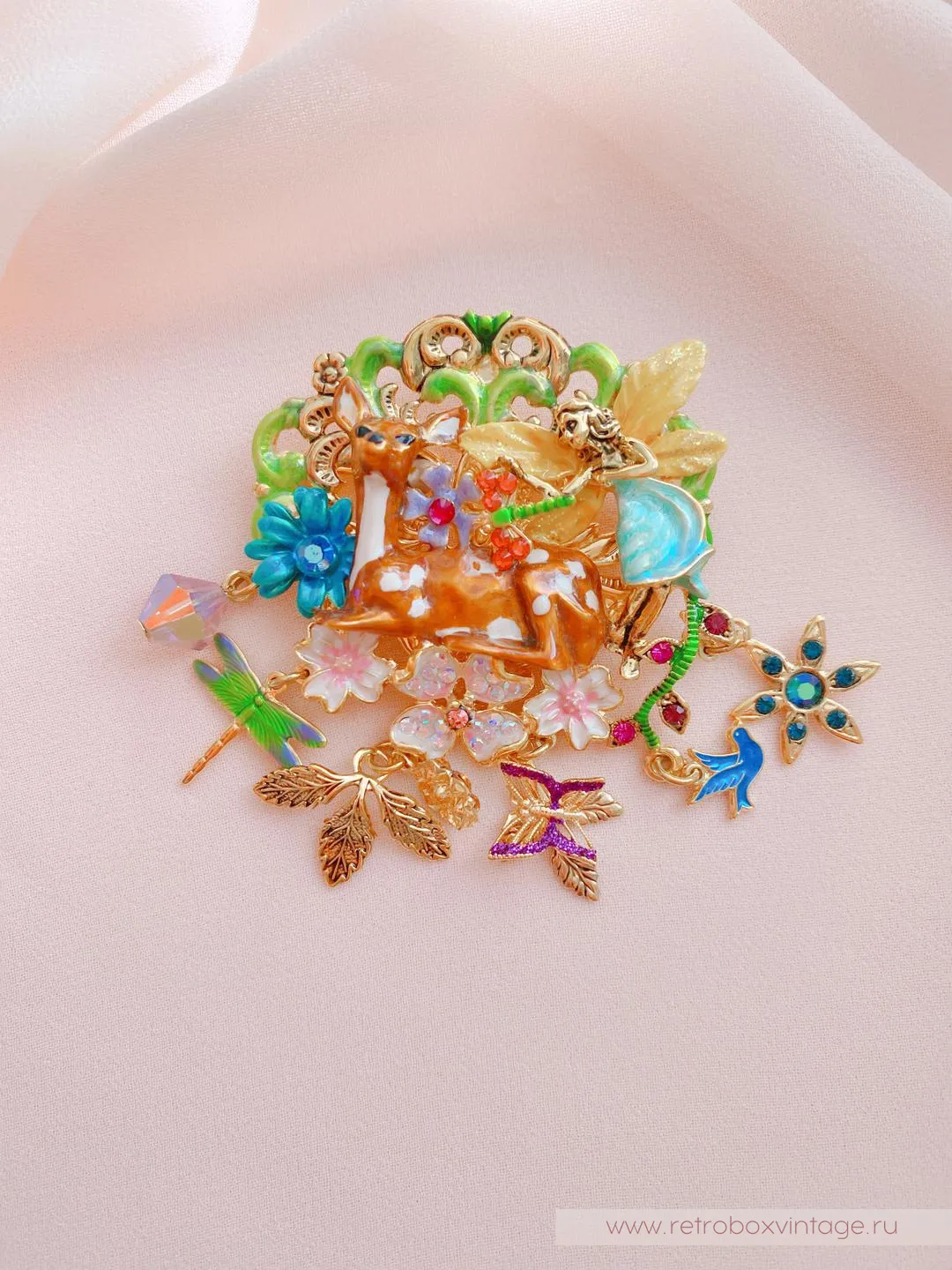 Оленёнок и фея выполнены реалистично в объёме.Шармы-подвески этой броши совершенно очаровательны: стрекозы, бабочки, цветы, птицы... Особого внимания заслуживает филигранная основа броши - даже на обороте она прекрасна. Олень — это благоприятный символ, ассоциирующийся с Солнцем, восходом, светом, чистотой, обновлением, возрождением, созиданием и духовностью.