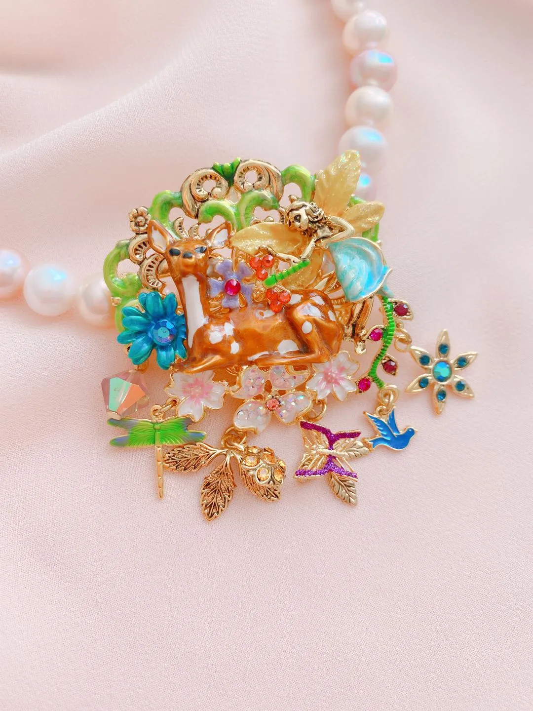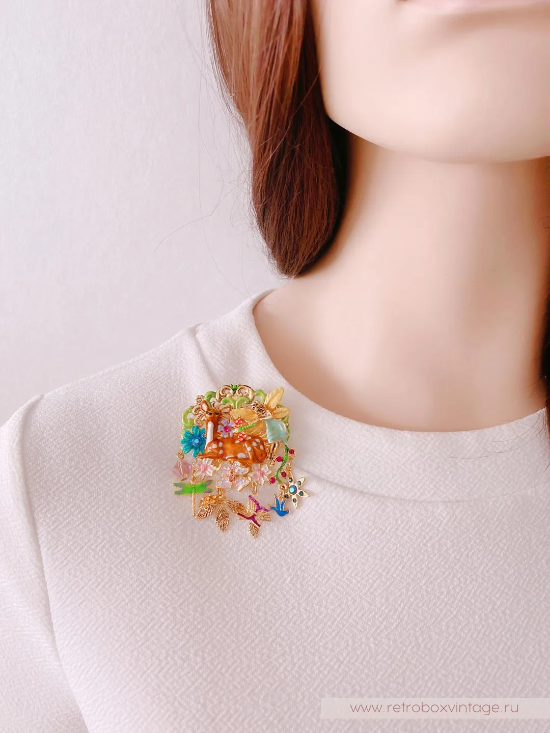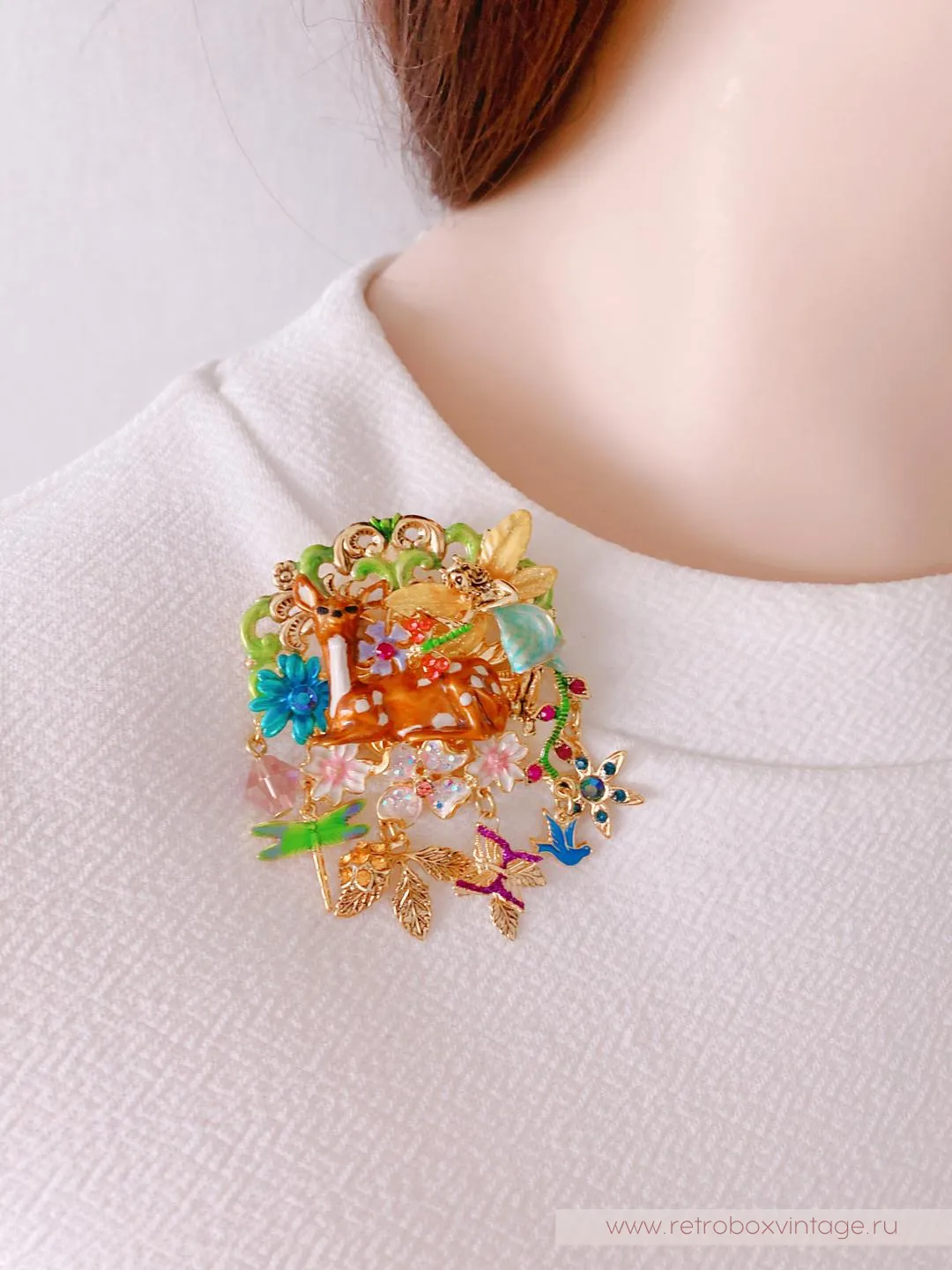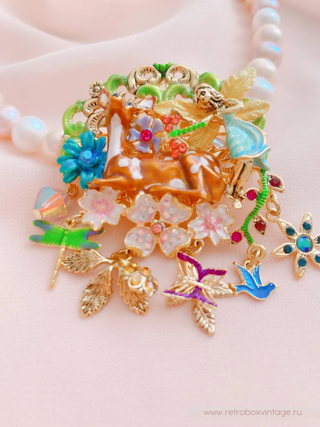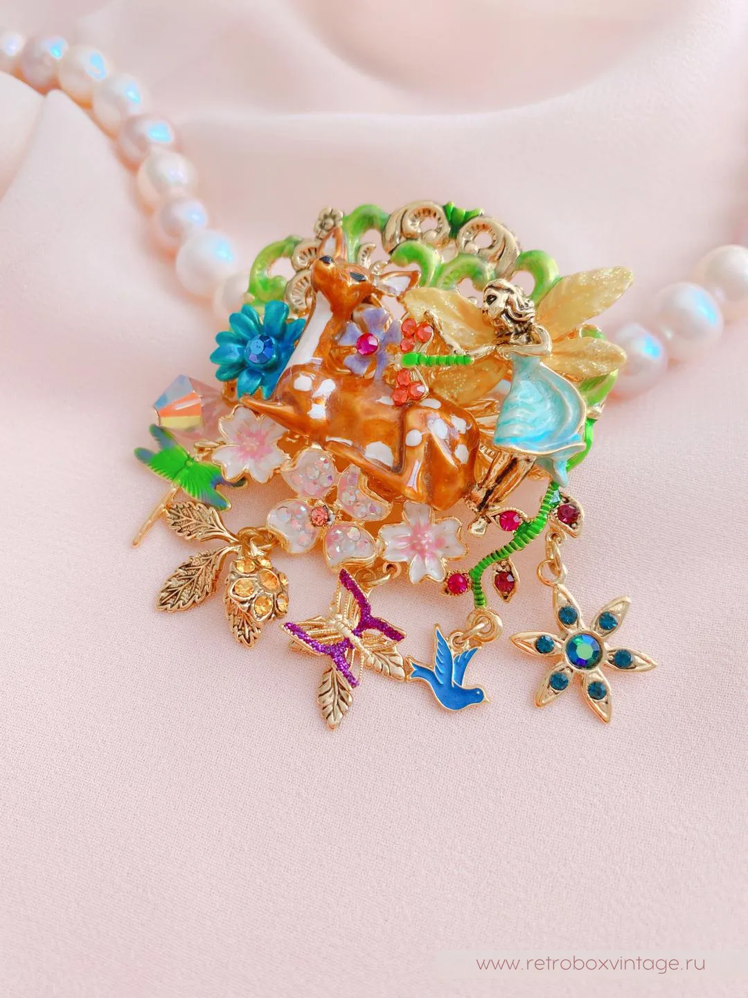 Оленёнок и фея выполнены реалистично в объёме.Шармы-подвески этой броши совершенно очаровательны: стрекозы, бабочки, цветы, птицы... Особого внимания заслуживает филигранная основа броши - даже на обороте она прекрасна. Олень — это благоприятный символ, ассоциирующийся с Солнцем, восходом, светом, чистотой, обновлением, возрождением, созиданием и духовностью.