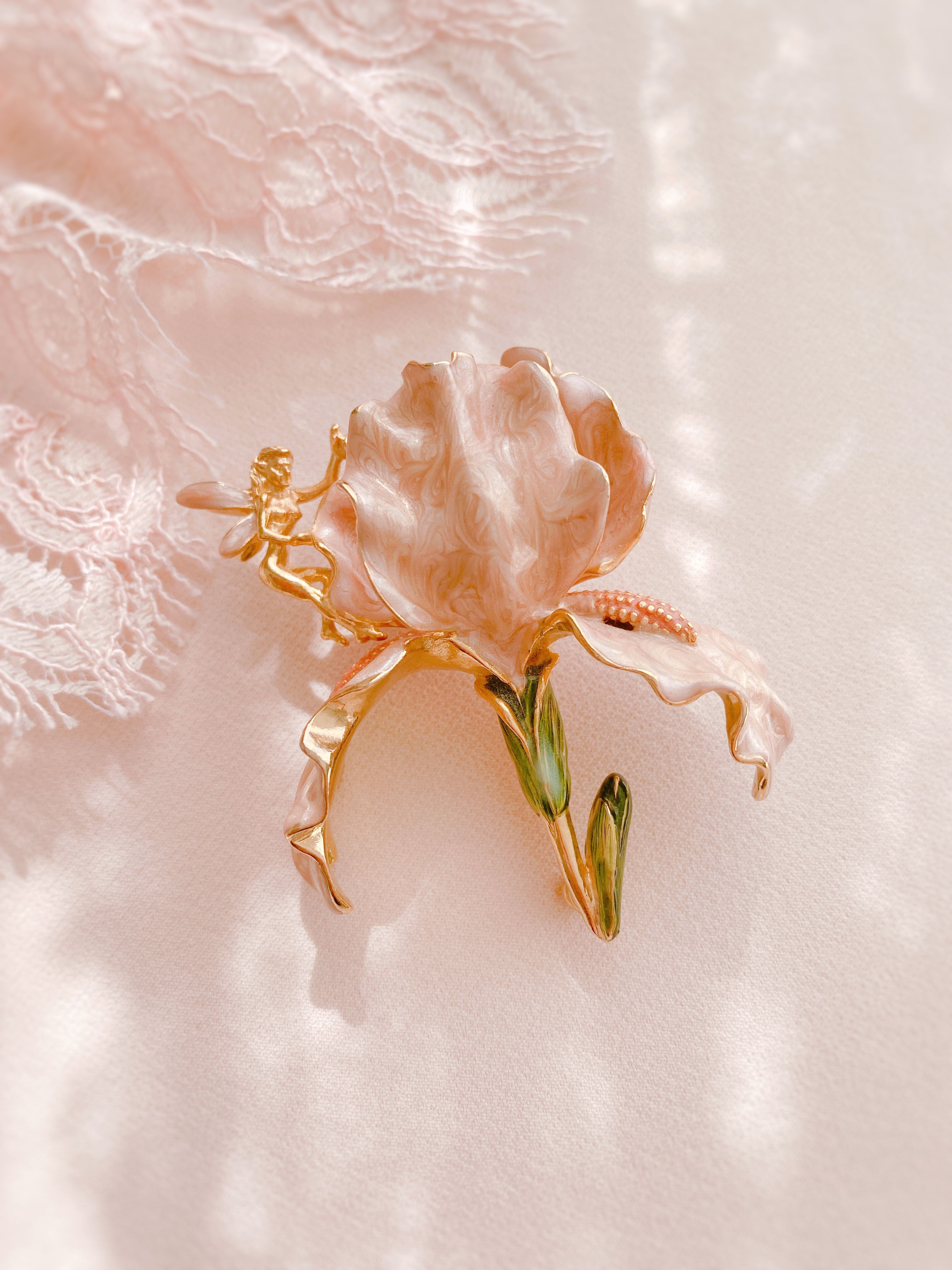 Изысканная, как первый луч зари, и редкая, как утренняя роса в садах фей, эта брошь — жемчужина культовой коллекции «Феи Цветов». Пудрово-бежевый ирис, словно сотканный из лунного света, раскрывает лепестки с нежностью шёпота. Их поверхность, покрытая многослойной эмалью с мерцающими переливами, хранит секрет мастеров Kirk’s Folly — техники, утраченной для современного мира. На цветке восседает фея, чьи крылья сияют, как созвездия, сплетённые из звёздной пыли. Это не просто украшение, а редчайший артефакт, о котором мечтают коллекционеры: лишь немногие могут похвастаться обладанием этим сокровищем.