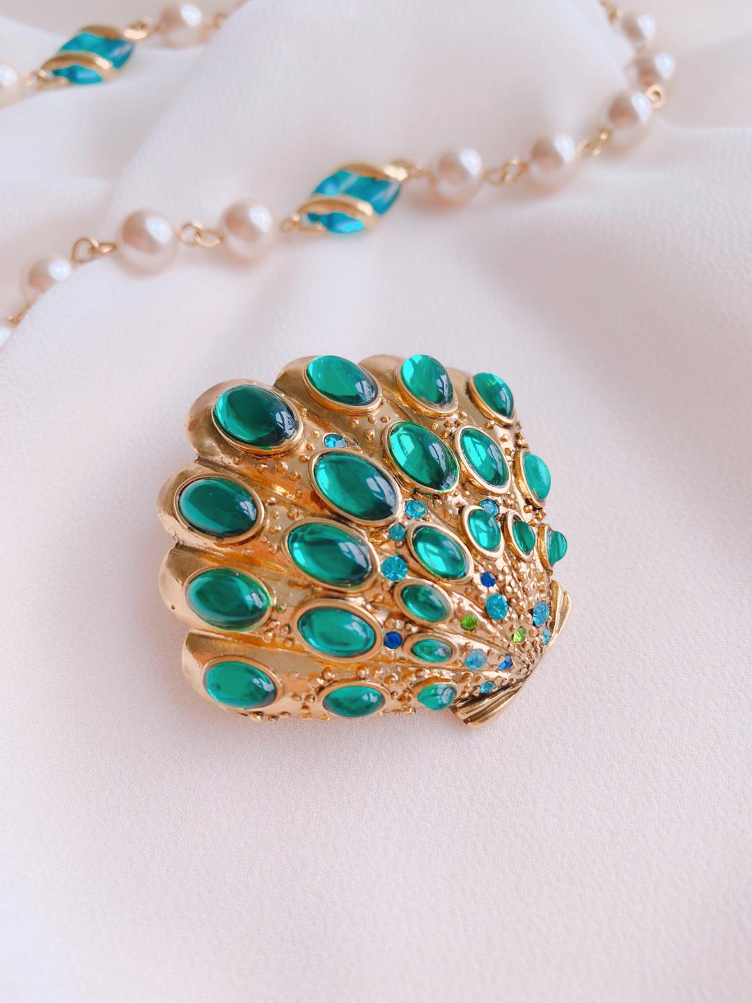 Винтажная брошь MONET в форме половинки раковины морского гребешка достойна стать избранной. Редкой красоты украшение завораживает своим исполнением. Безупречное золотое покрытие раковины не оставляет сомнений в исключительном качестве сплава. Отделка изумрудными и голубыми кабошонами и кристаллами подчеркивает ценность изделия. Подобно каплям они мерцают на створке раковины. Их сочная сапфирово-изумрудная палитра волнует, манит и пробуждает теплые чувства.