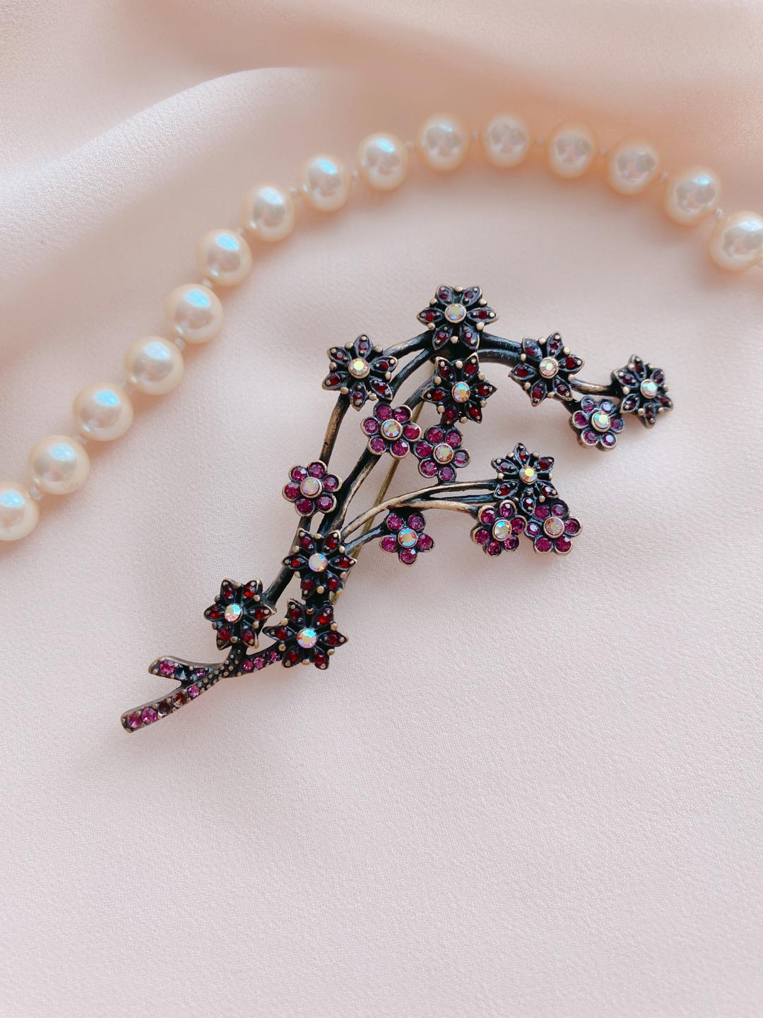 Брошь выполнена в виде веточки, усыпанной мелкими соцветиями. Лепестки образуют яркие малиновые кристаллы. Каждый из них, согласно японским легендам, симолизирует пожелания счастья, удачи, благоденствия, долголетия, радости и мира.Сердцевинки цветов украшают волшебные хрусталлики Aurora Borealis с волнующими румяными переливами. Сами веточки выполнены в цвете античной меди. Подобное цветовое решение не случайно, ведь розовый цвет в Японии является символом пробуждения природы, а сама сакура олицетворяет женскую молодость и красоту.