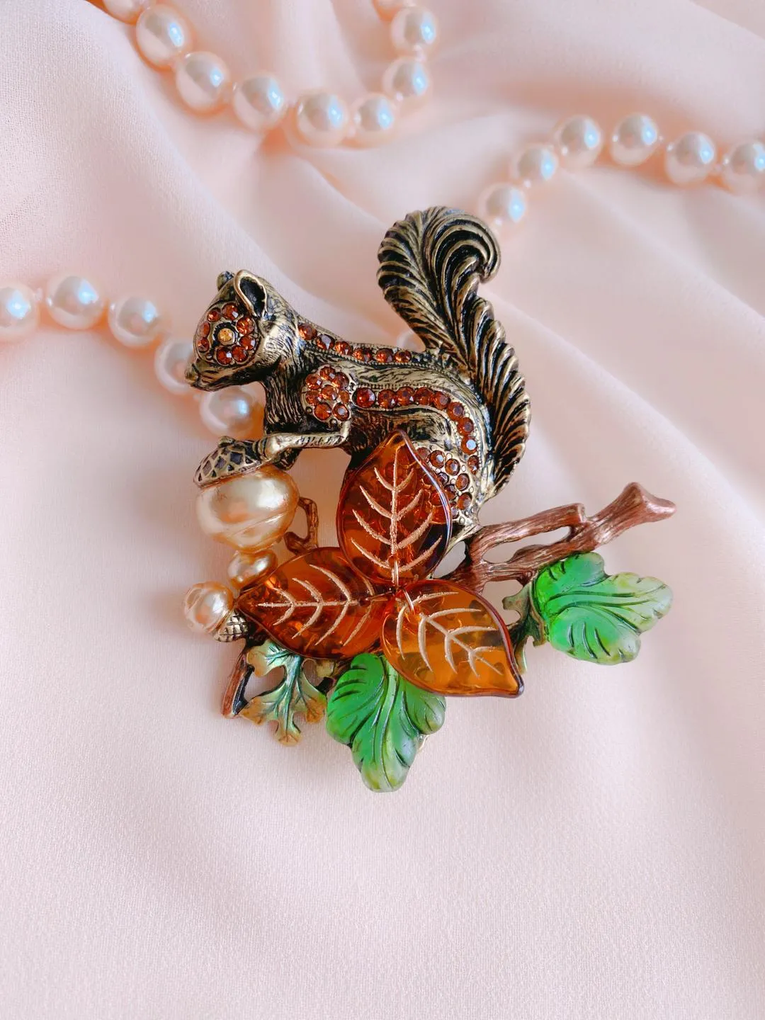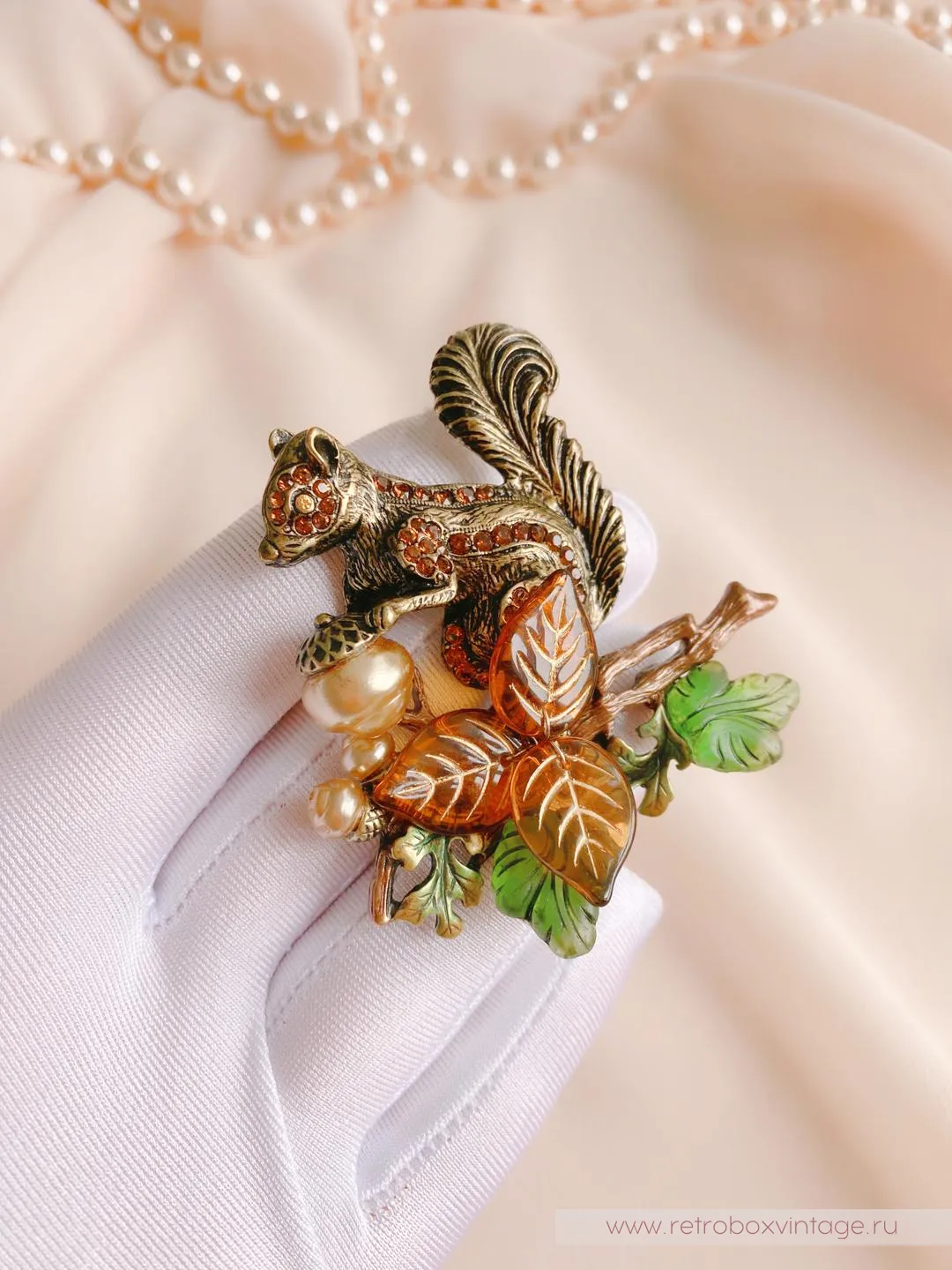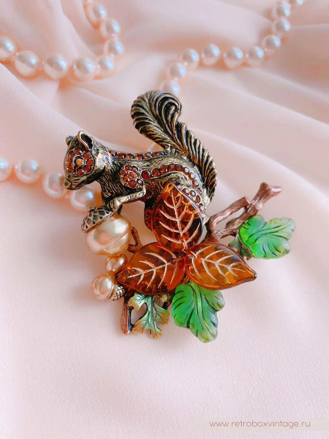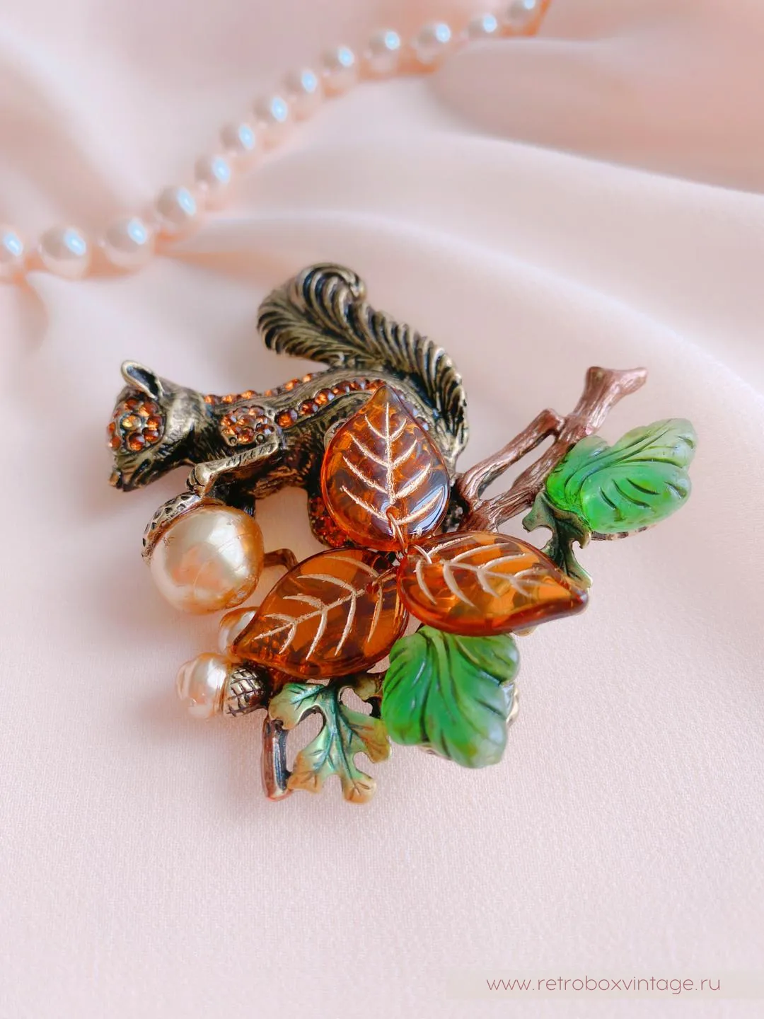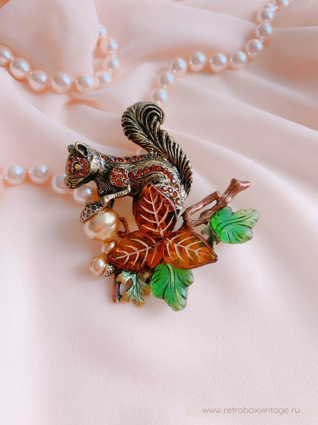Брошь выполнена в популярном винтажном стиле 1940-50х годов. Теплые тона янтарных и нежно-зеленых листьев прекрасно гармонируют с перламутровыми оттенками жемчужных орешков.Тонкая авторская работа видна во всем: в ручной росписи стеклянных элементов, в филигранном исполнении резных листьев и беличьих фигурок, в узорном расположении кристаллов. Кажется, будто стоит взять в руки эти украшения, и белки оживут.