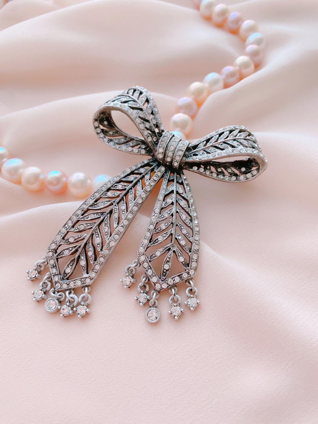 Изящное украшение ручной работы выполнено с любовью к истории и традициям и служит великолепным образцом эпохи, отражающим безупречный вкус и истинно королевское величие. Фирменный сплав марки изготовлен так, что украшение буквально дышит «винтажностью», а при покрытии используется специальная металлическая отделка полированным серебром, что придаёт украшению мягкий серебристый блеск. По всей поверхности бант усыпан небольшими кристаллами, а концы лент украшают изящные подвески-безели, добавляя игривости и легкости столь величественному украшению. Только представьте, как они будут блистать и переливаться, когда на них упадут лучики дневного света!