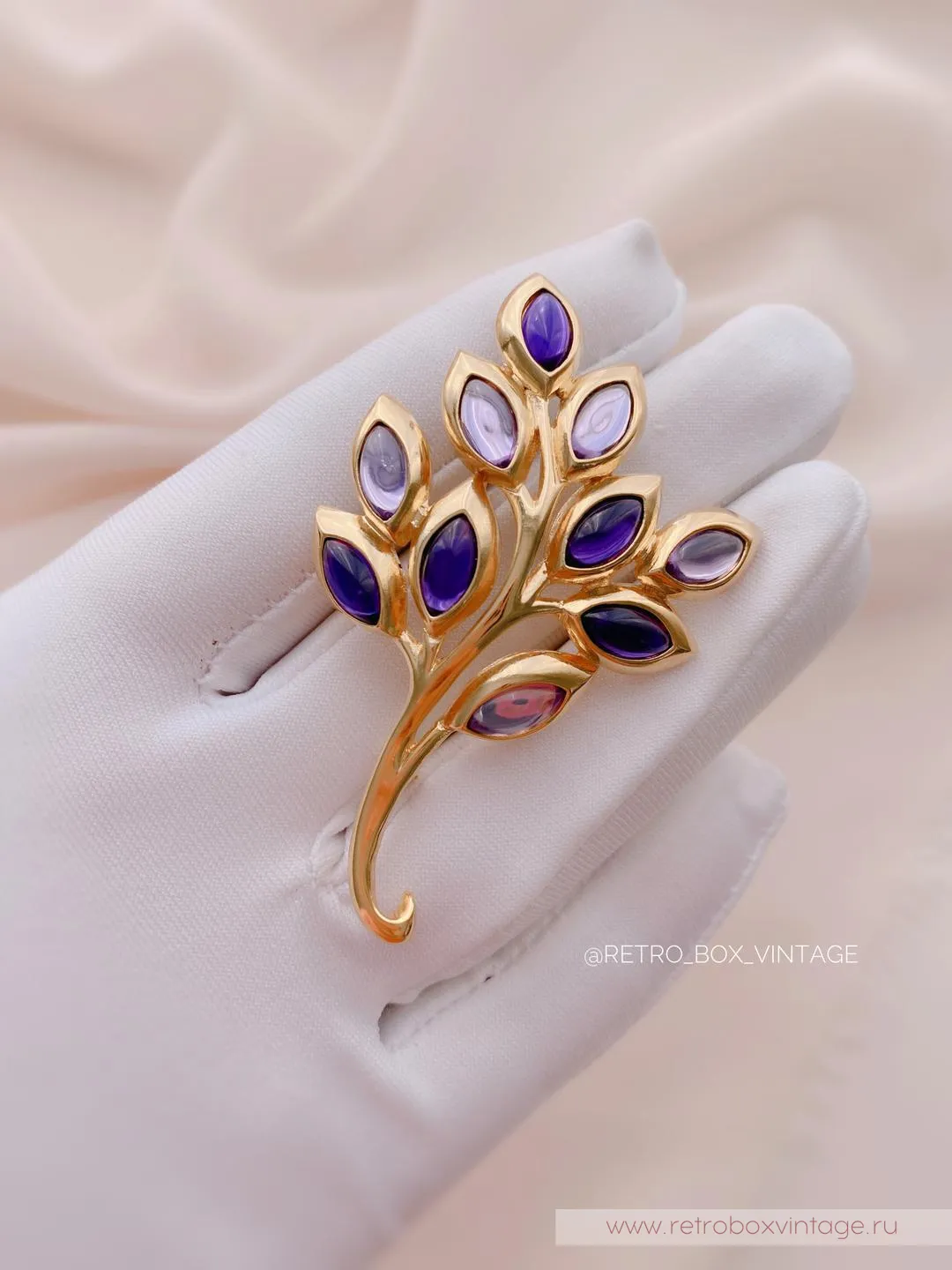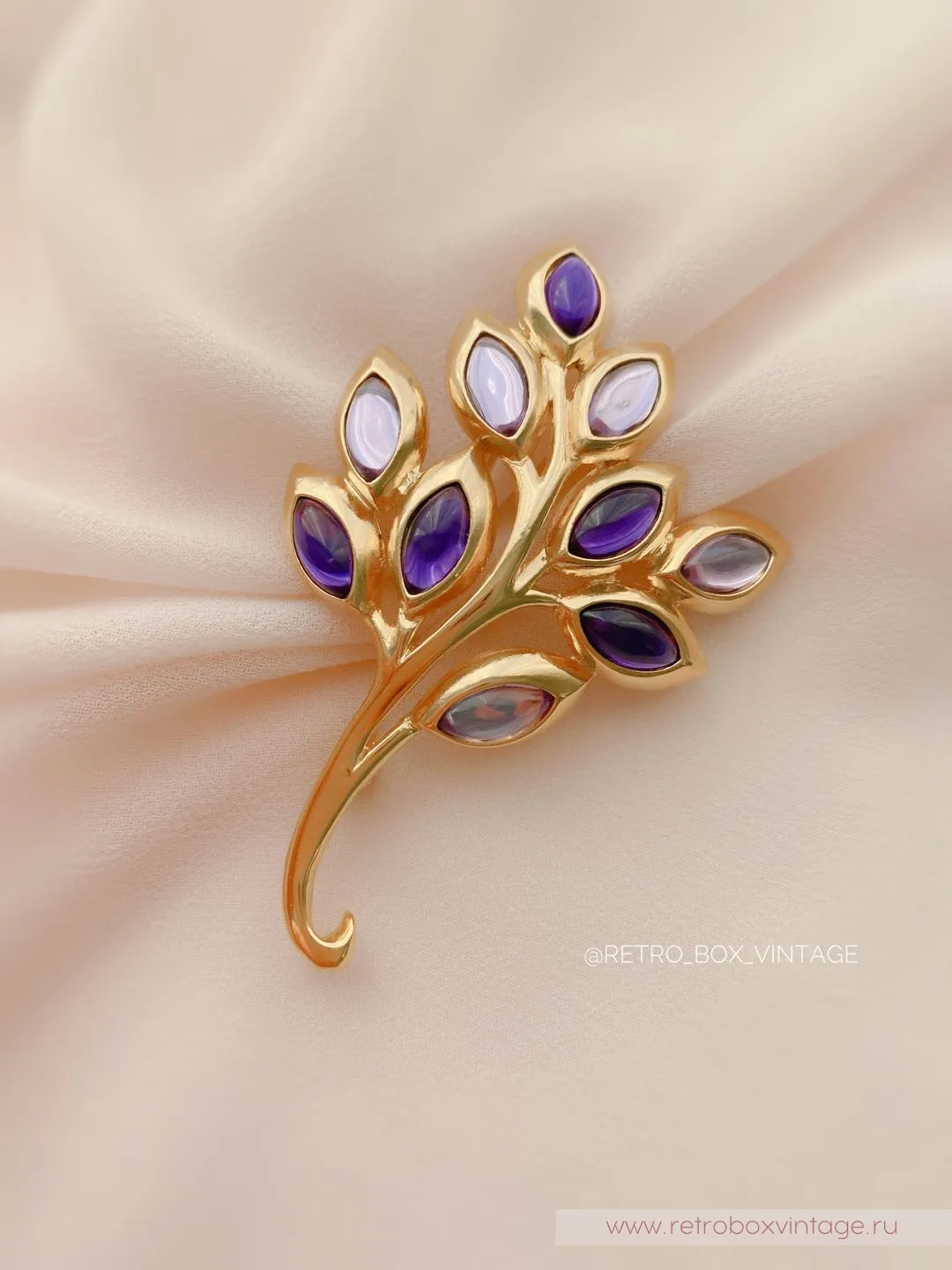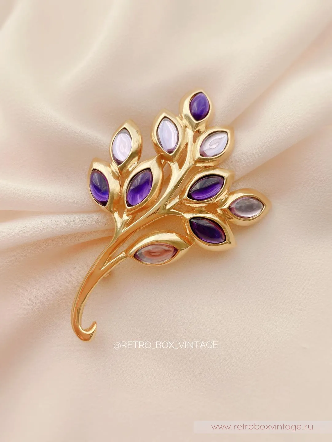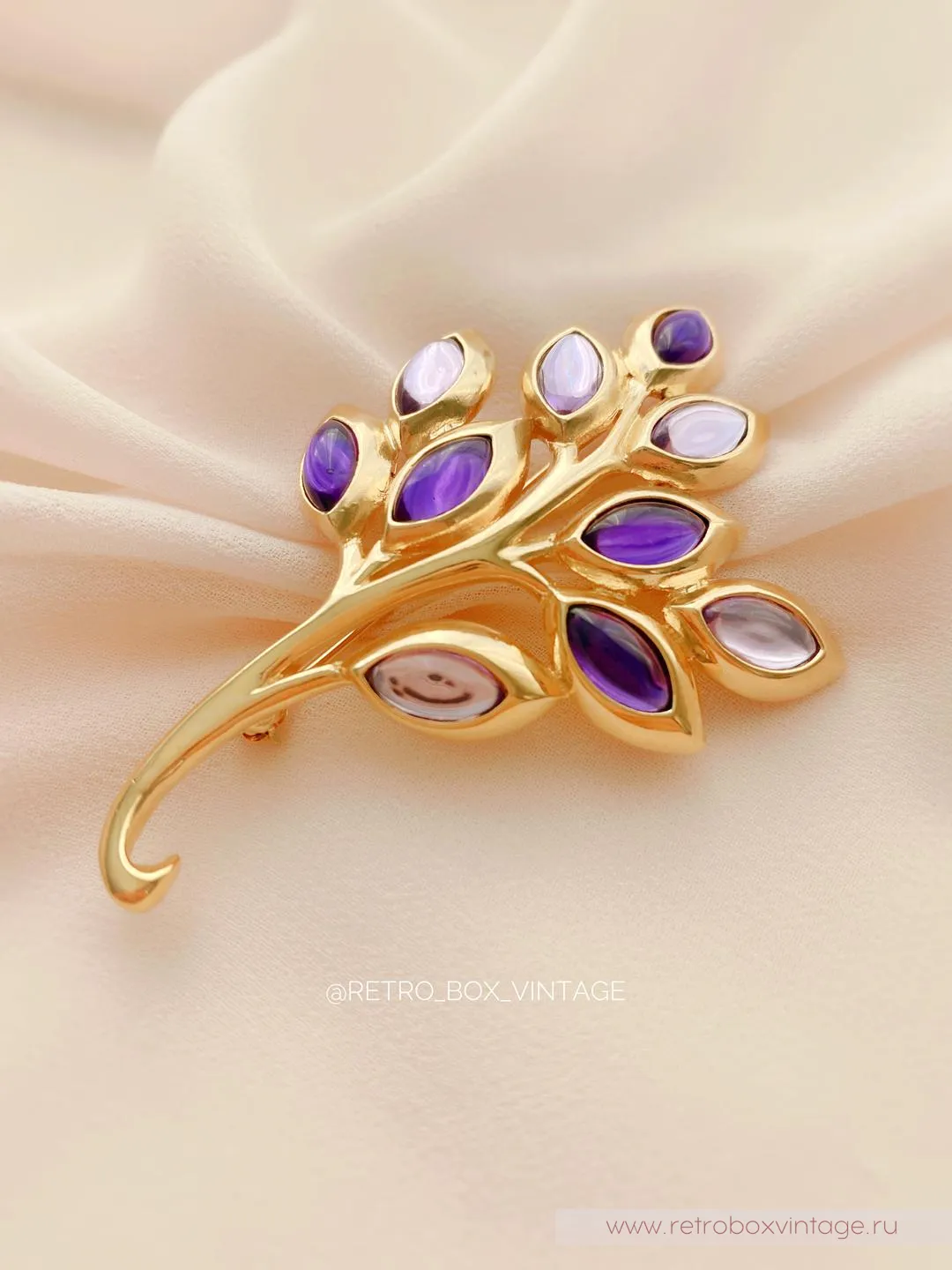 Когда я повстречала эту брошь, то сразу поняла, что она обязательно должна пополнить коллекцию наших находок. Она напоминает и веточку с листвой, и причудливое перо волшебной птицы…Согласно легендам перо жар-птицы – символ вечной красоты, изящества и таинственности. Потухнув, оно превращается в золото и продолжает сиять благородным светом металла. Совсем как эта удивительная брошь! Инкрустированное яркими кабошонами, это перо – само совершенство! Изящное и очень легкое перышко будто случайно выпало из оперения сказочной жар-птицы, чтобы украсить самую искушенную модницу.