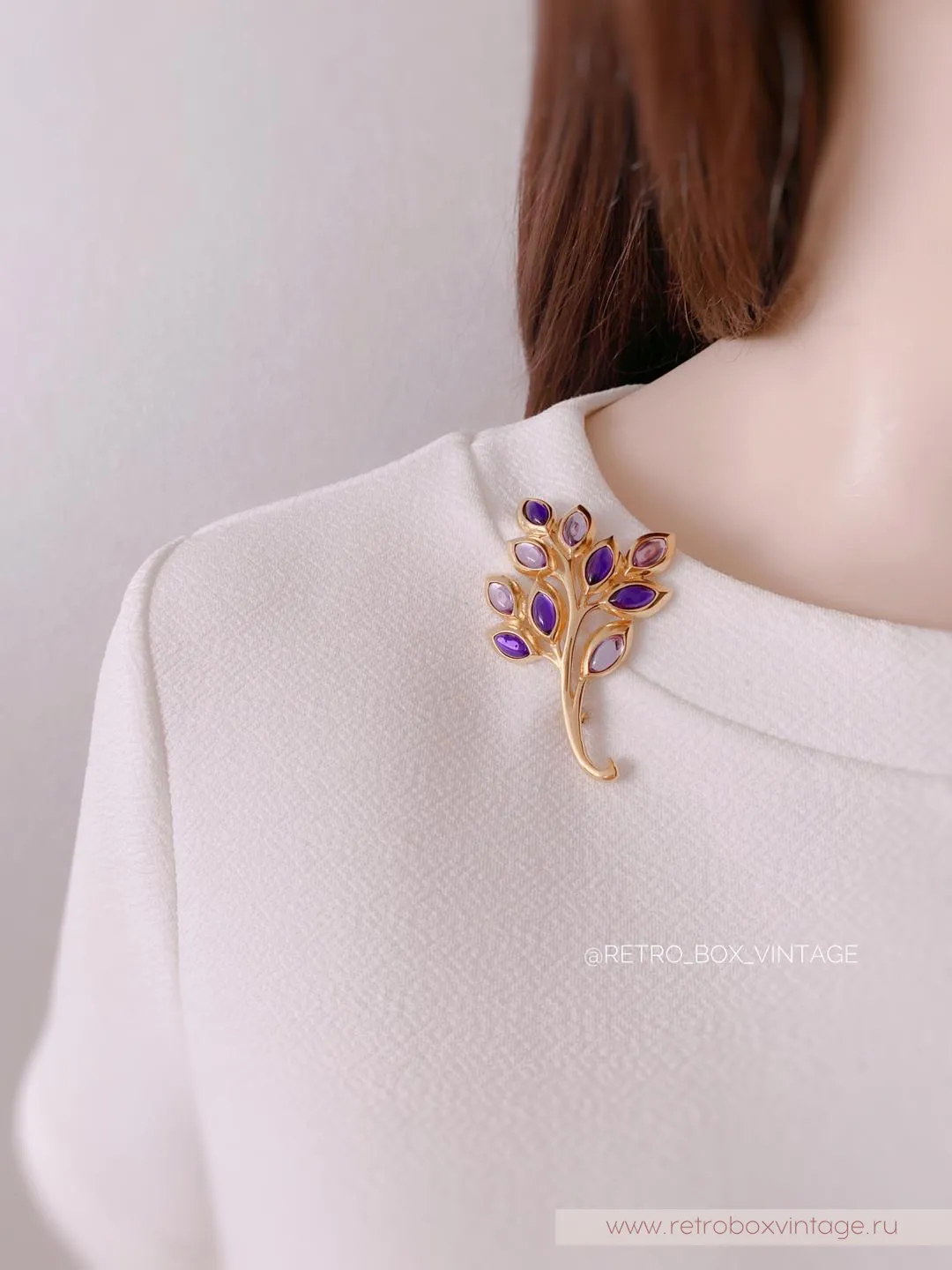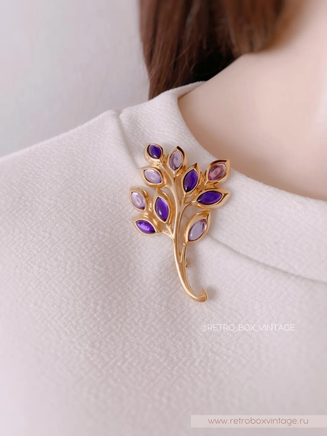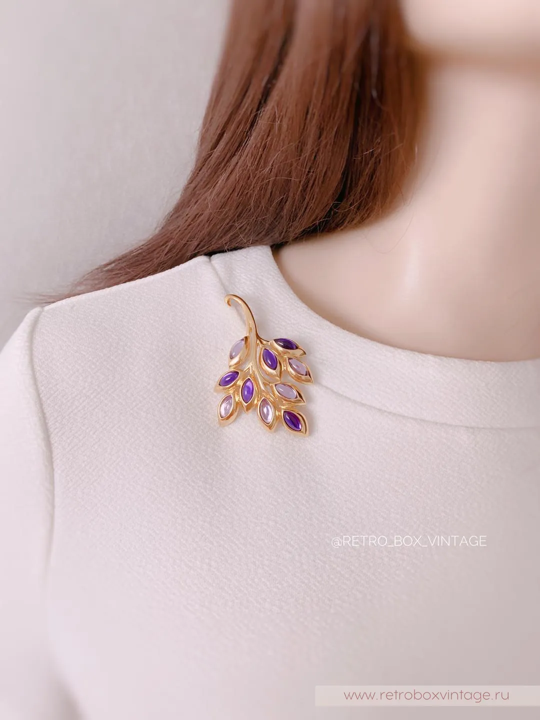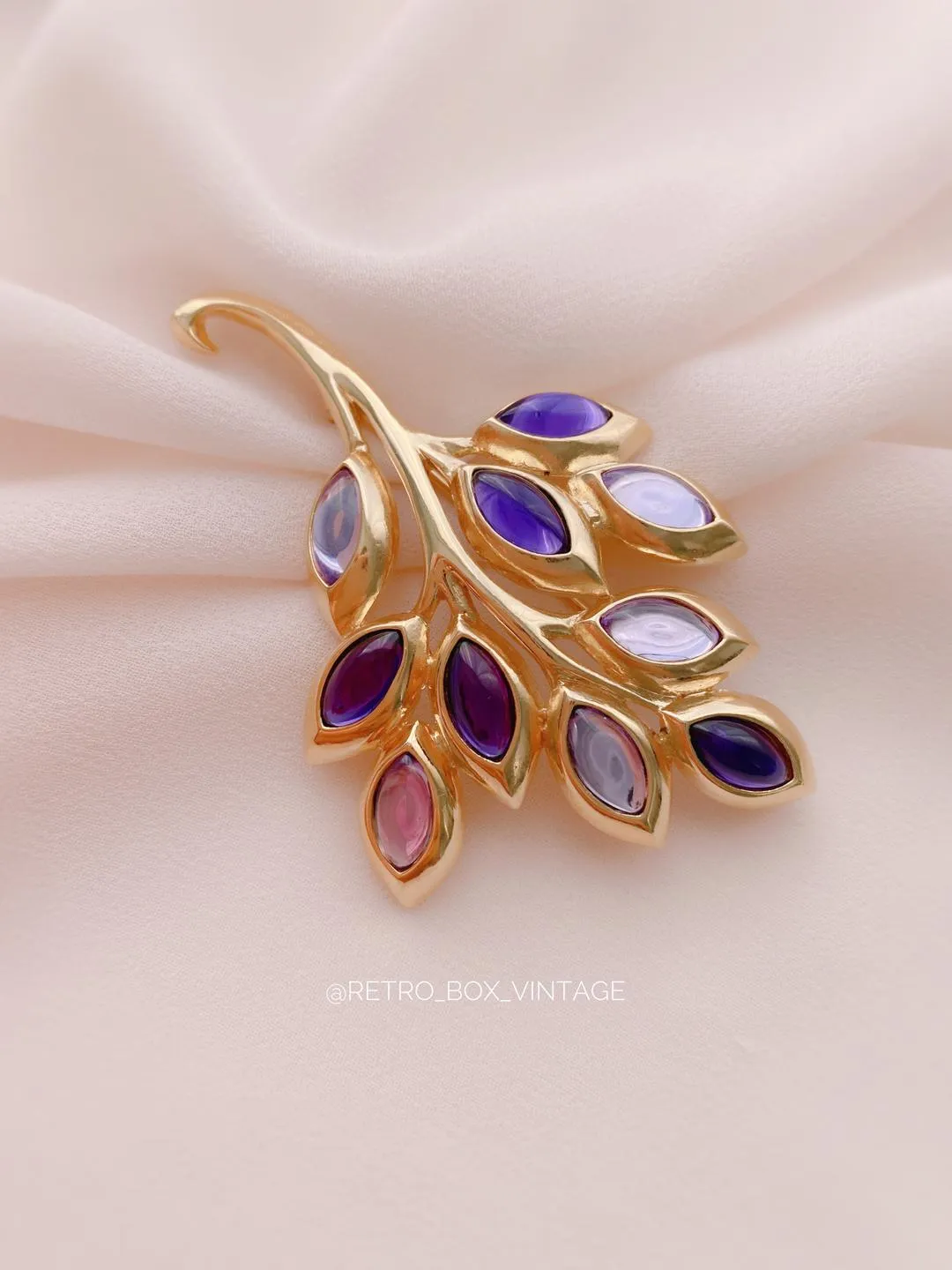 Когда я повстречала эту брошь, то сразу поняла, что она обязательно должна пополнить коллекцию наших находок. Она напоминает и веточку с листвой, и причудливое перо волшебной птицы…Согласно легендам перо жар-птицы – символ вечной красоты, изящества и таинственности. Потухнув, оно превращается в золото и продолжает сиять благородным светом металла. Совсем как эта удивительная брошь! Инкрустированное яркими кабошонами, это перо – само совершенство! Изящное и очень легкое перышко будто случайно выпало из оперения сказочной жар-птицы, чтобы украсить самую искушенную модницу.