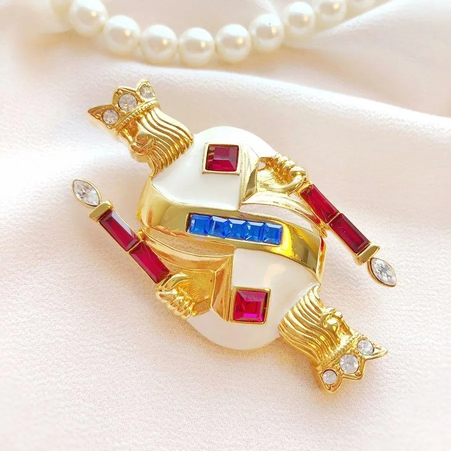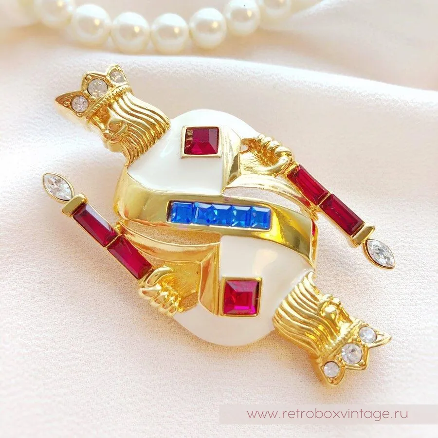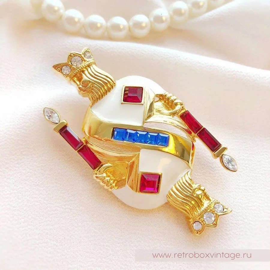 Брошь напоминает собой карточного короля. Мантия густо покрыта эмалями сливочных тонов. Кристаллы цвета яркого синего сапфира и рубинов расставляют акценты.