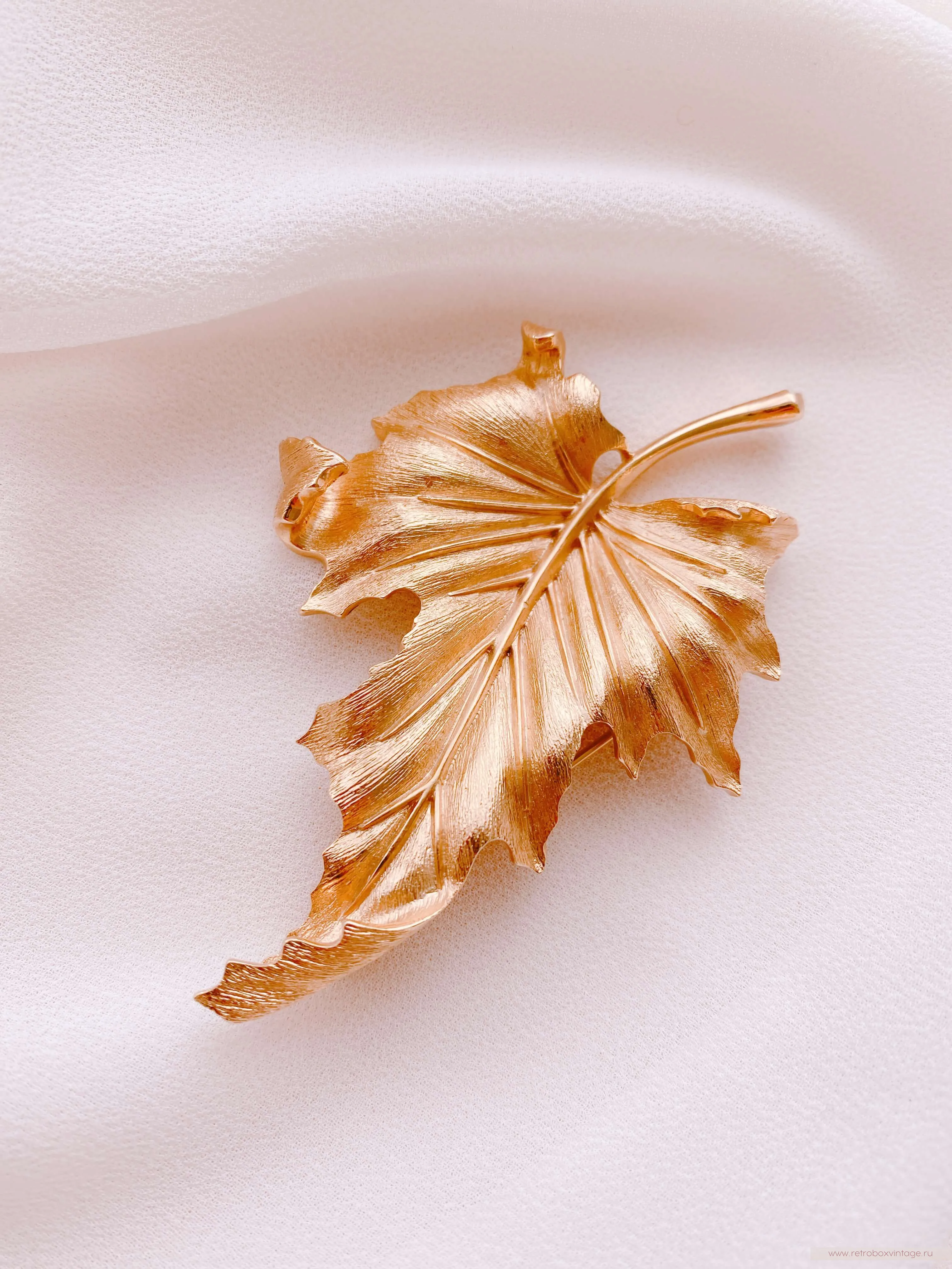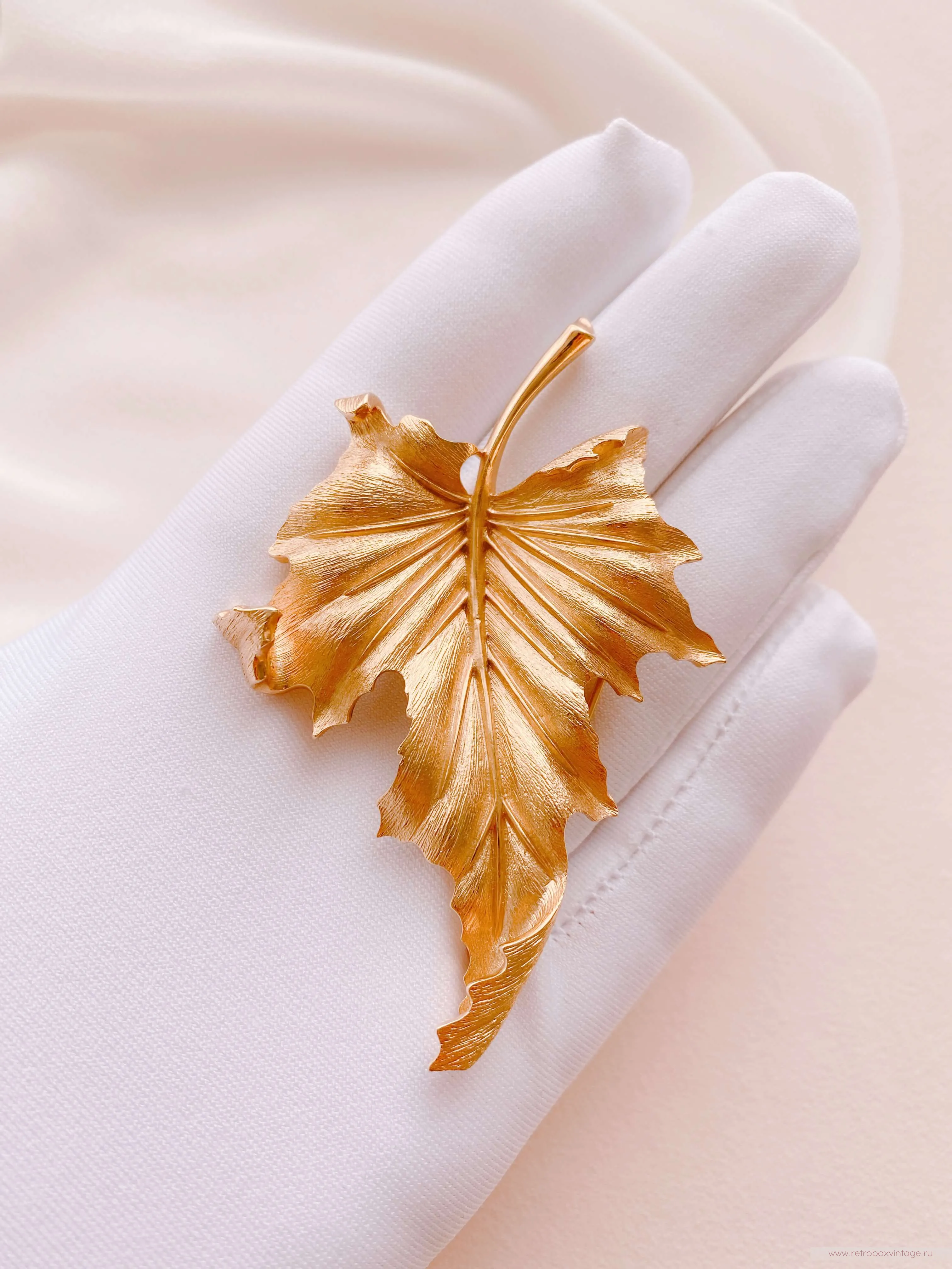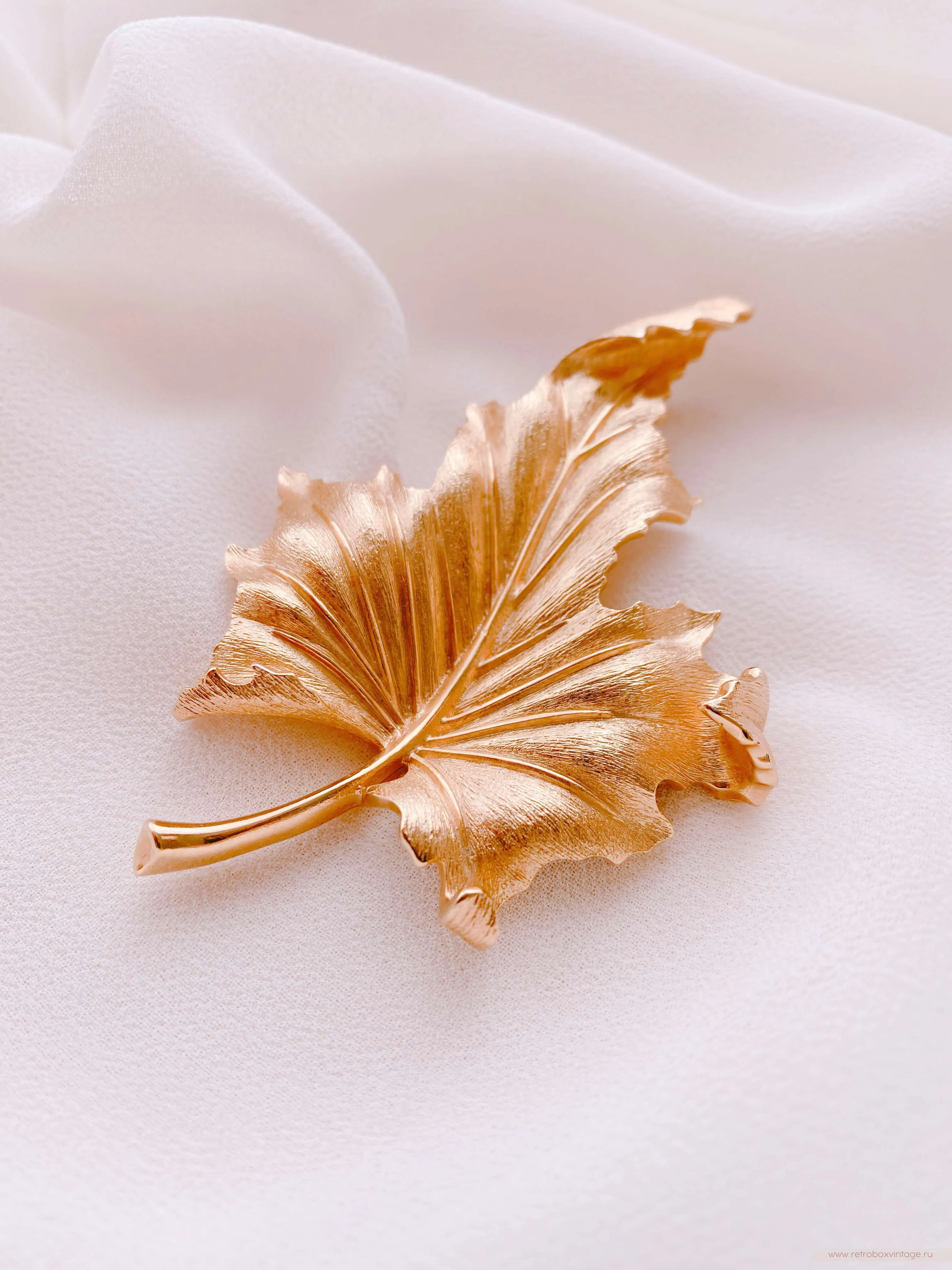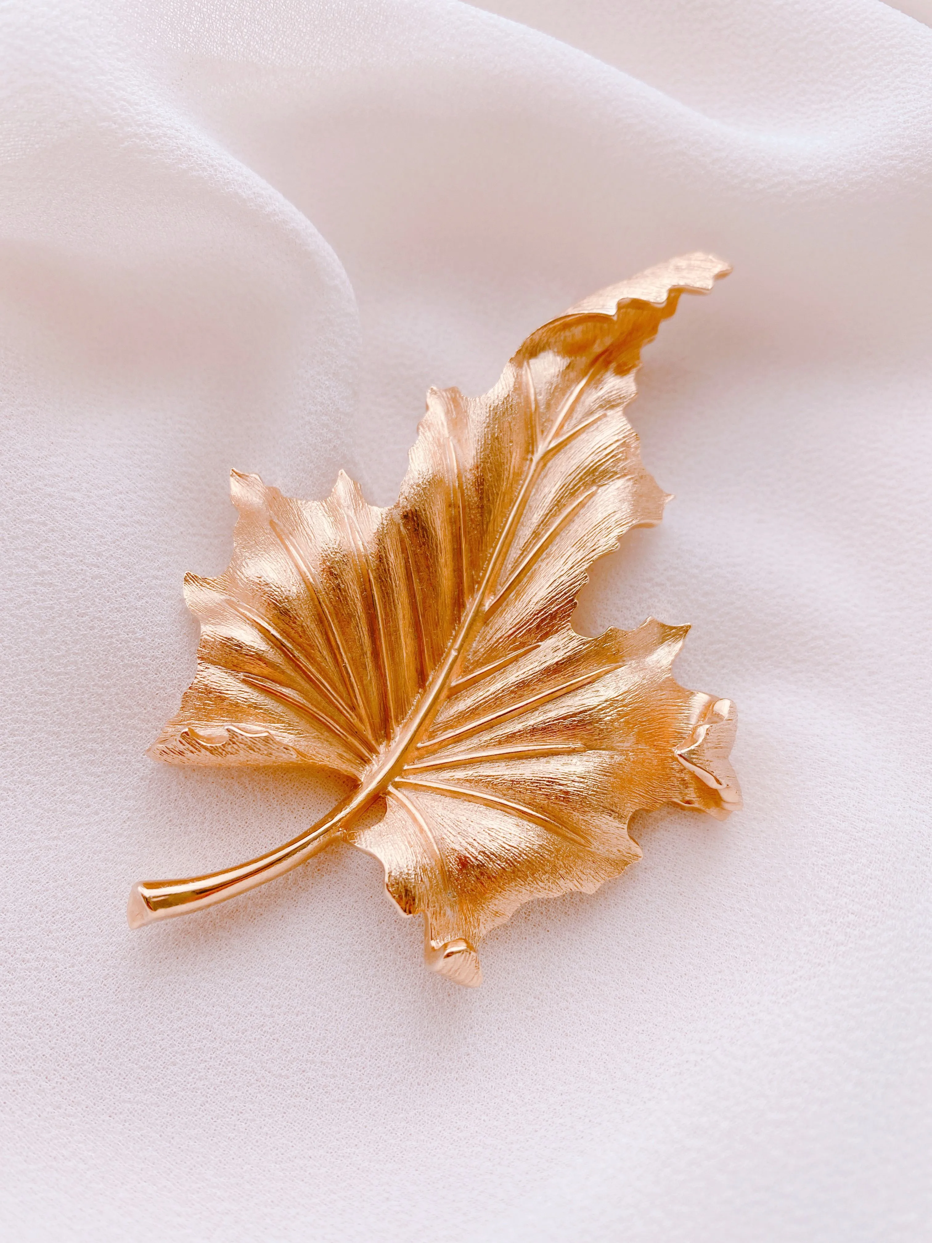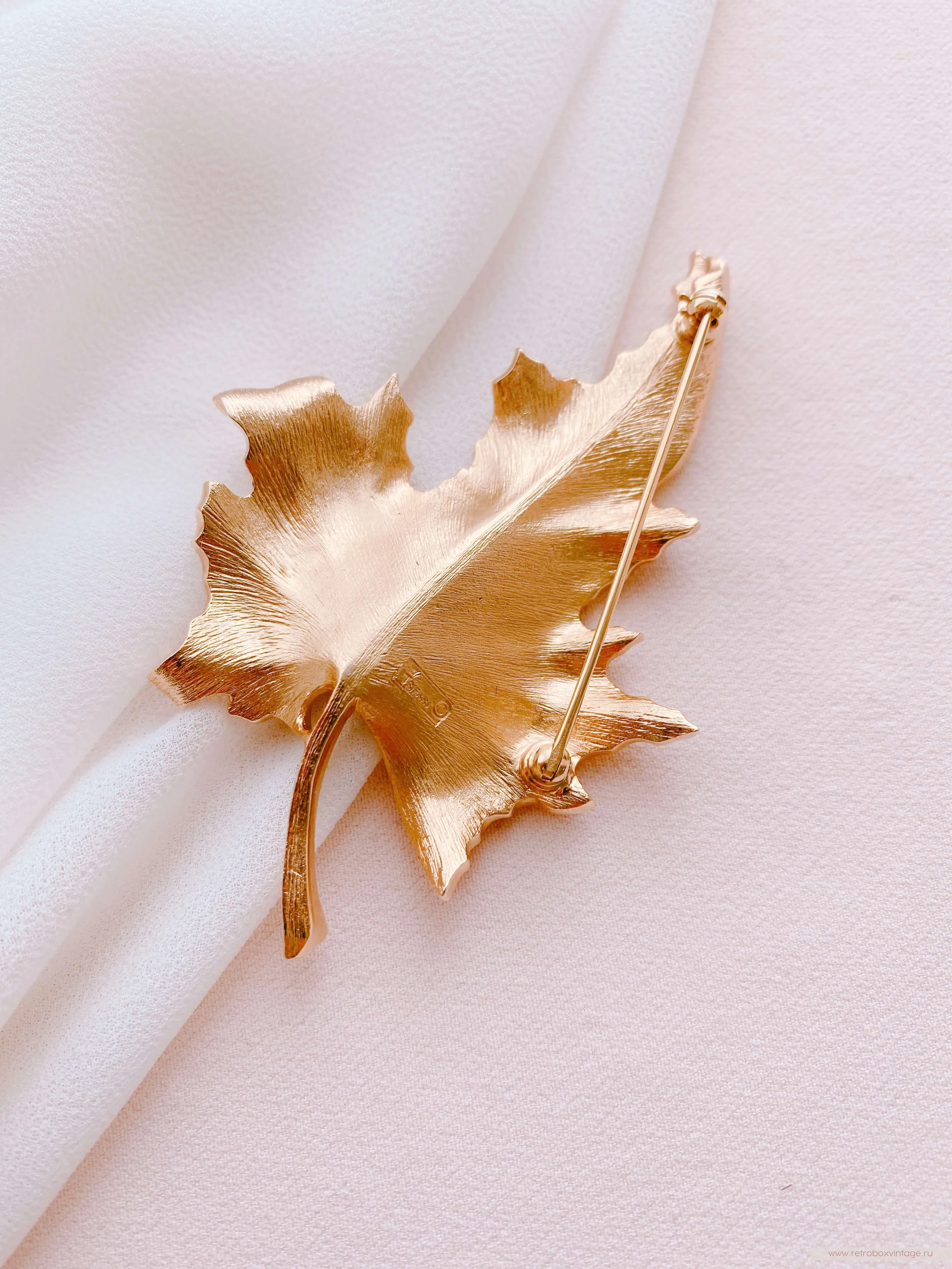 Золотая осень — одно из самых волшебных и прекрасных времён года. Её обаяние привлекает взоры и вдохновляет многих. Осень с её уникальными палитрами цветов, теплыми днями и прохладными ночами, приносит с собой пленительную красоту и ощущение волшебства. Взгляните на эту дизайнерскую брошь в виде золотого осеннего листа клёна – ну неужели он не прекрасен? – сколько красок и оттенков, сколько лёгкости и воздушности! Такая брошь станет великолепным символом осени в вашем гардеробе, а классический стиль её выполнения позволит примерить её с любым нарядом и остаться на высоте в любой обстановке.Уникальное дизайнерское украшение будет цениться во все времена, ведь оно богато не только своей символикой, но и непревзойдённым качеством, о котором в мире бижутерного искусства ходят легенды. Эта брошь выполнена из известного сплава трифаниума, который запатентован компанией Trifari и до сих пор не имеет аналогов в производстве. Волшебство этого металла заключается в том, что он со временем совсем не окислялся и не меняет свой первоначальный цвет и блеск. Благодаря этому все украшения из него сохранили свою первоначальную привлекательность и так ценятся среди коллекционеров и любителей винтажной бижутерии.