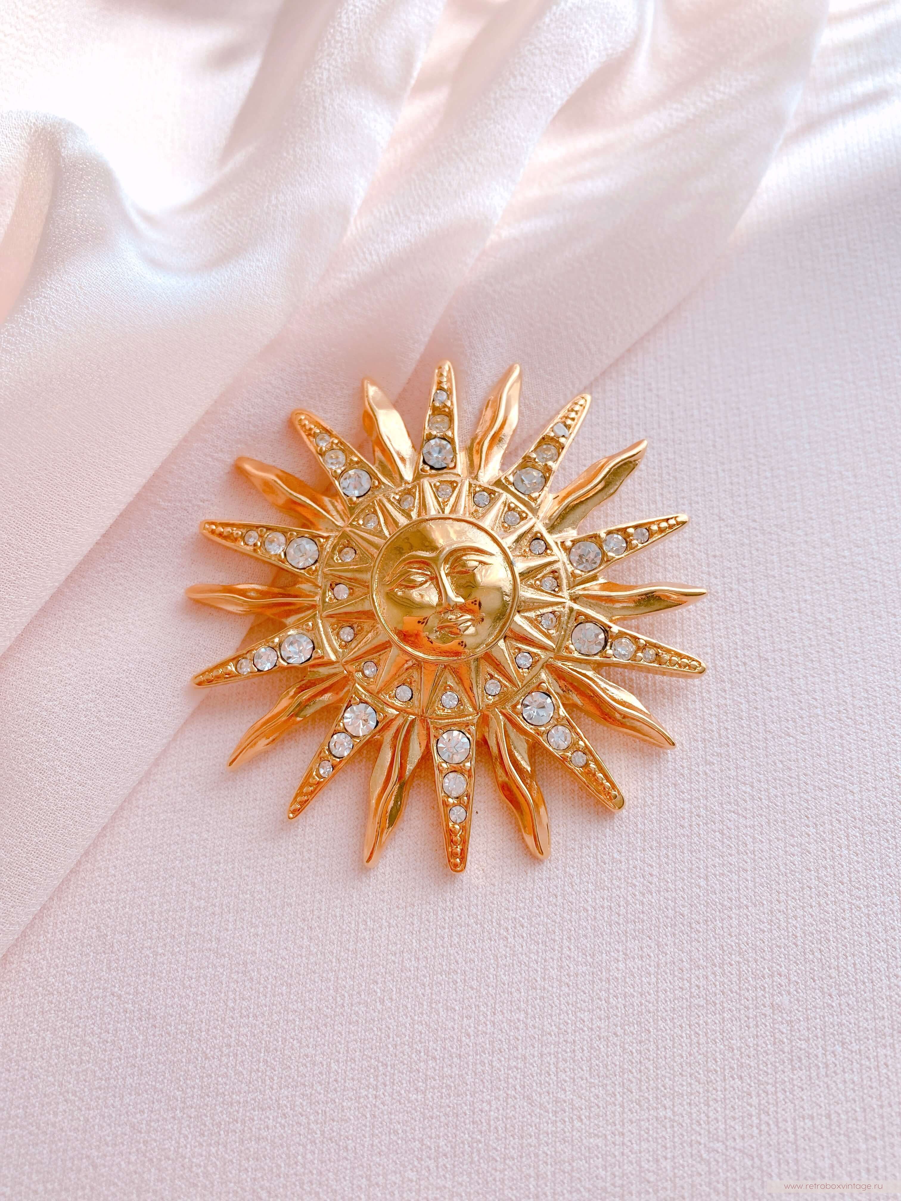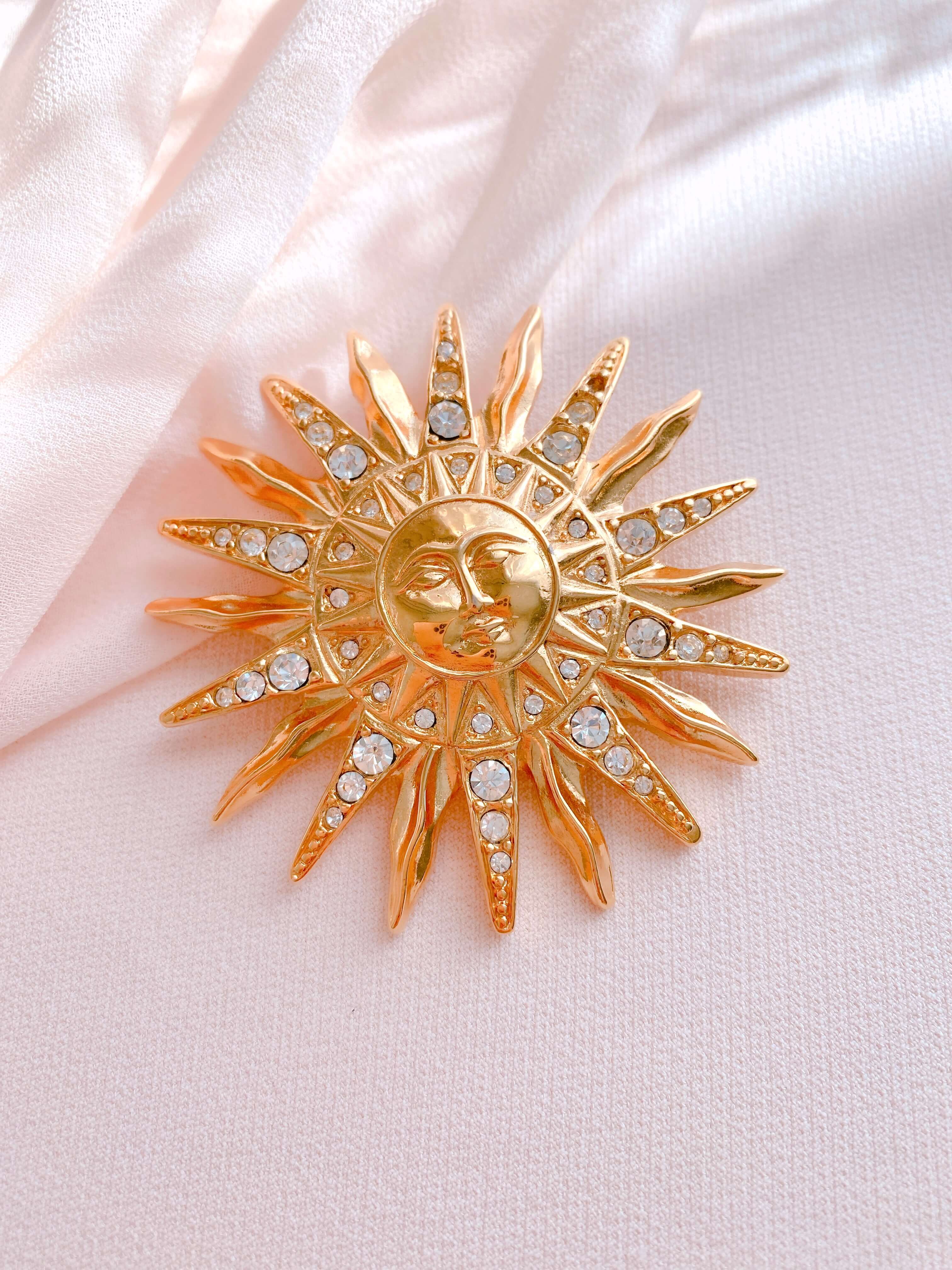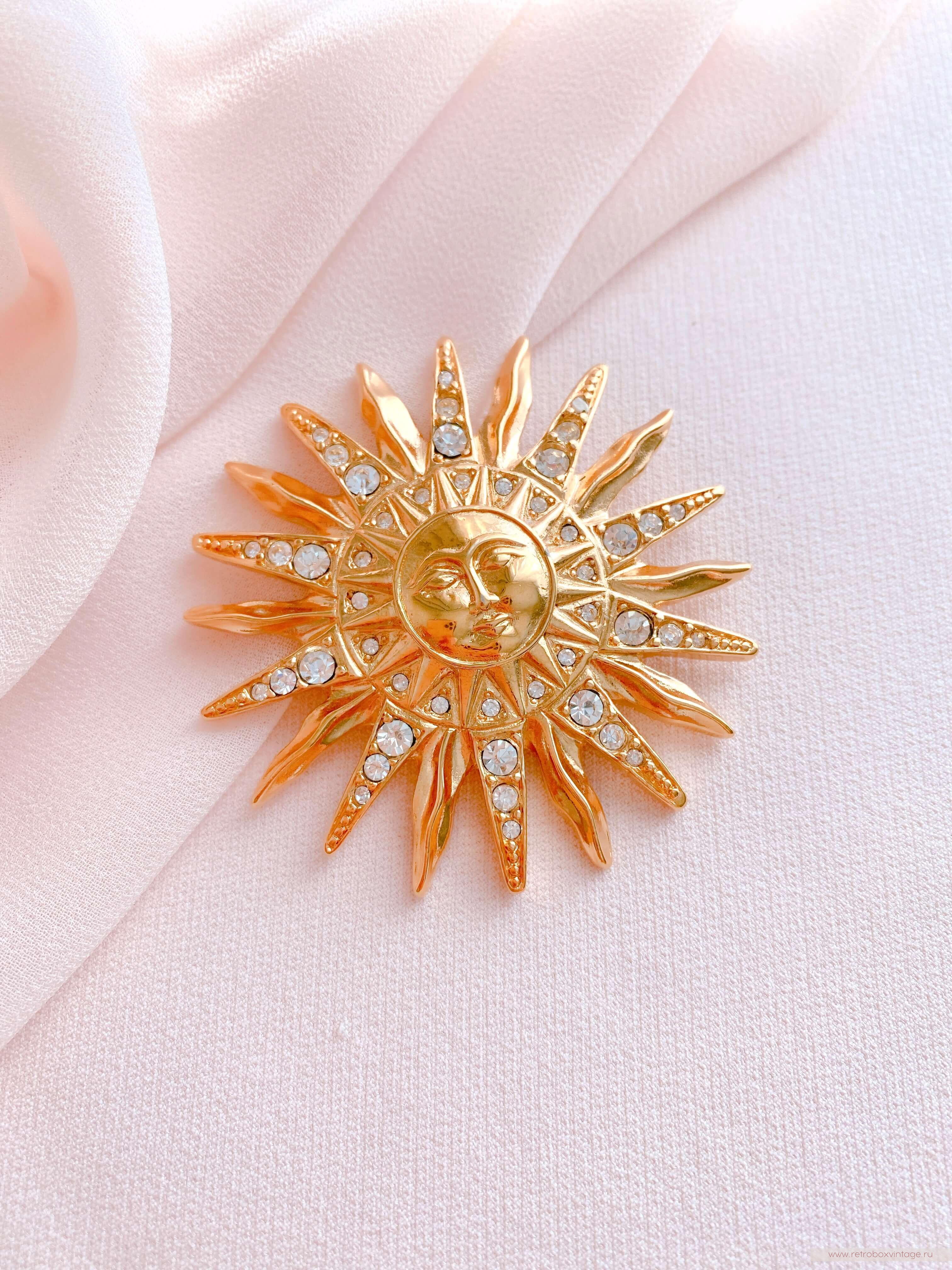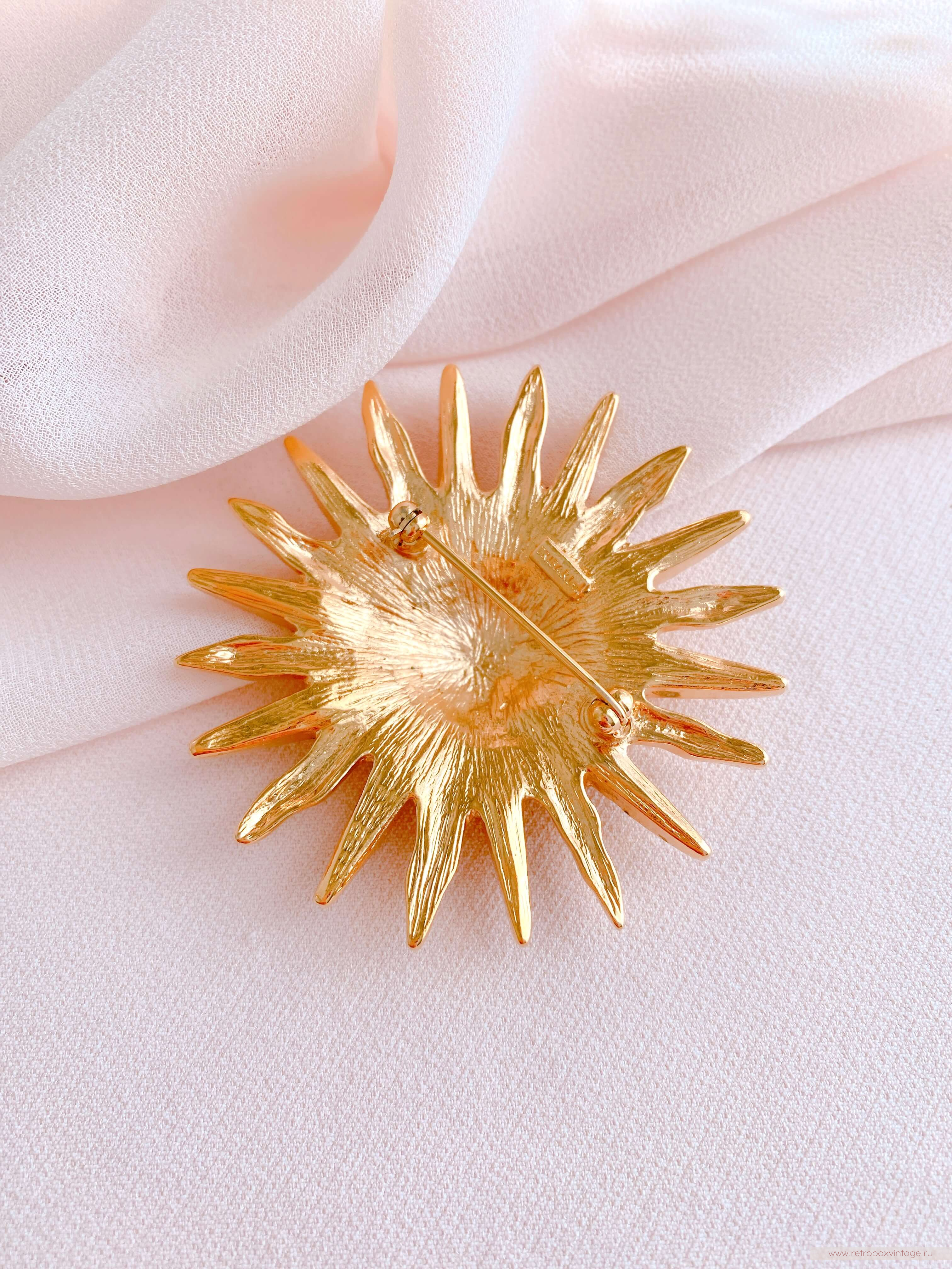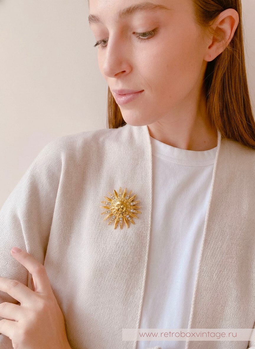 Увидев эту брошь впервые, можно подумать, что перед Вами та самая искра, воплотившаяся в драгоценный лик. Золотое солнце с живым, тёплым лицом, лучи которого мягко мерцают прозрачными кристаллами, словно капельками росы, поцелованными рассветом. В нём нет холода — оно светится изнутри той самой тихой магией, что заставляет замедлиться и просто любоваться.