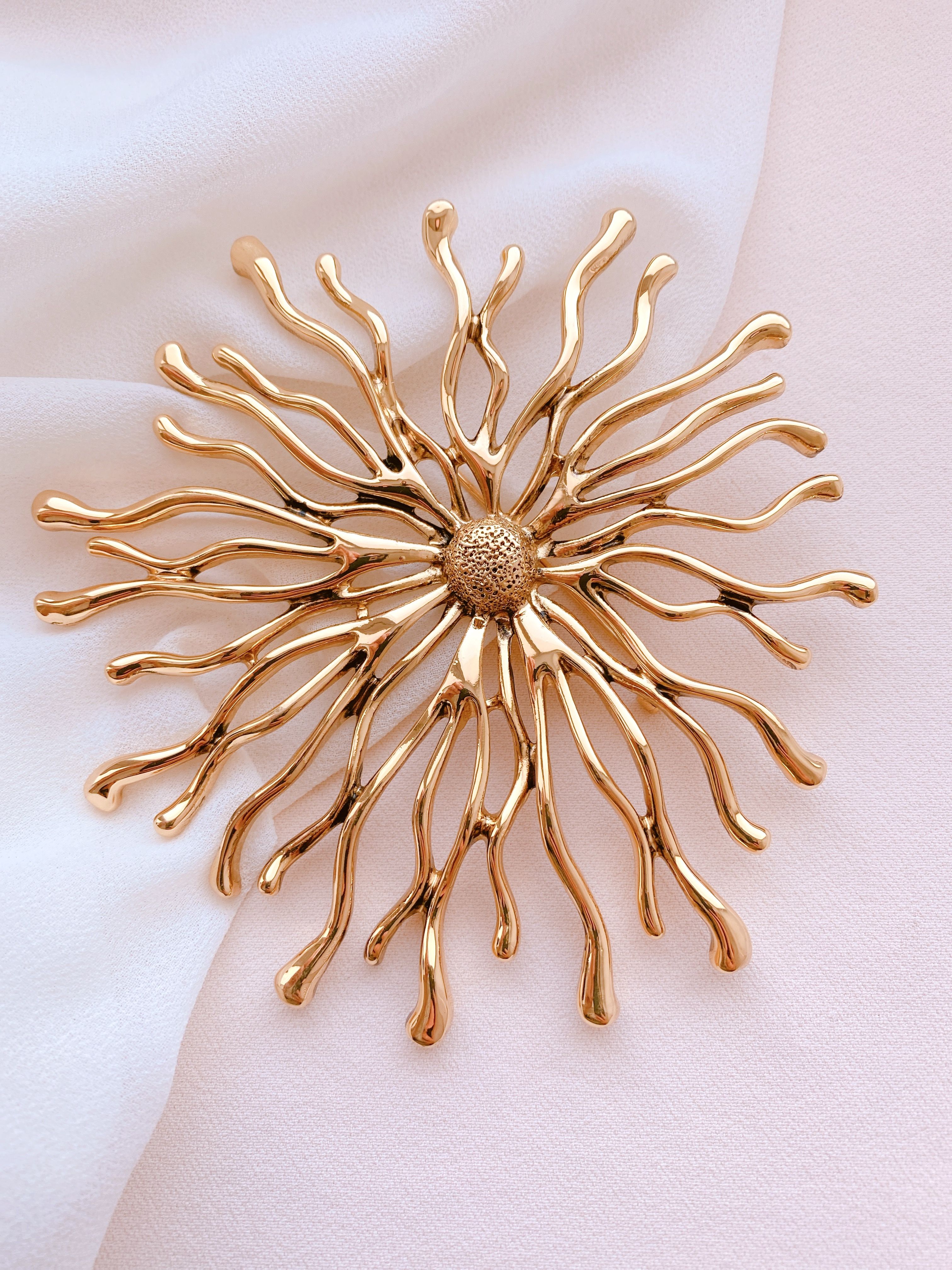 Форма броши напоминает одновременно и цветок, и взрыв фейерверка, и сверкающую звезду. Это создает ощущение динамики, праздничности и волшебства. Солнечные лучи, расходящиеся от центра, символизируют жизненную силу, энергию и оптимизм. Солнце - один из самых древних и почитаемых символов в мировой культуре, олицетворяющий собой свет, тепло, процветание.